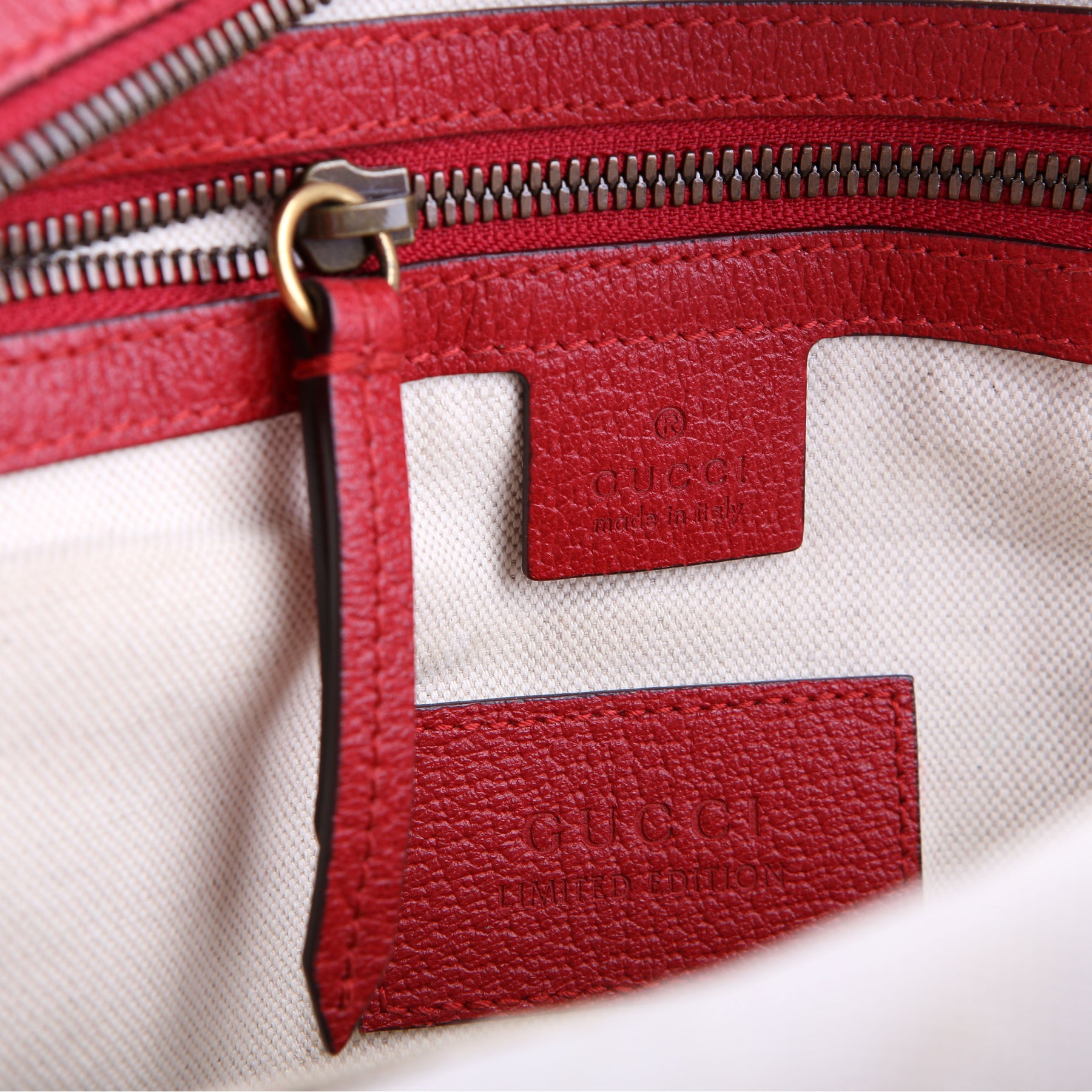 Interior: The interior has ink stains throughout and it features two open pockets and one zip closure pocket.