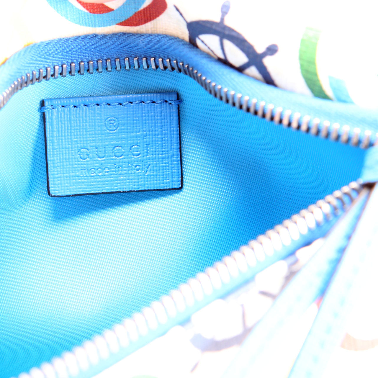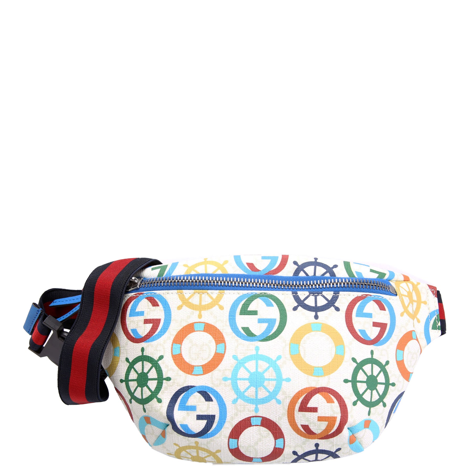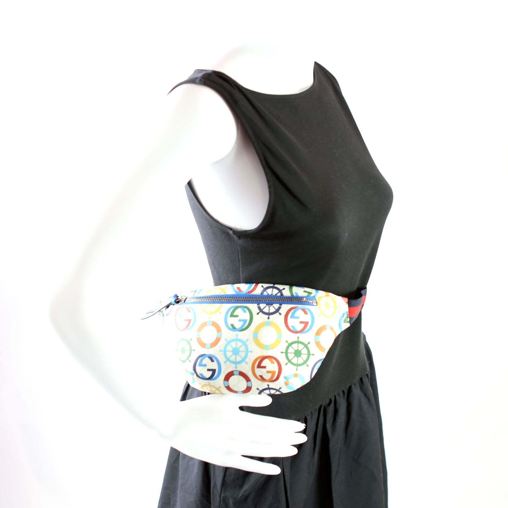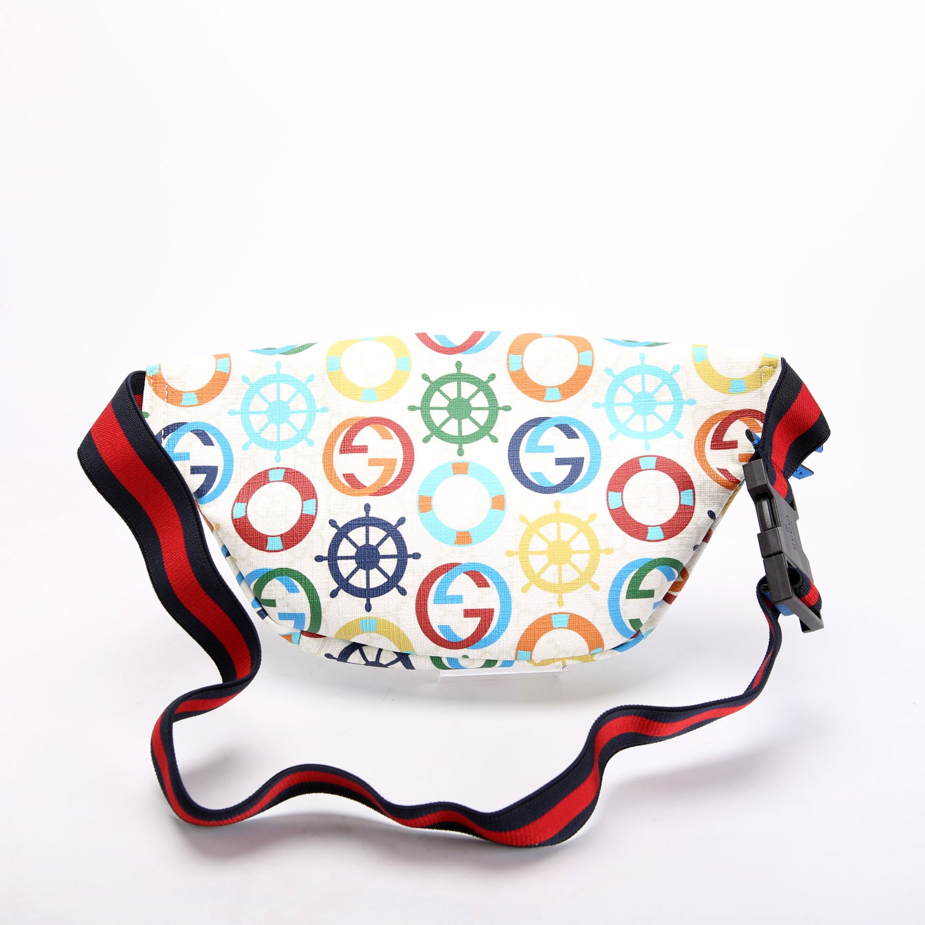 This pre-owned Gucci Nautical Belt Bag is guaranteed 100% authentic. The exterior is in the classic Gucci Coated Canvas.
