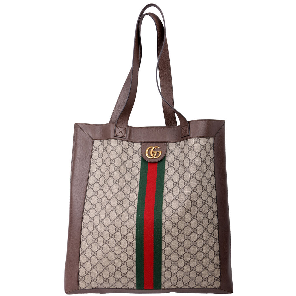 This pre-owned Gucci Ophidia Soft GG Supreme Large Tote is guaranteed 100% authentic. The exterior is in the classic Gucci GG Supreme coated canvas.