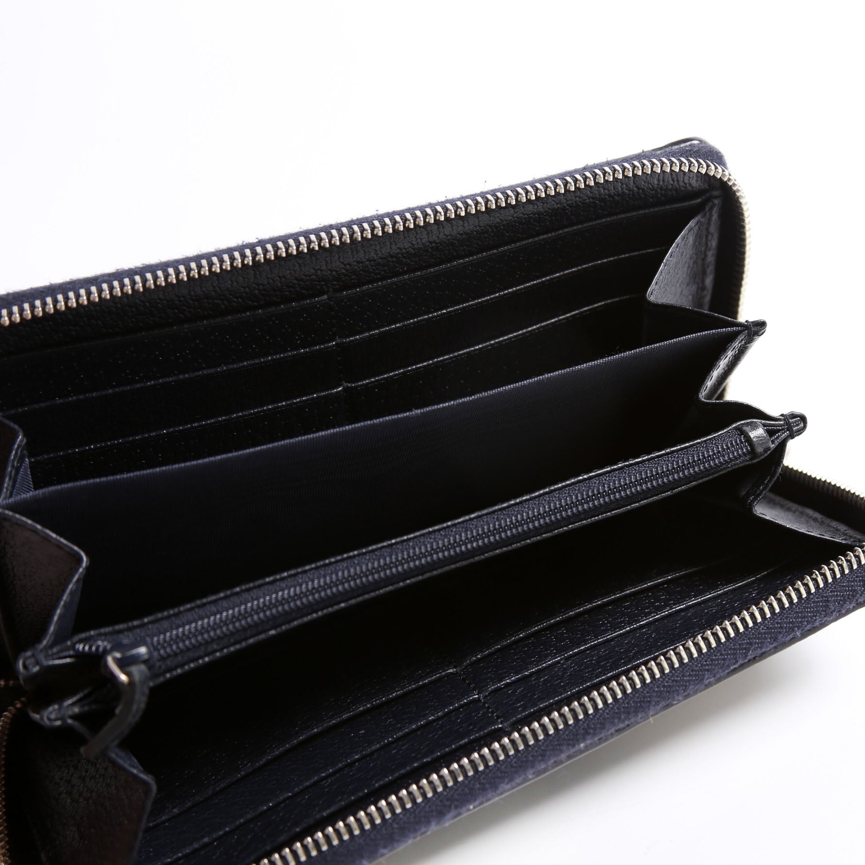 Interior: The interior is free of wear and features twelve card slots, three bill slots, and one zip closure coin pouch.
