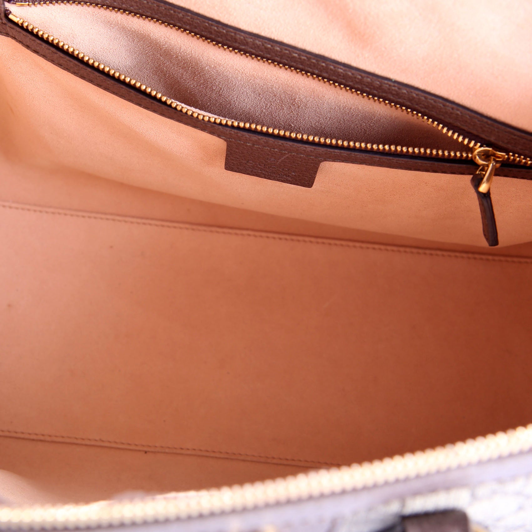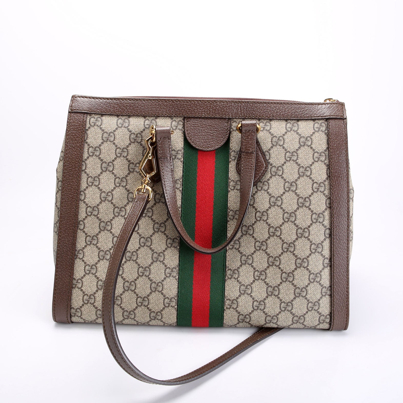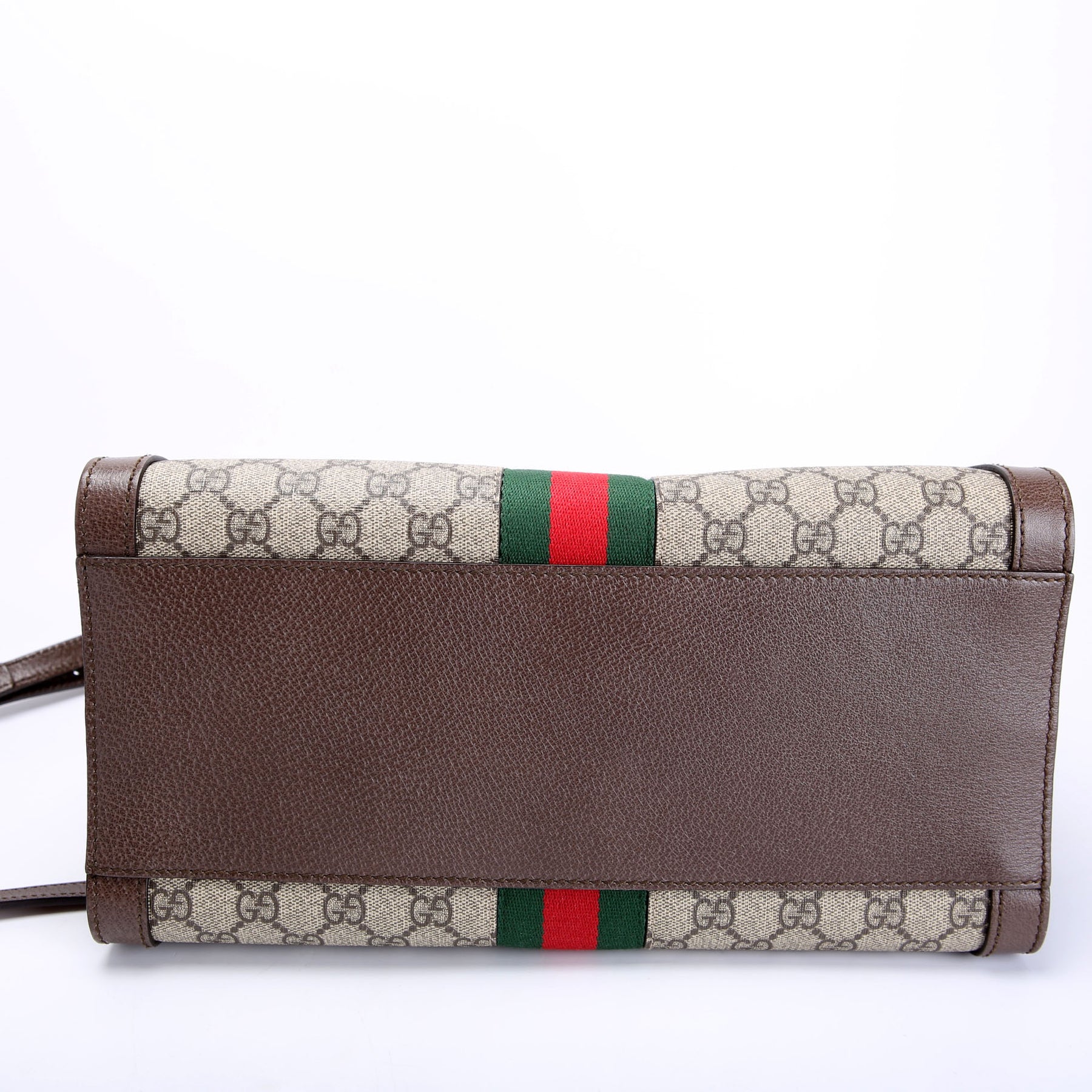 This pre-owned Gucci Ophidia GG Medium Tote is guaranteed 100% authentic. The exterior is in the classic Gucci GG Supreme coated canvas.