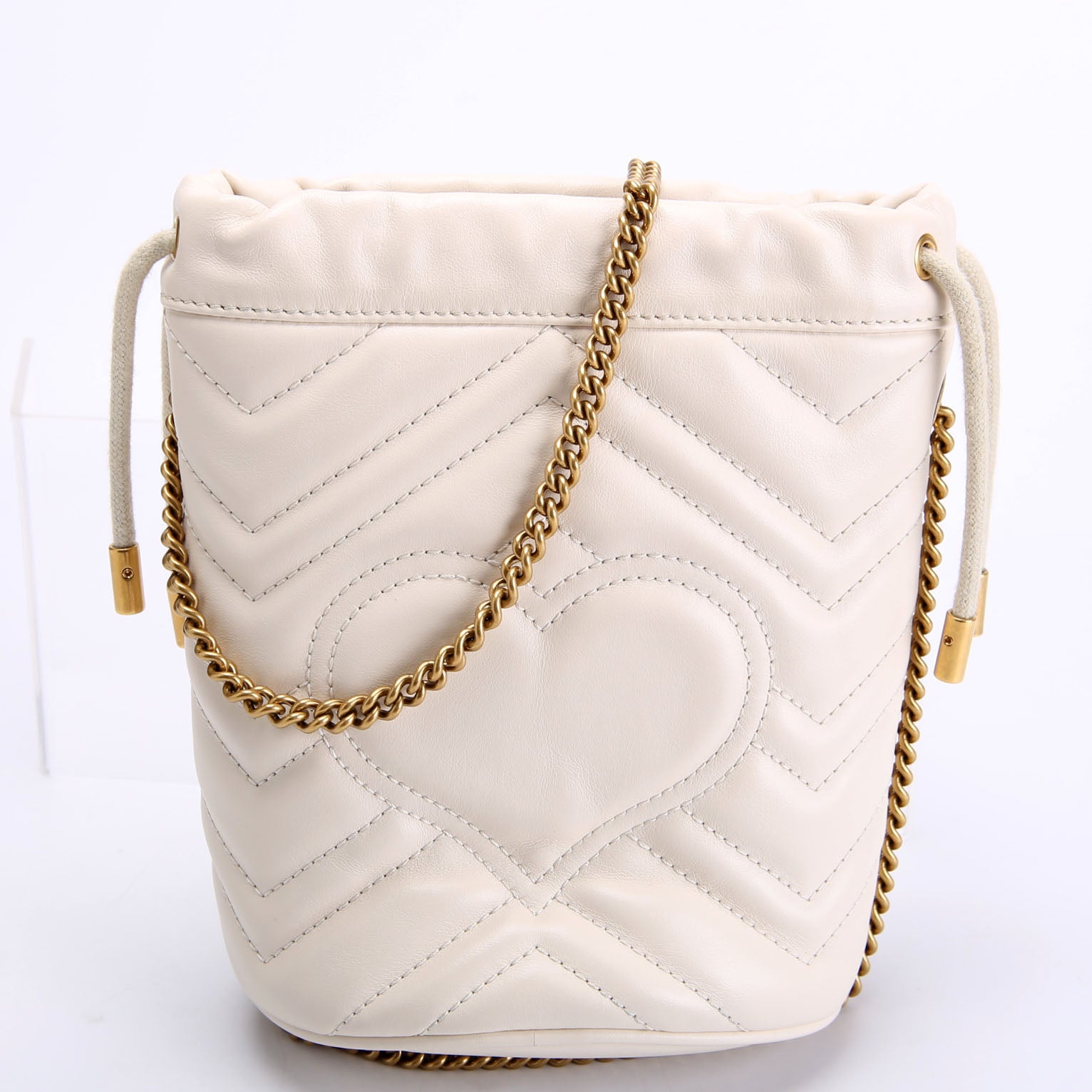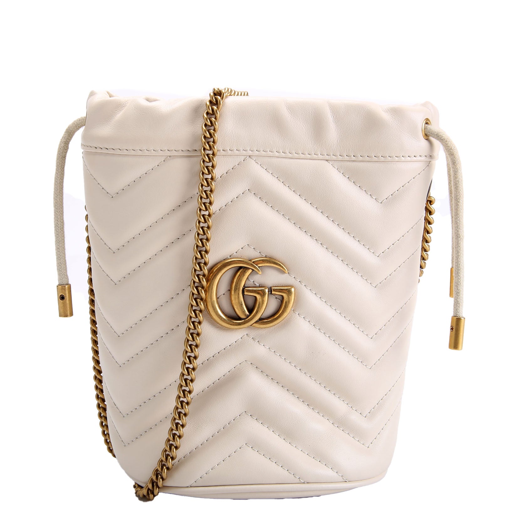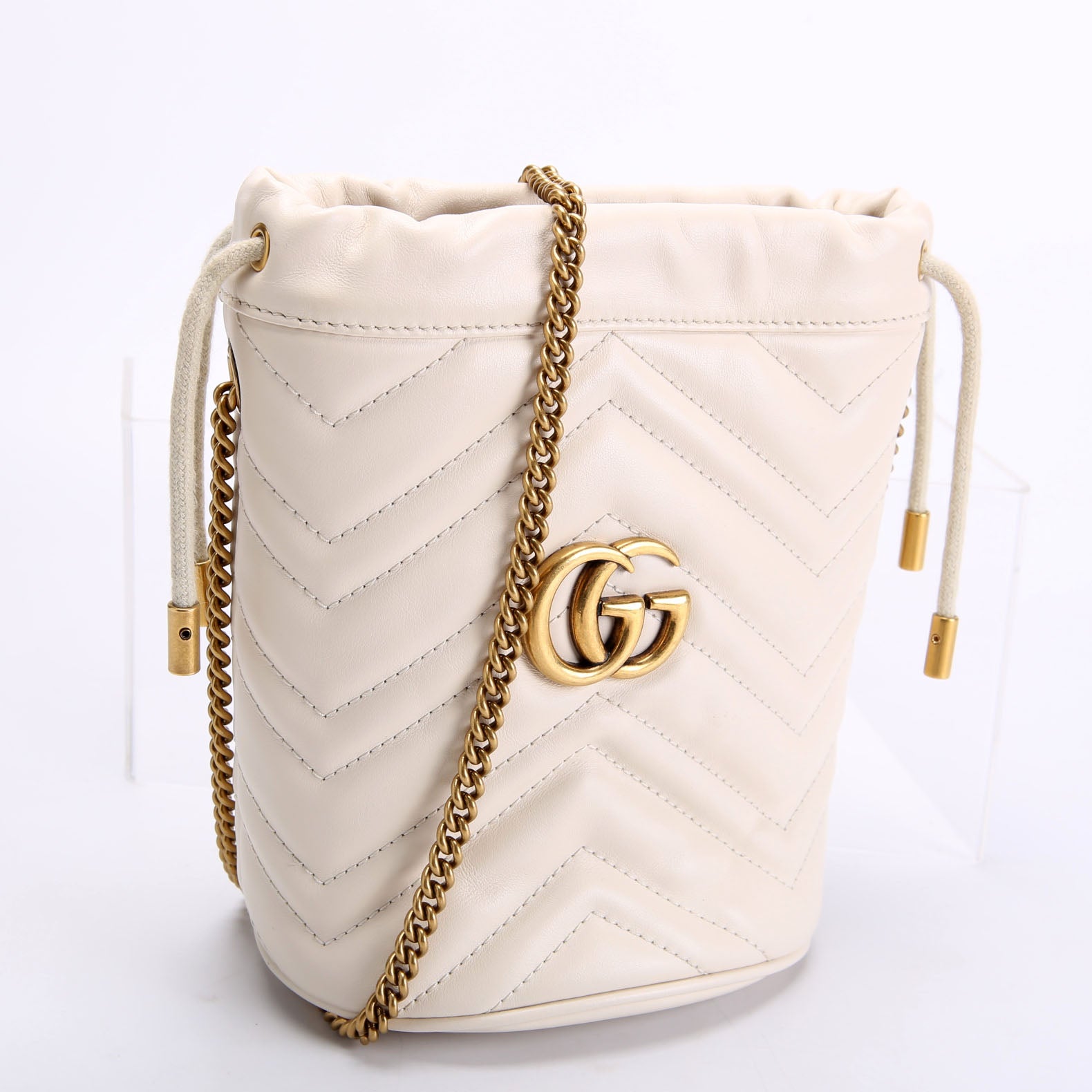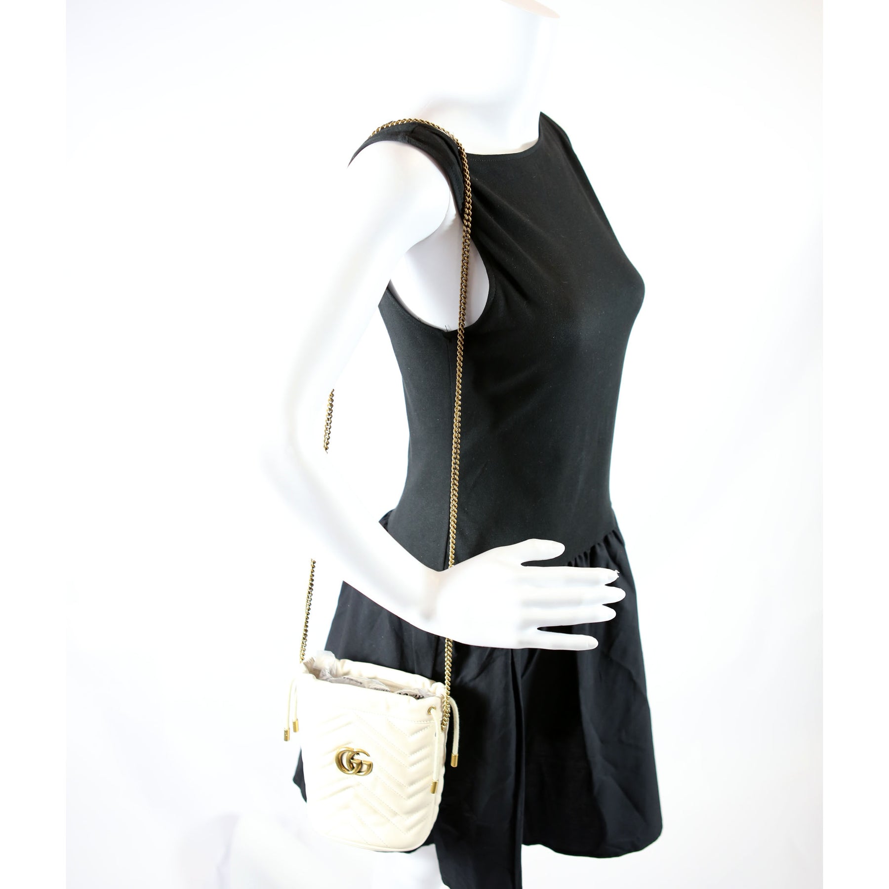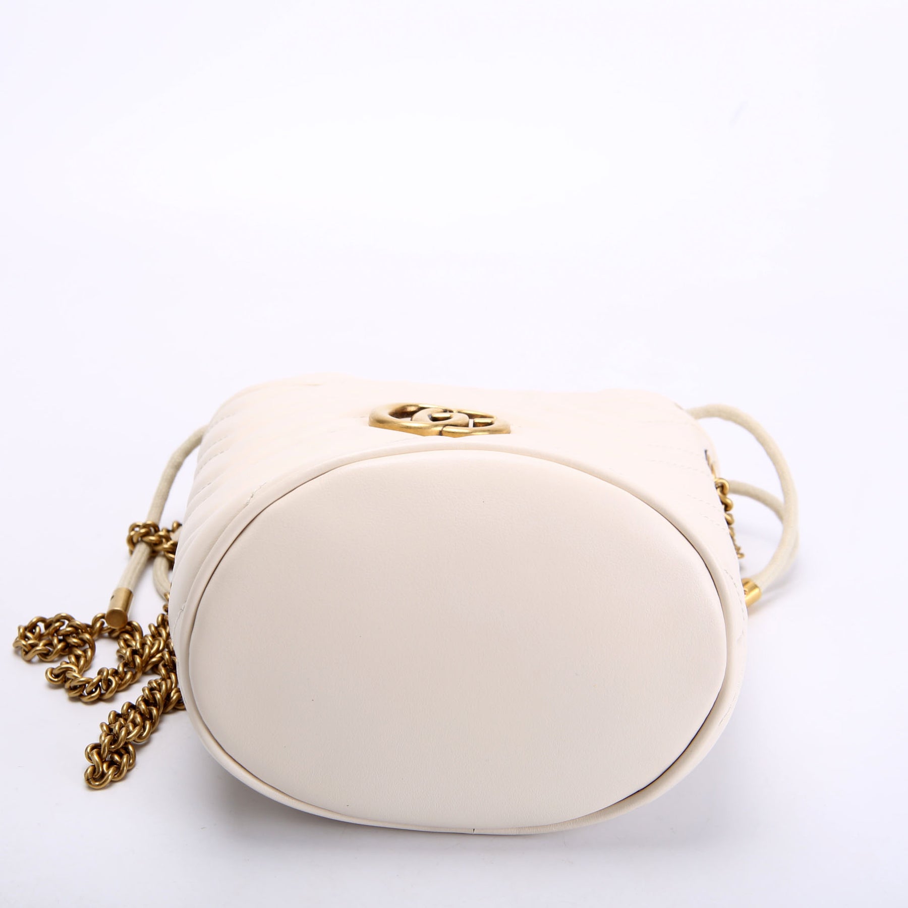 These pre-owned Gucci Marmont Mini Bucket are guaranteed 100% authentic. The exterior is in the classic Gucci Marmont leather.