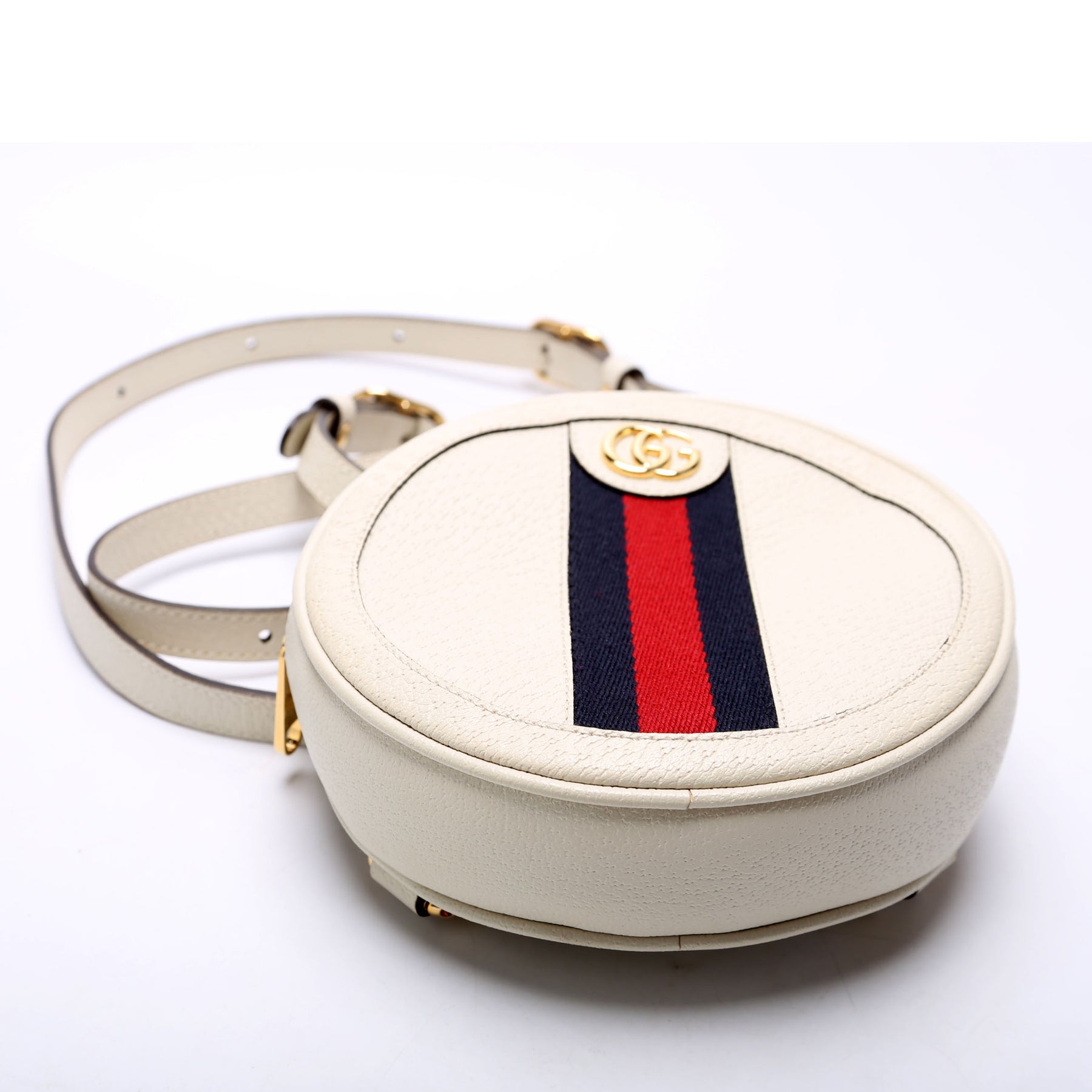 This pre-owned Gucci Ophidia Web Mini Round Backpack is guaranteed 100% authentic.