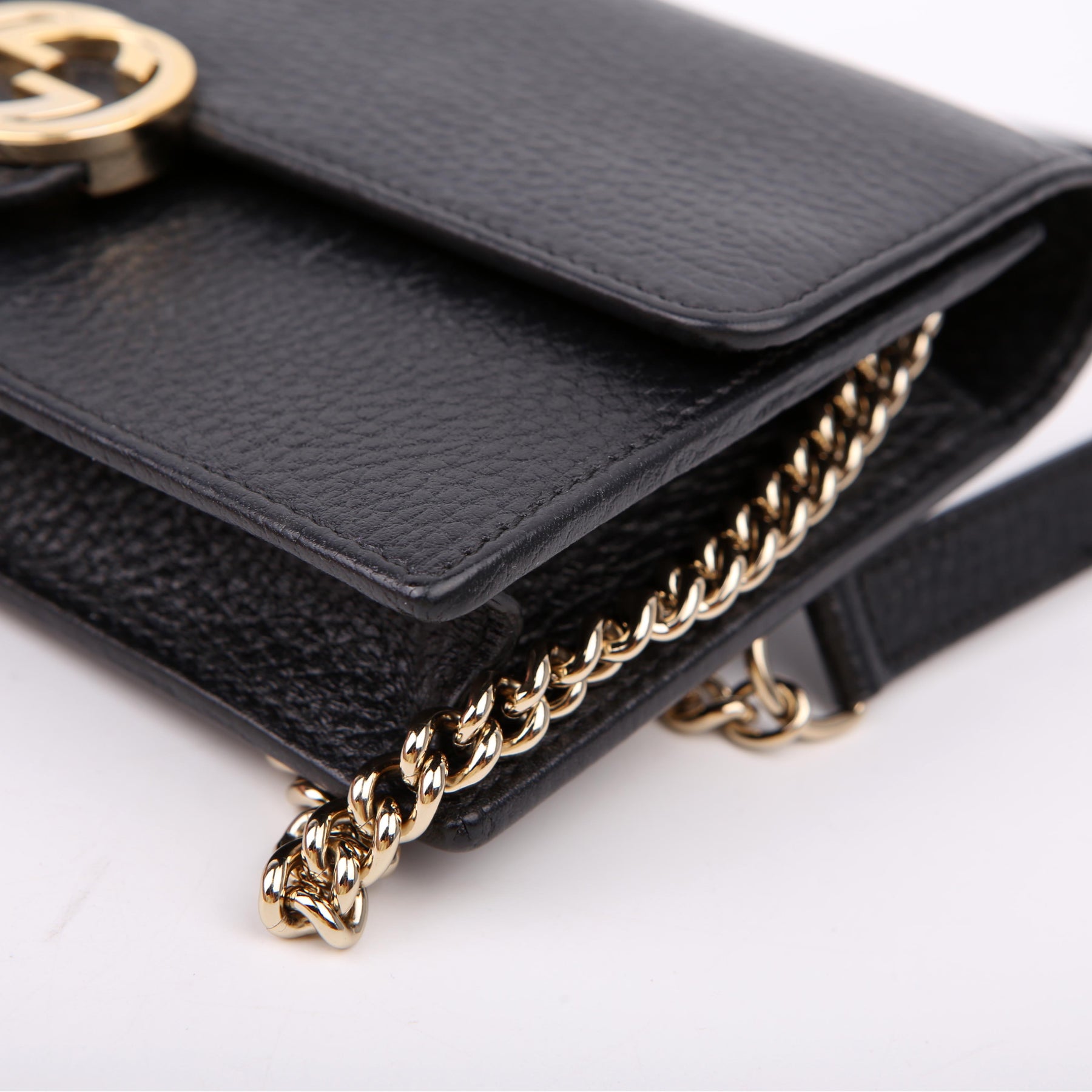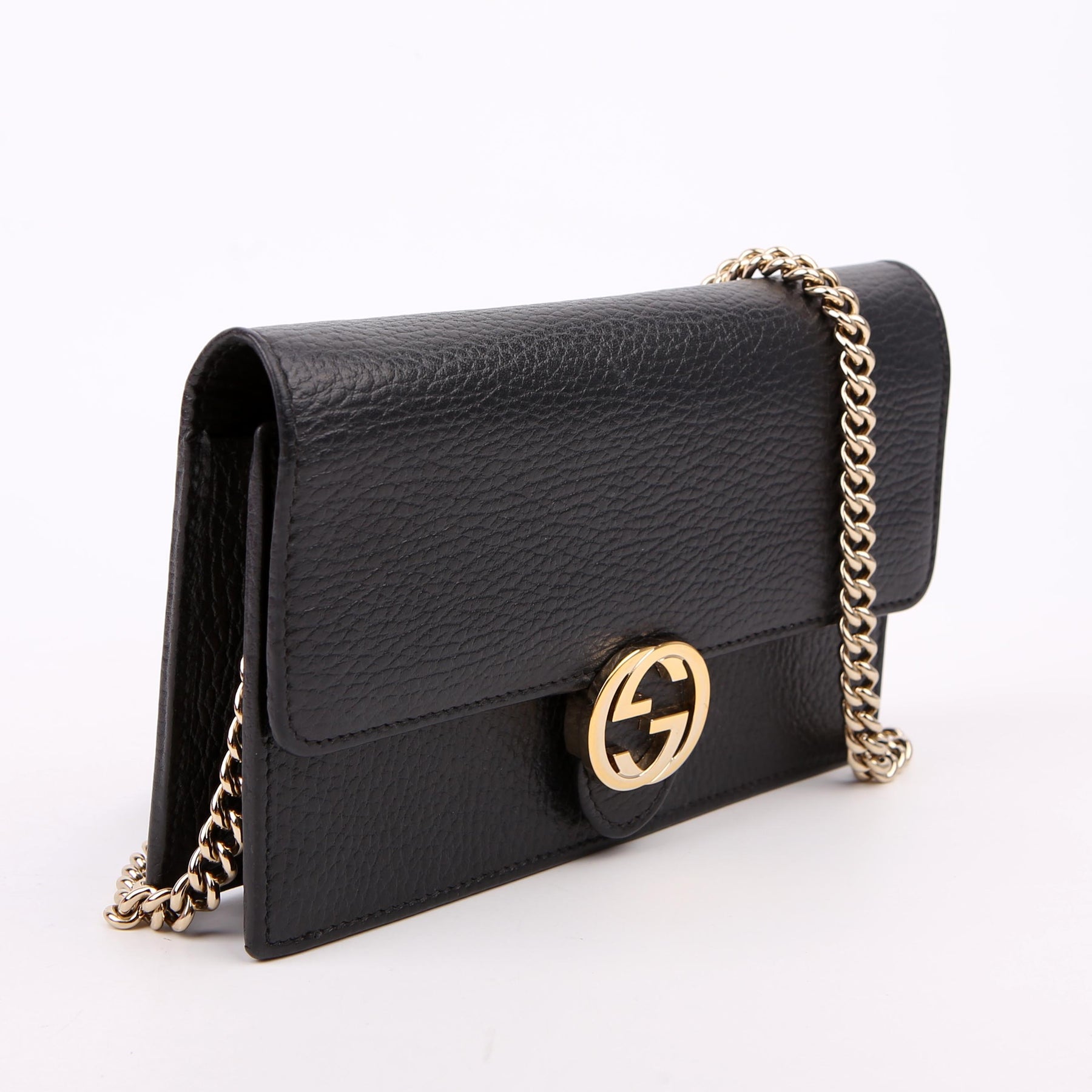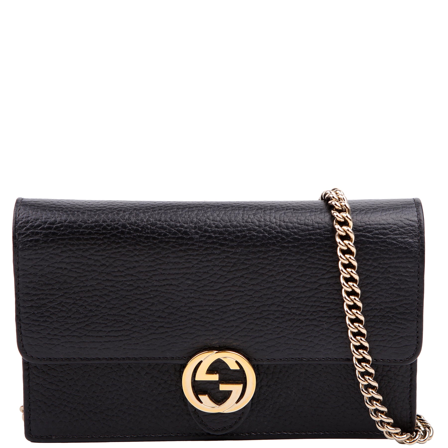 This pre-owned Gucci Interlocking GG Wallet On Chain is guaranteed to be 100% authentic. The exterior is in the classic Gucci Calfskin leather.