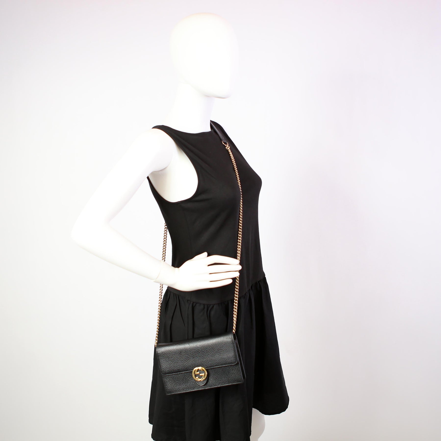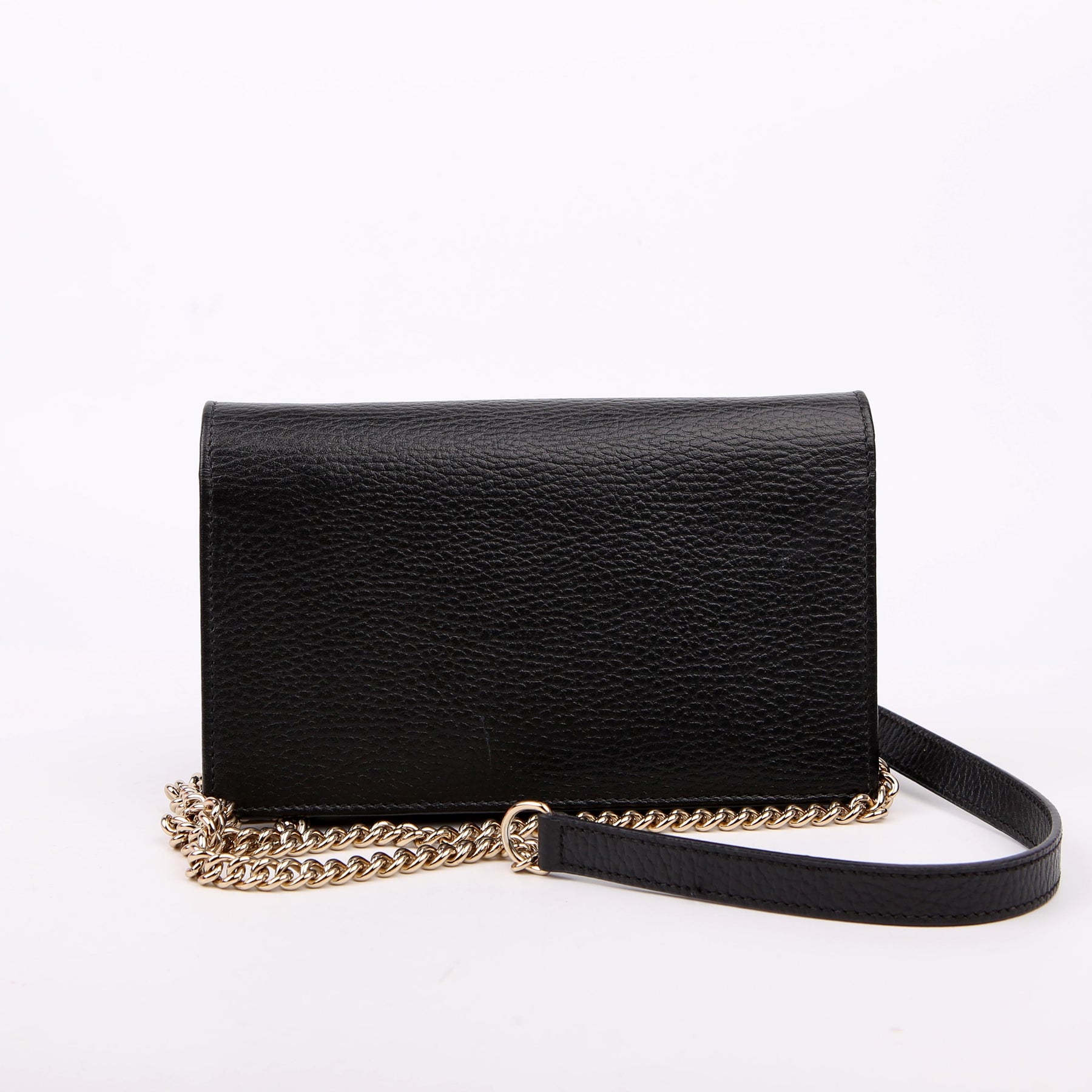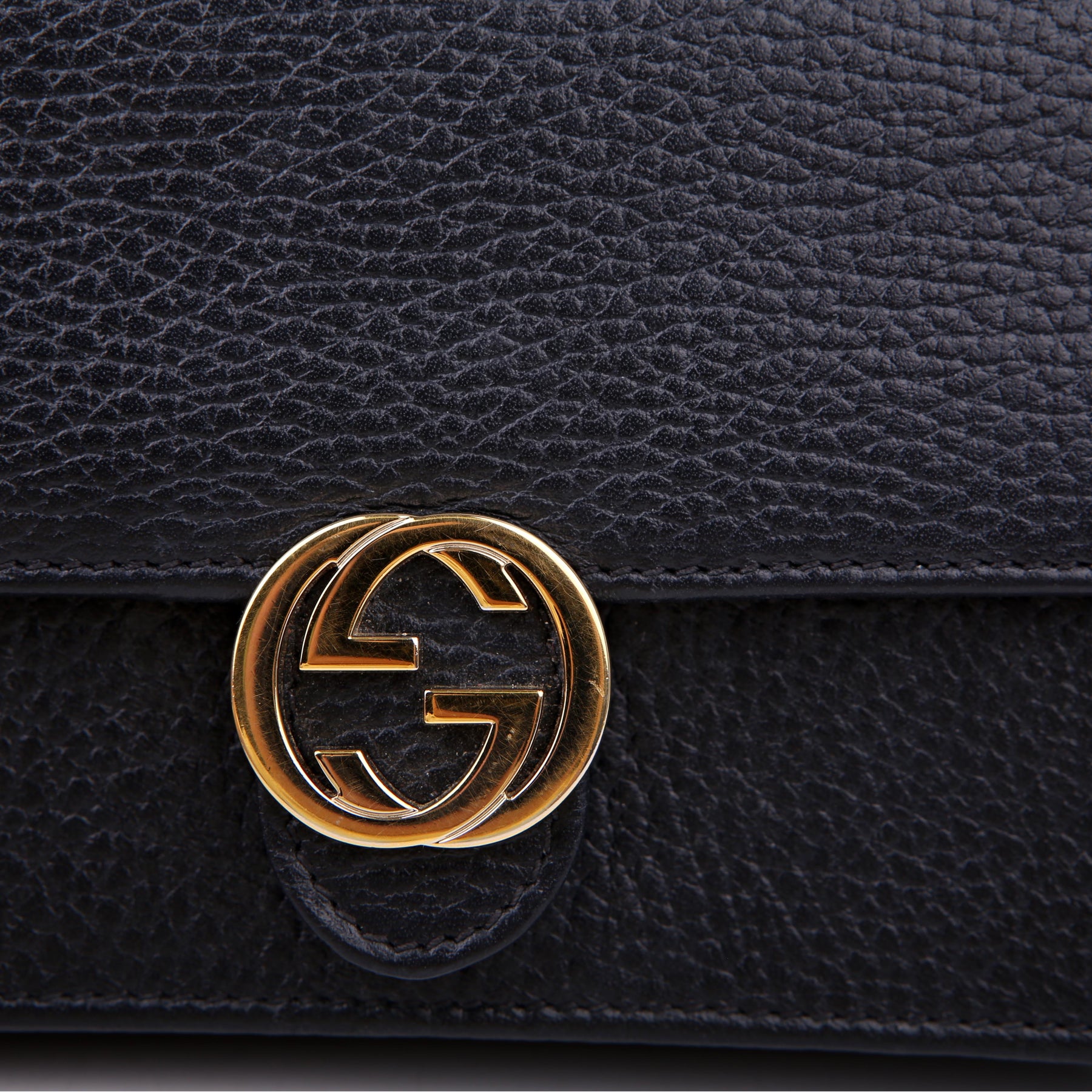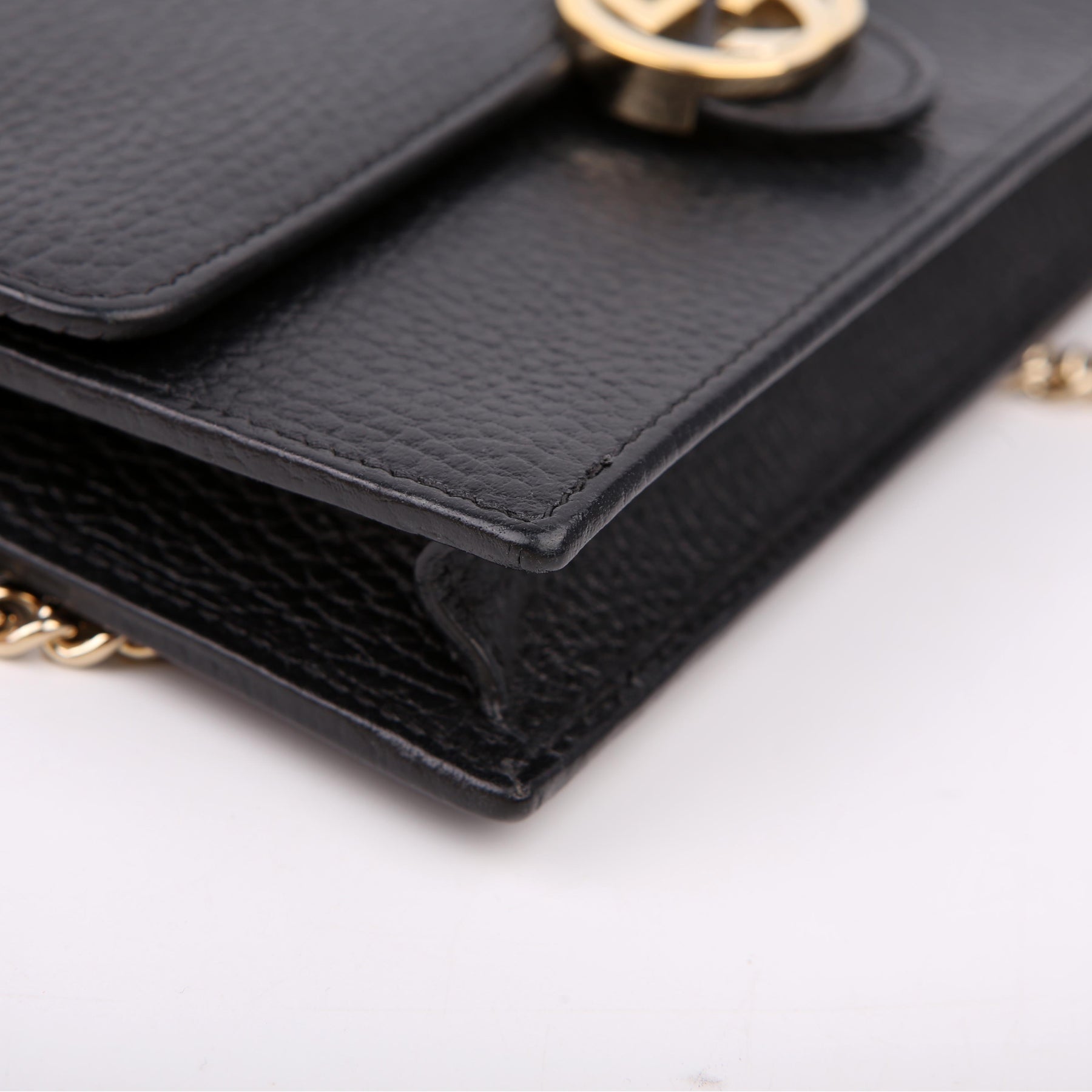 This pre-owned Gucci Interlocking GG Wallet On Chain is guaranteed to be 100% authentic. The exterior is in the classic Gucci Calfskin leather.