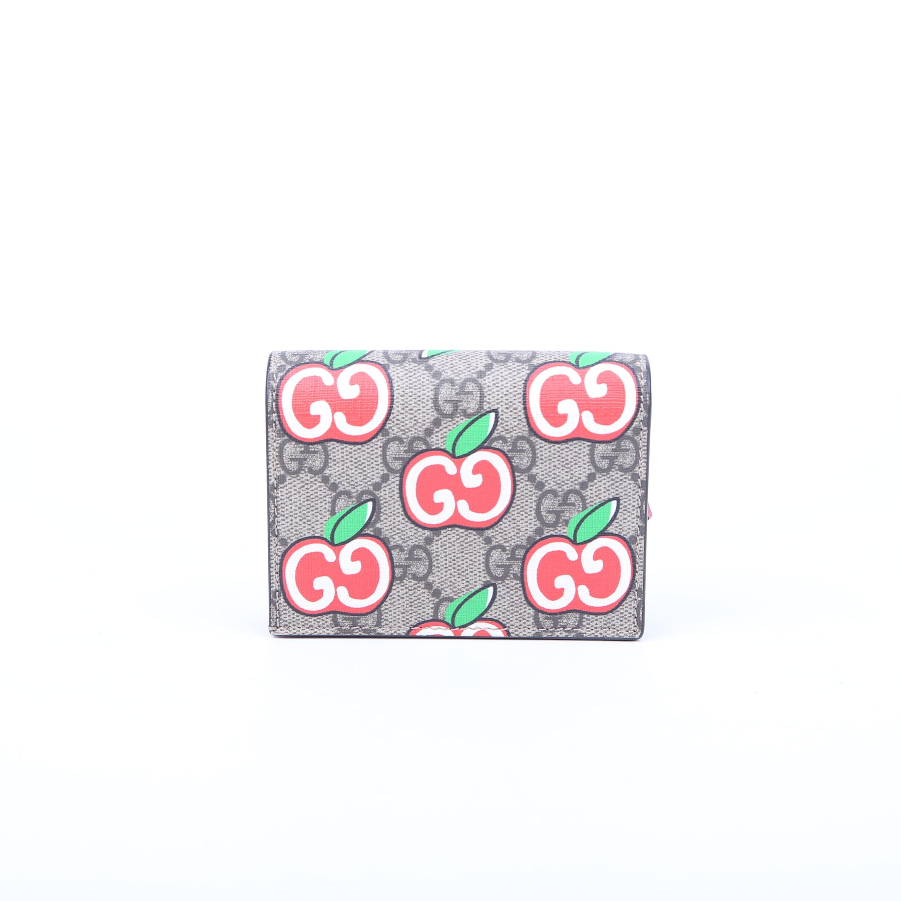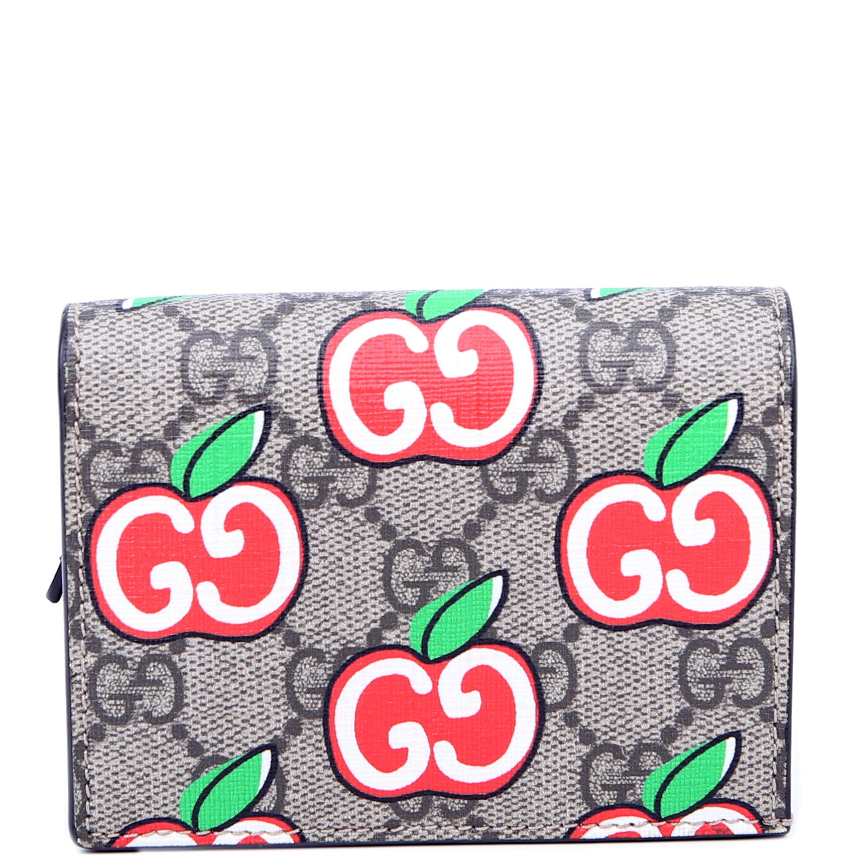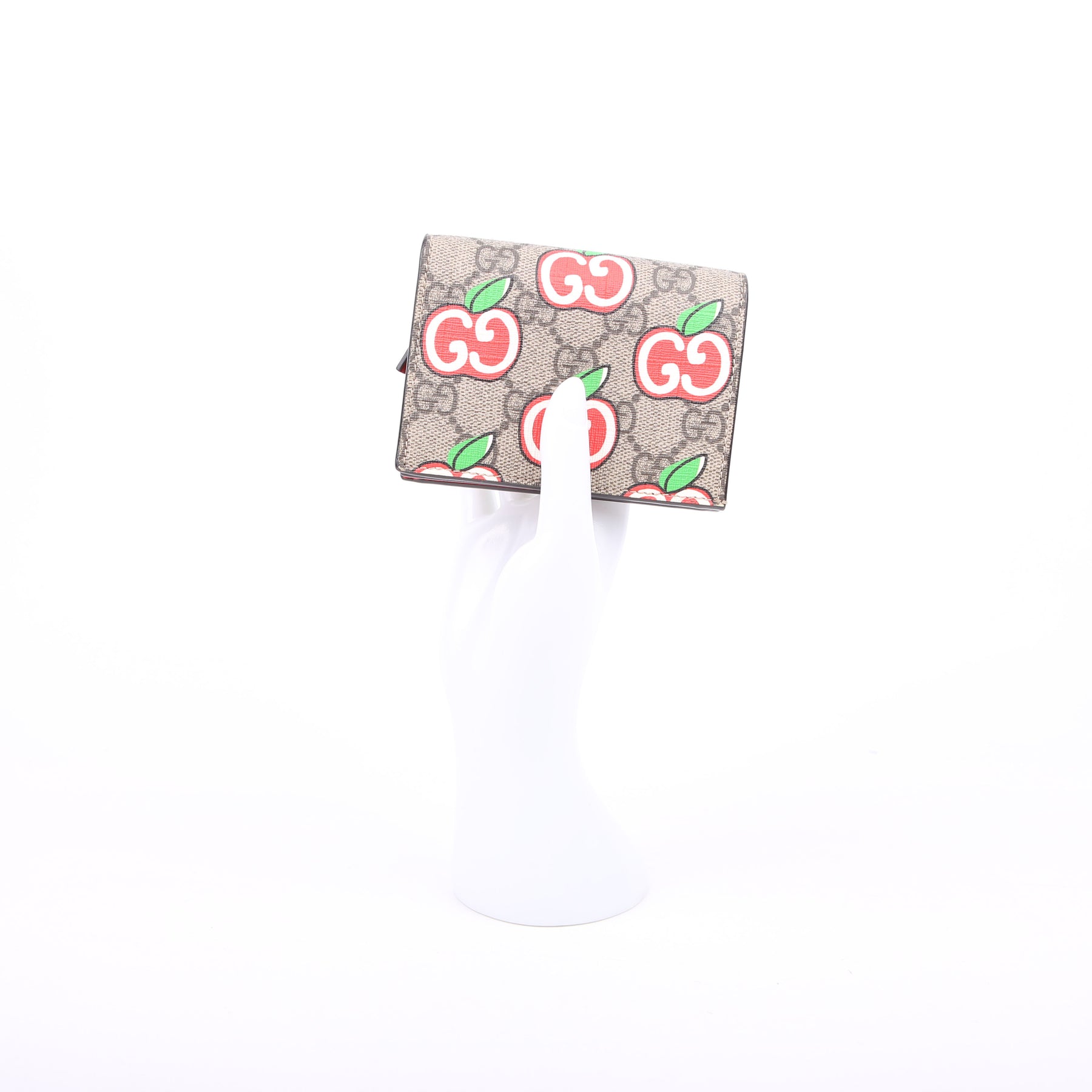 This pre-owned Gucci GG Apple Card Case is guaranteed 100% authentic. The exterior is in the classic Gucci GG Supreme coated canvas.