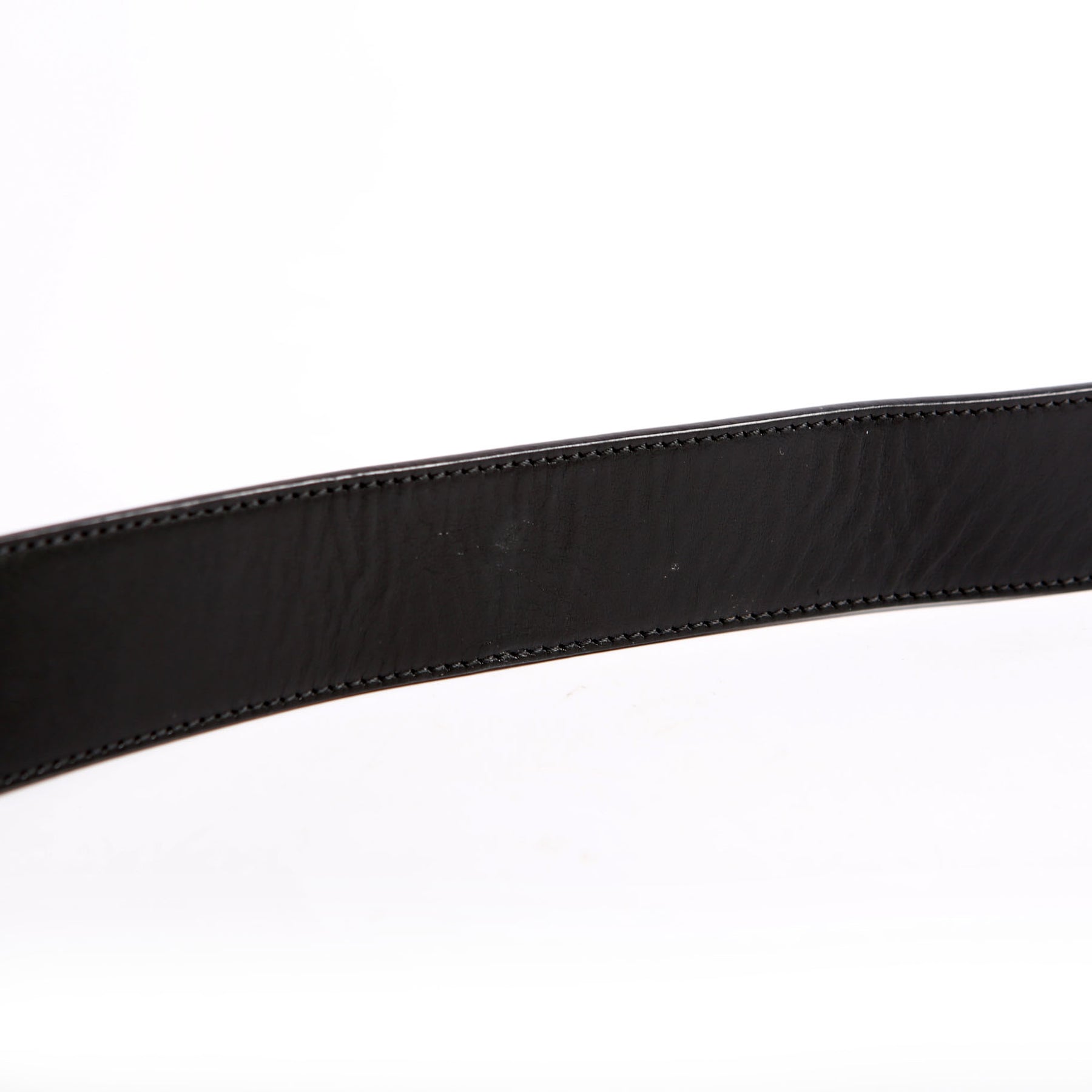 Hardware: The buckle operates properly. The buckle shows scratches. This belt is missing a loop.
