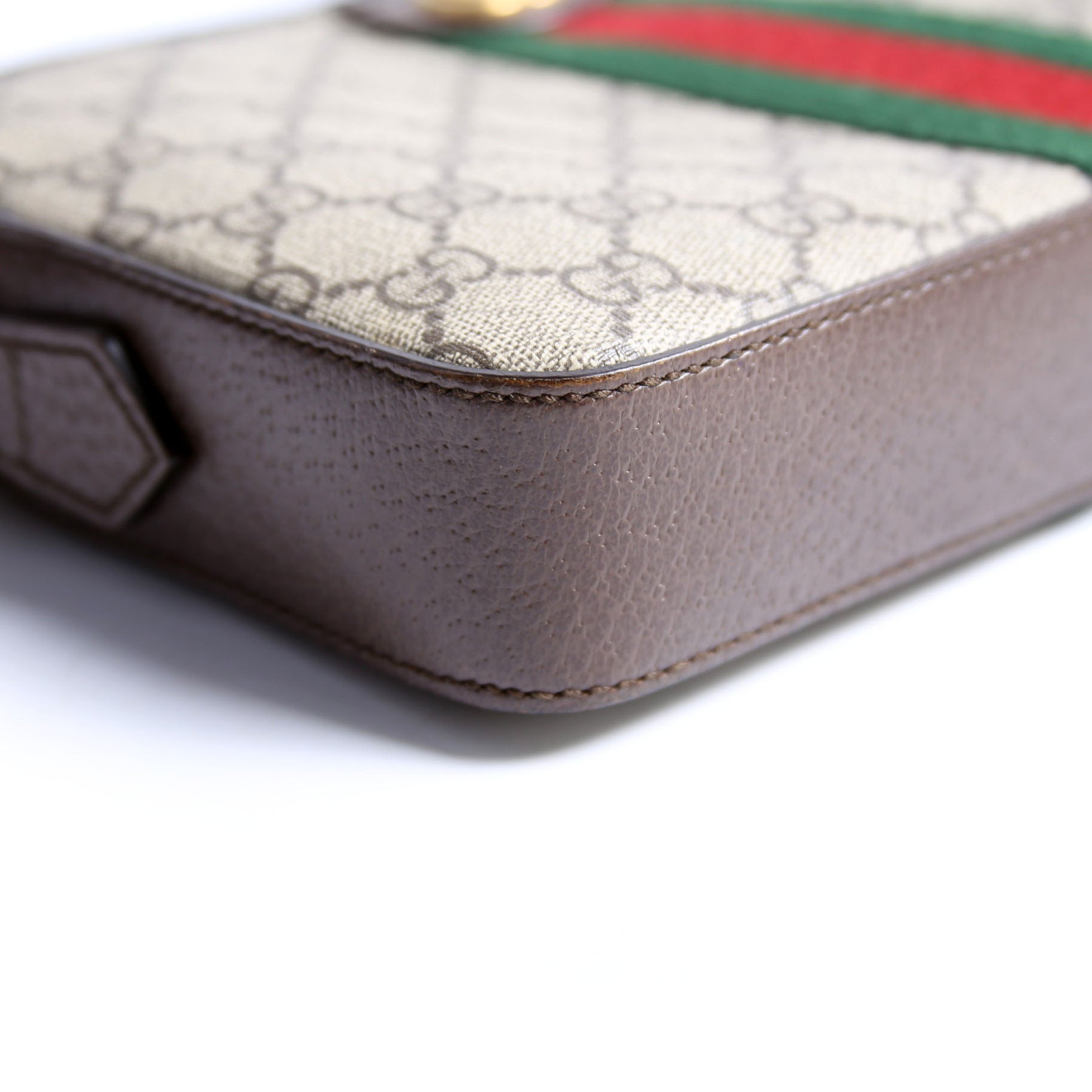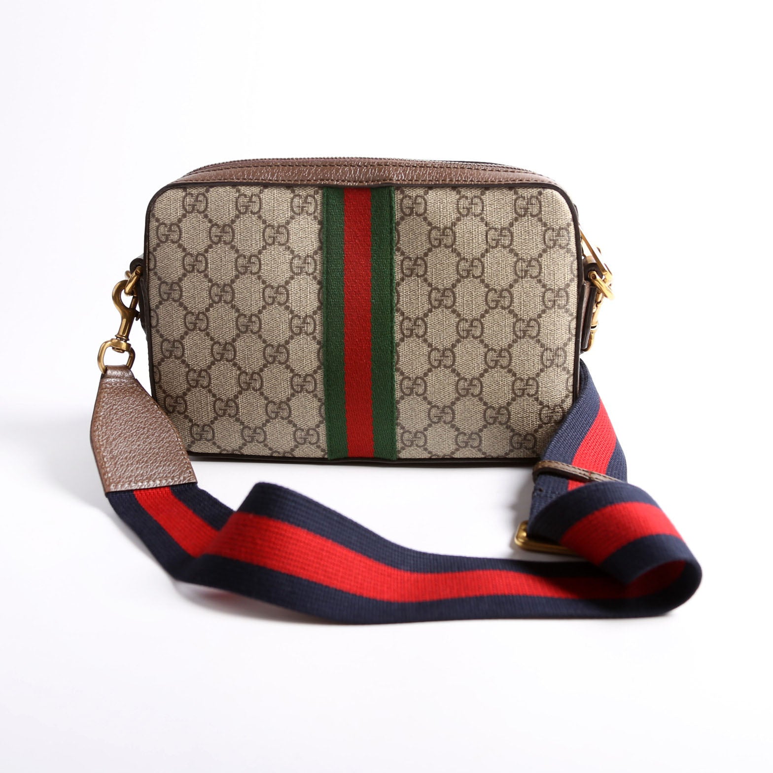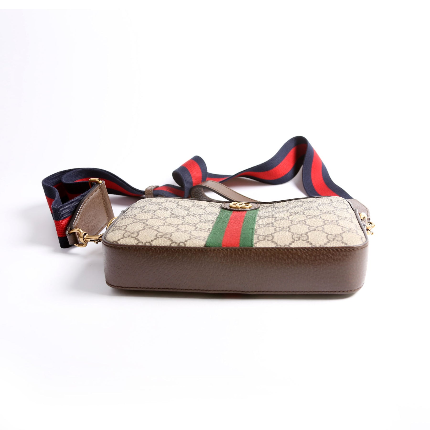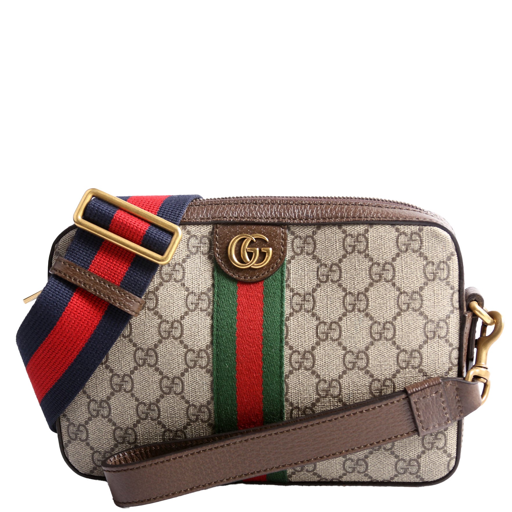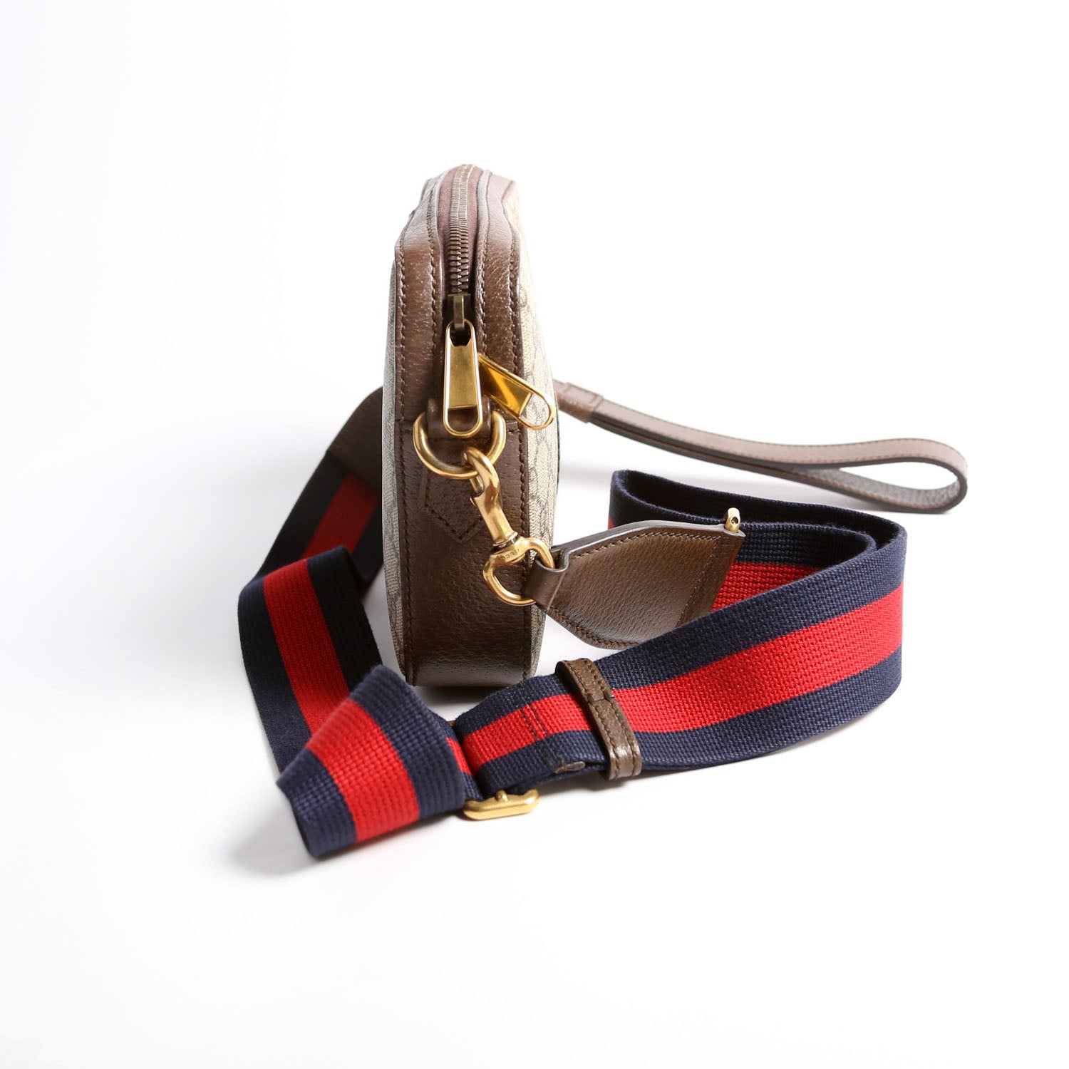 This pre-owned Gucci GG Supreme Ophidia Small Wristlet Crossbody is guaranteed 100% authentic. The exterior is in the classic Gucci coated canvas.