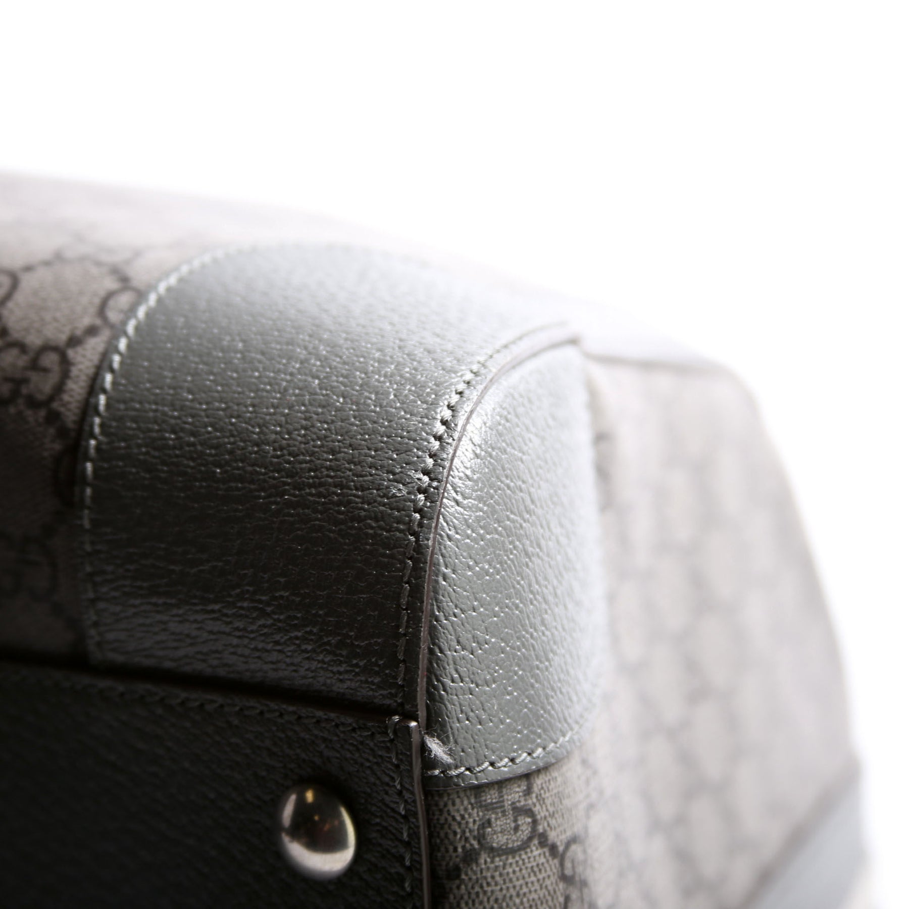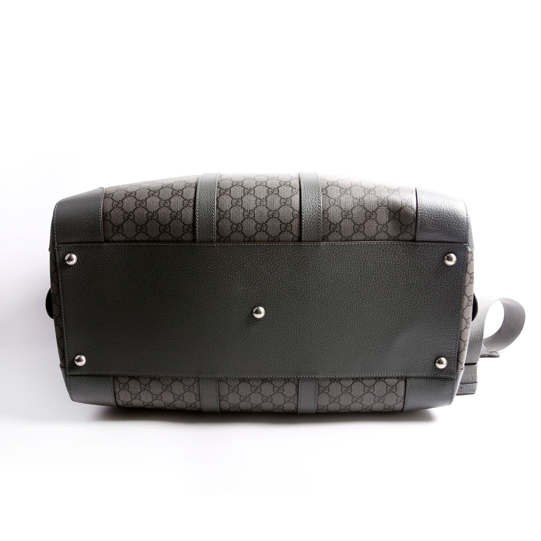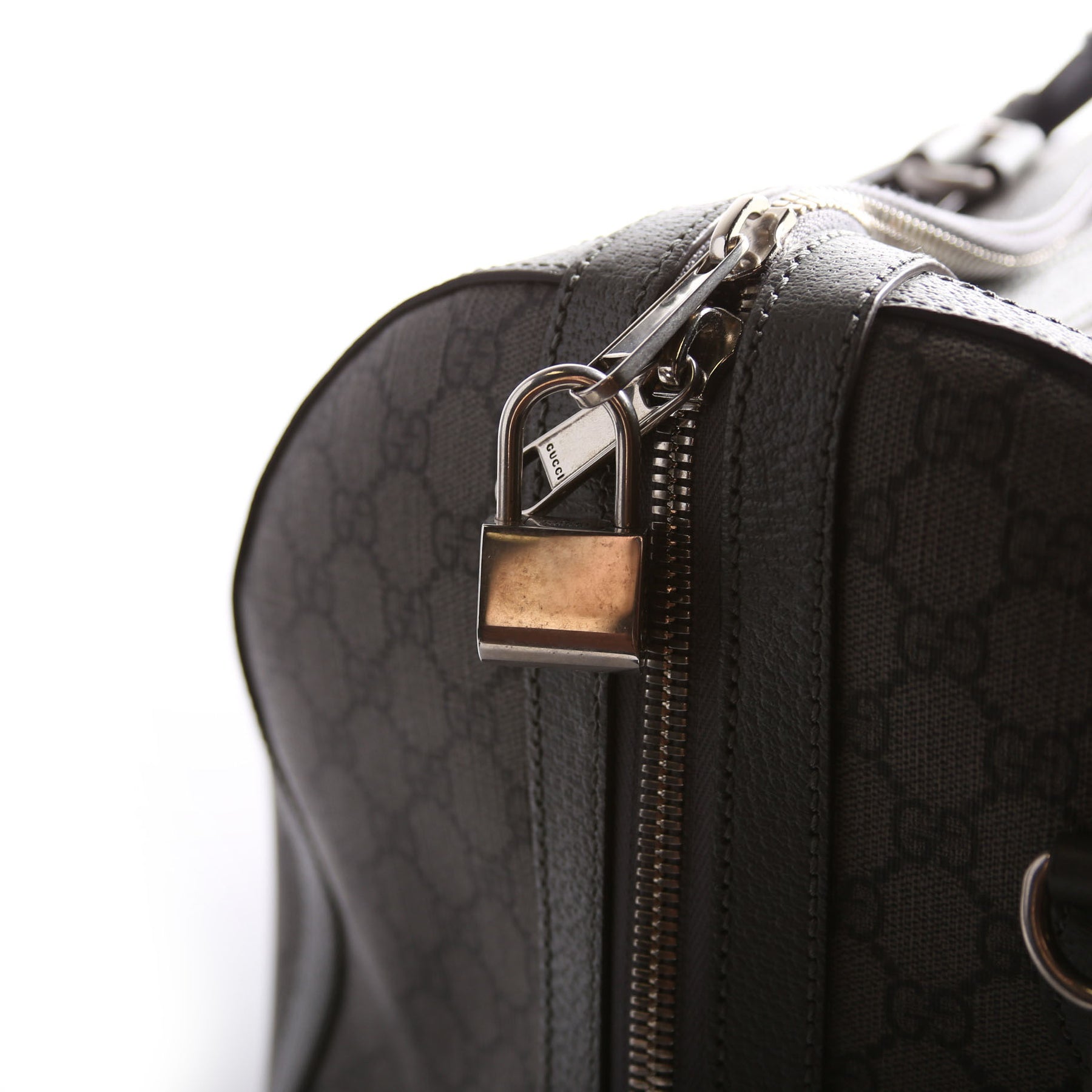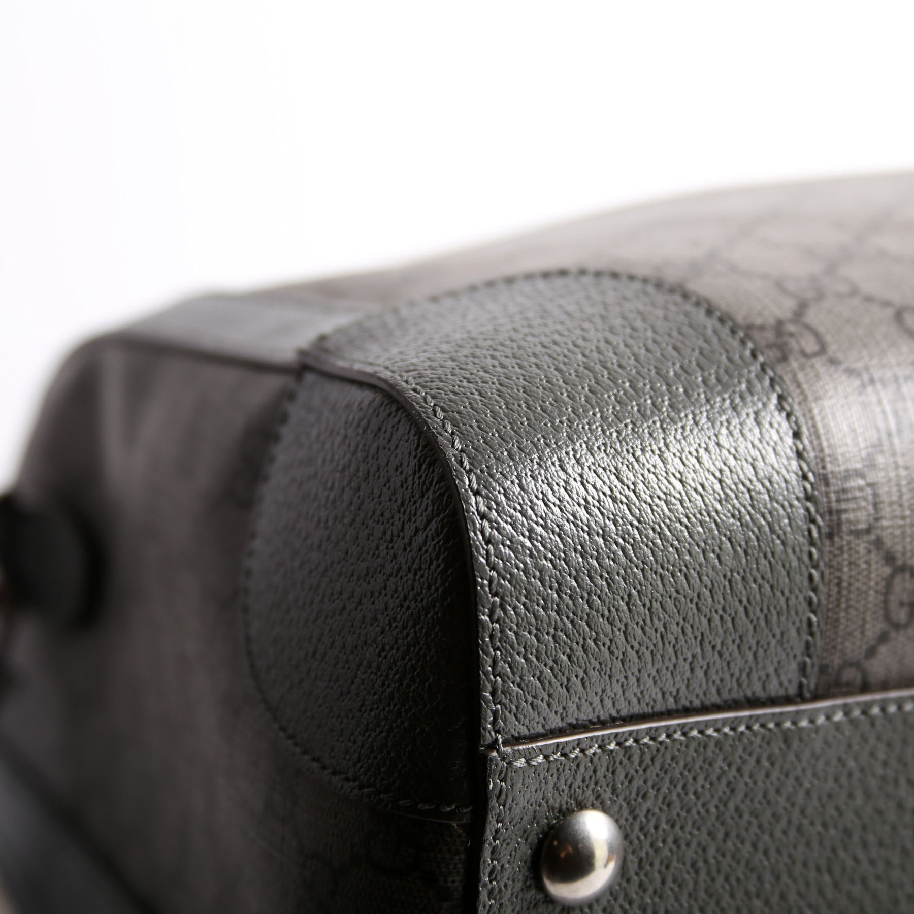 This pre-owned Gucci Savoy Large Duffle Bag is guaranteed 100% authentic. The exterior is in the classic Gucci GG Supreme Coated Canvas.