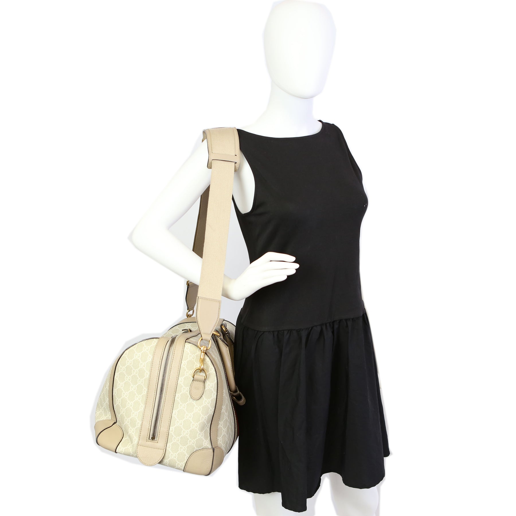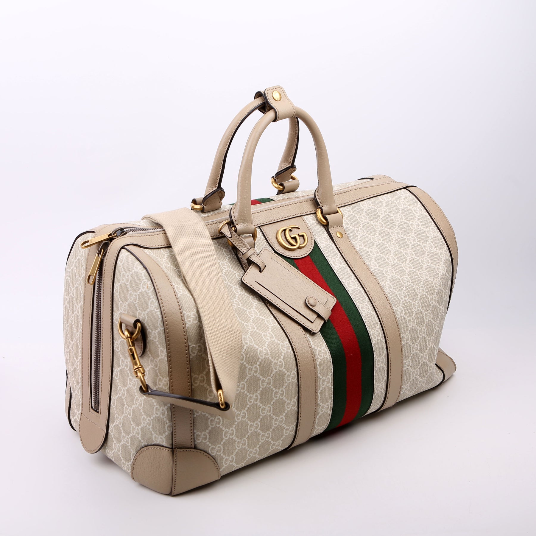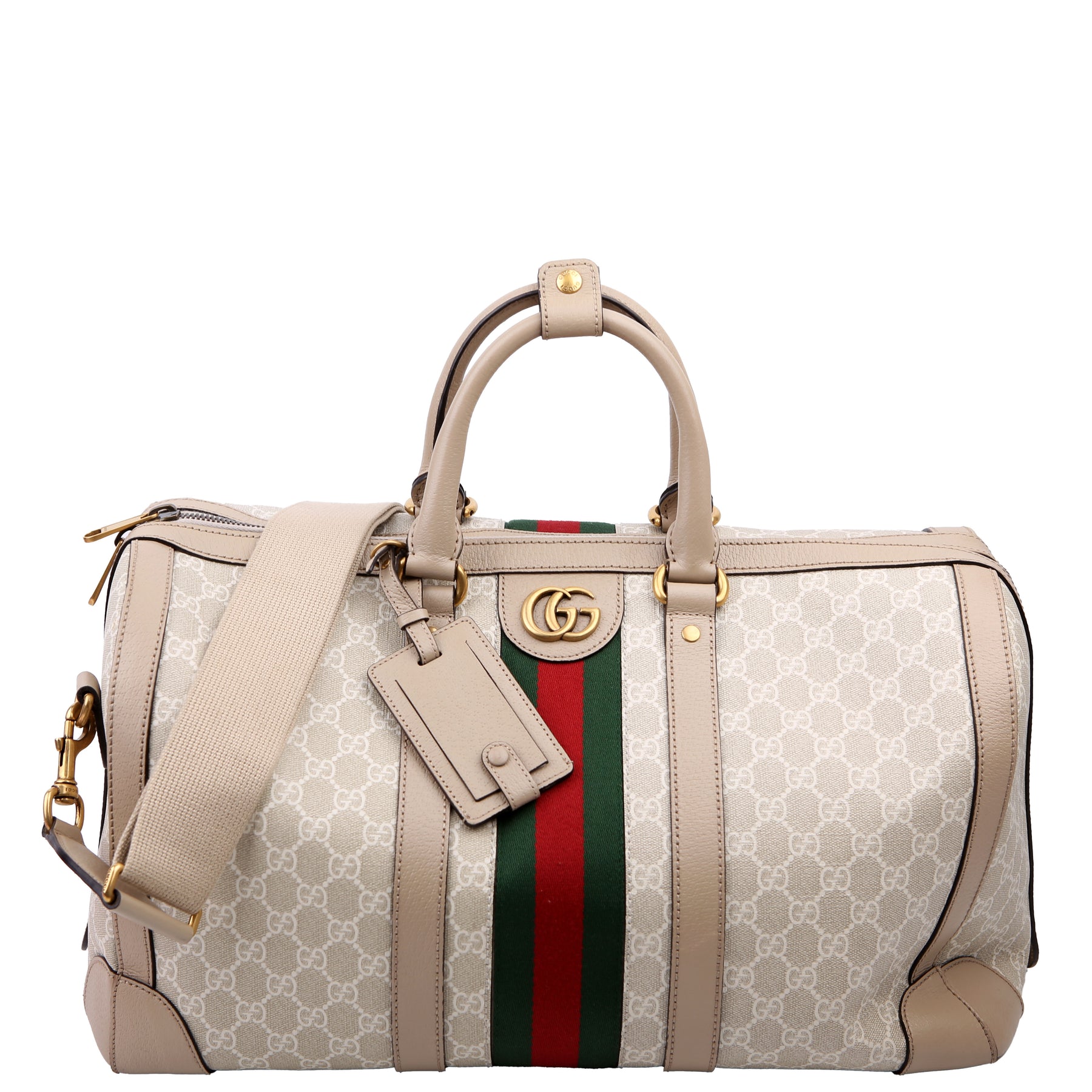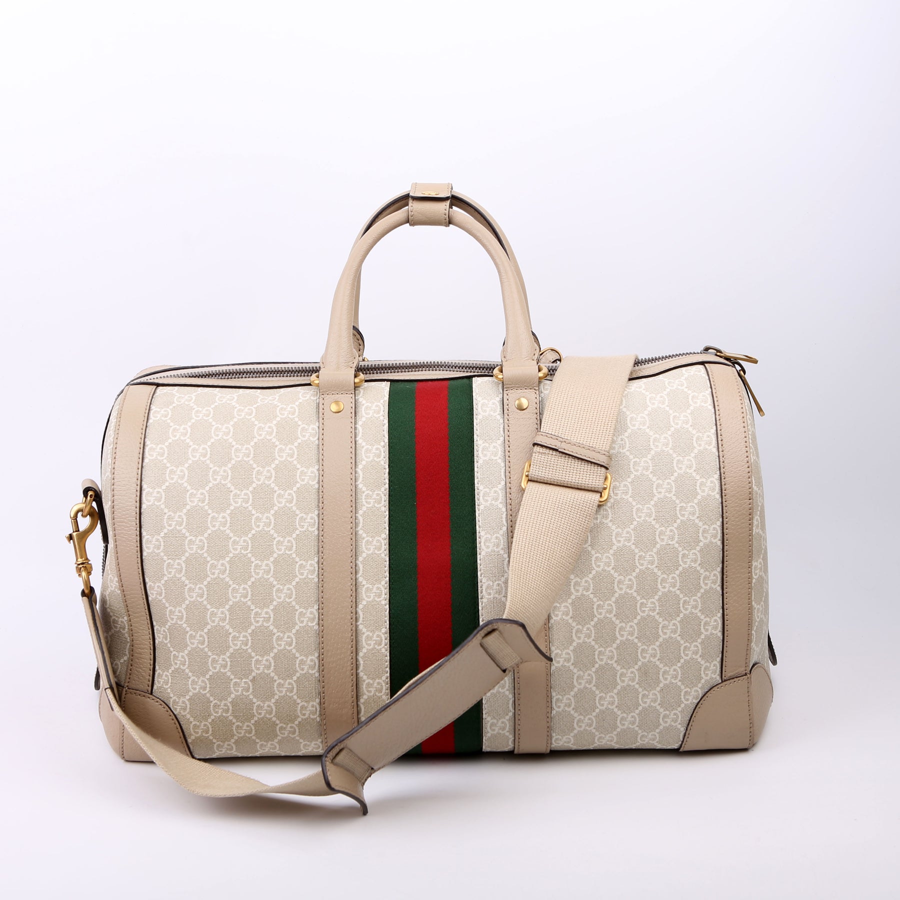 This pre-owned Gucci Savoy Medium Duffle is guaranteed 100% authentic. The exterior is in the classic Gucci GG Supreme coated canvas.