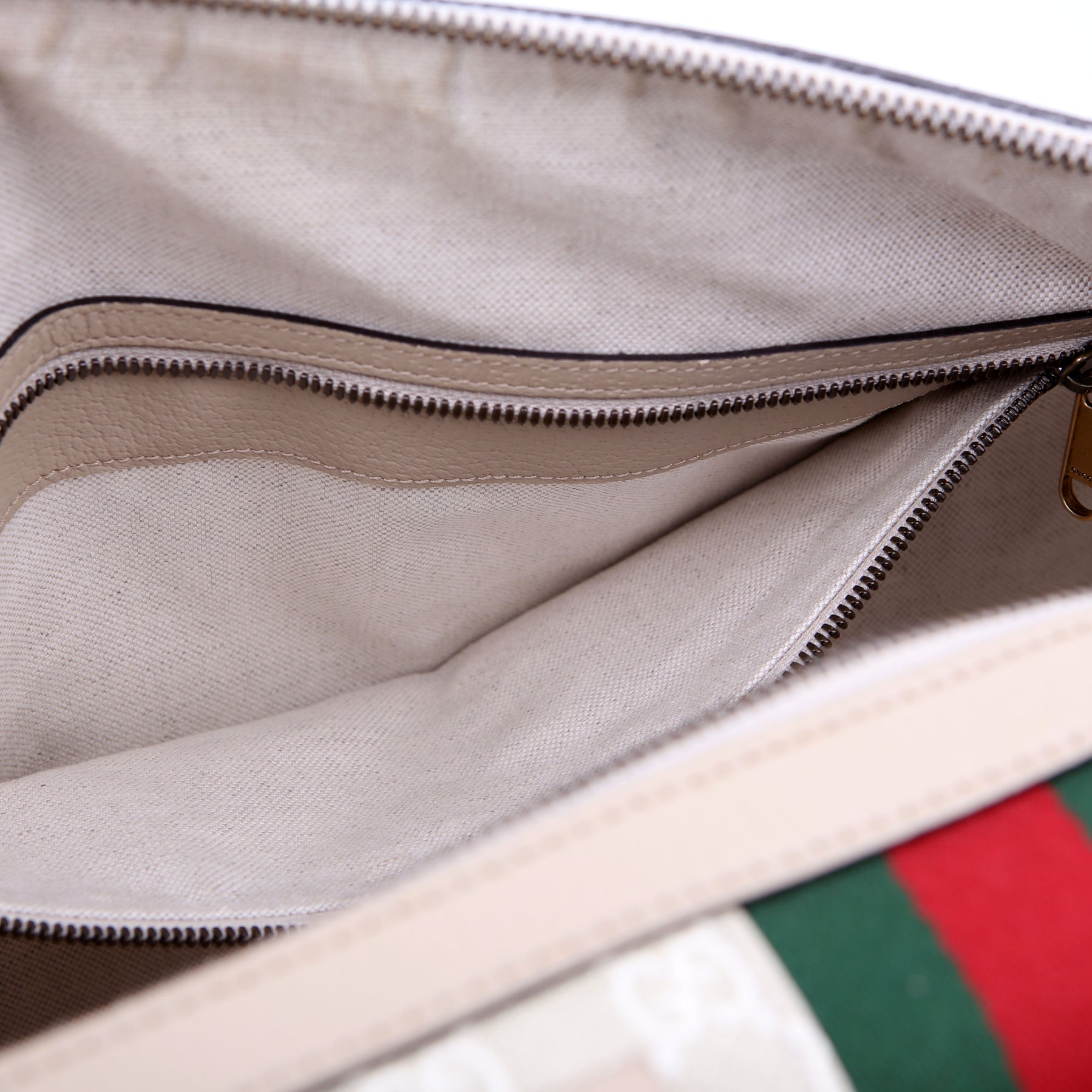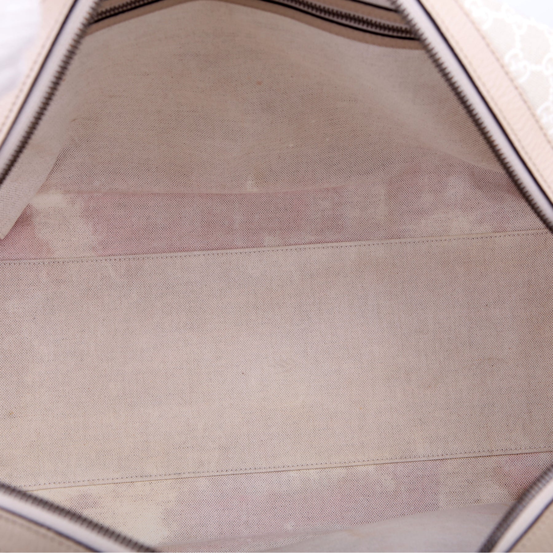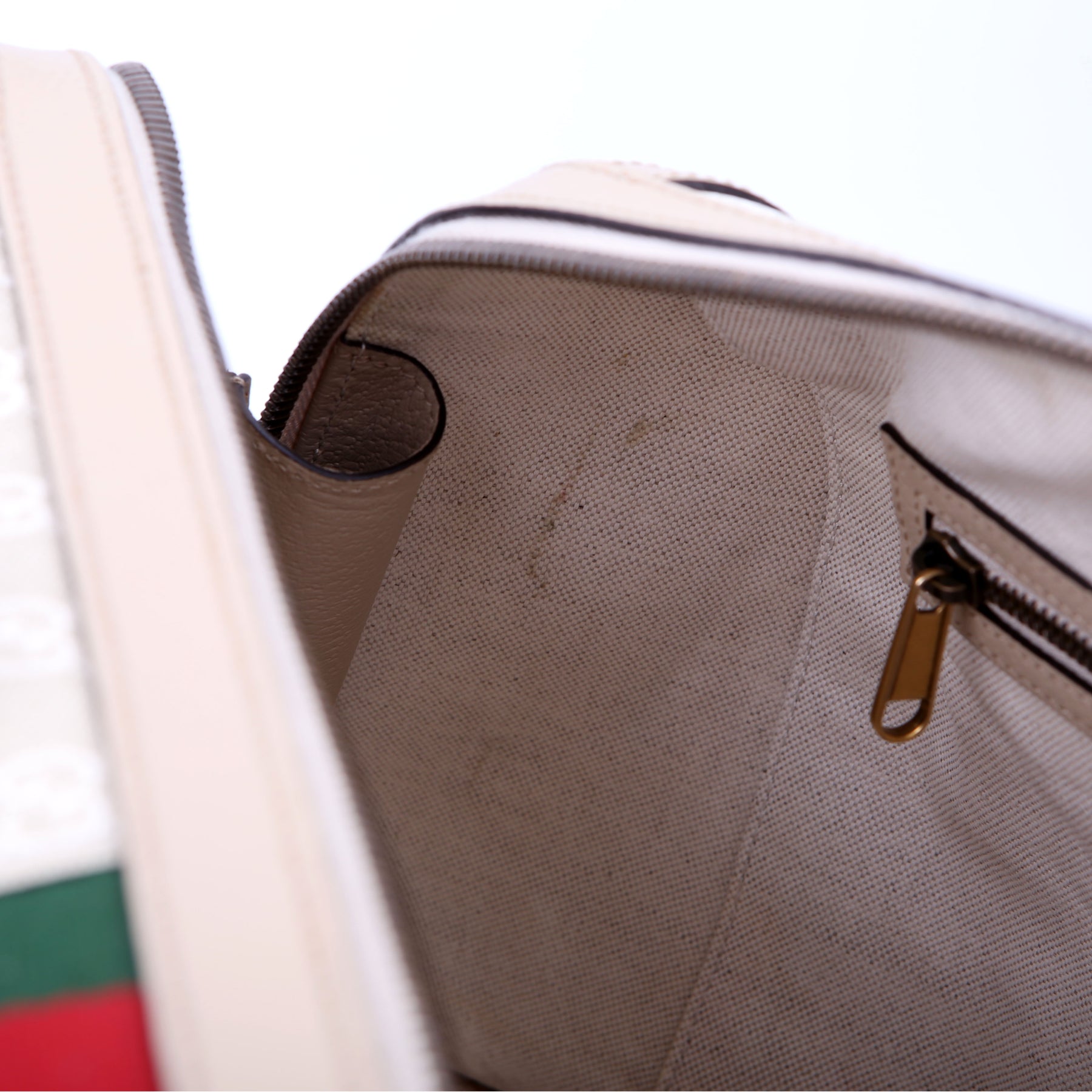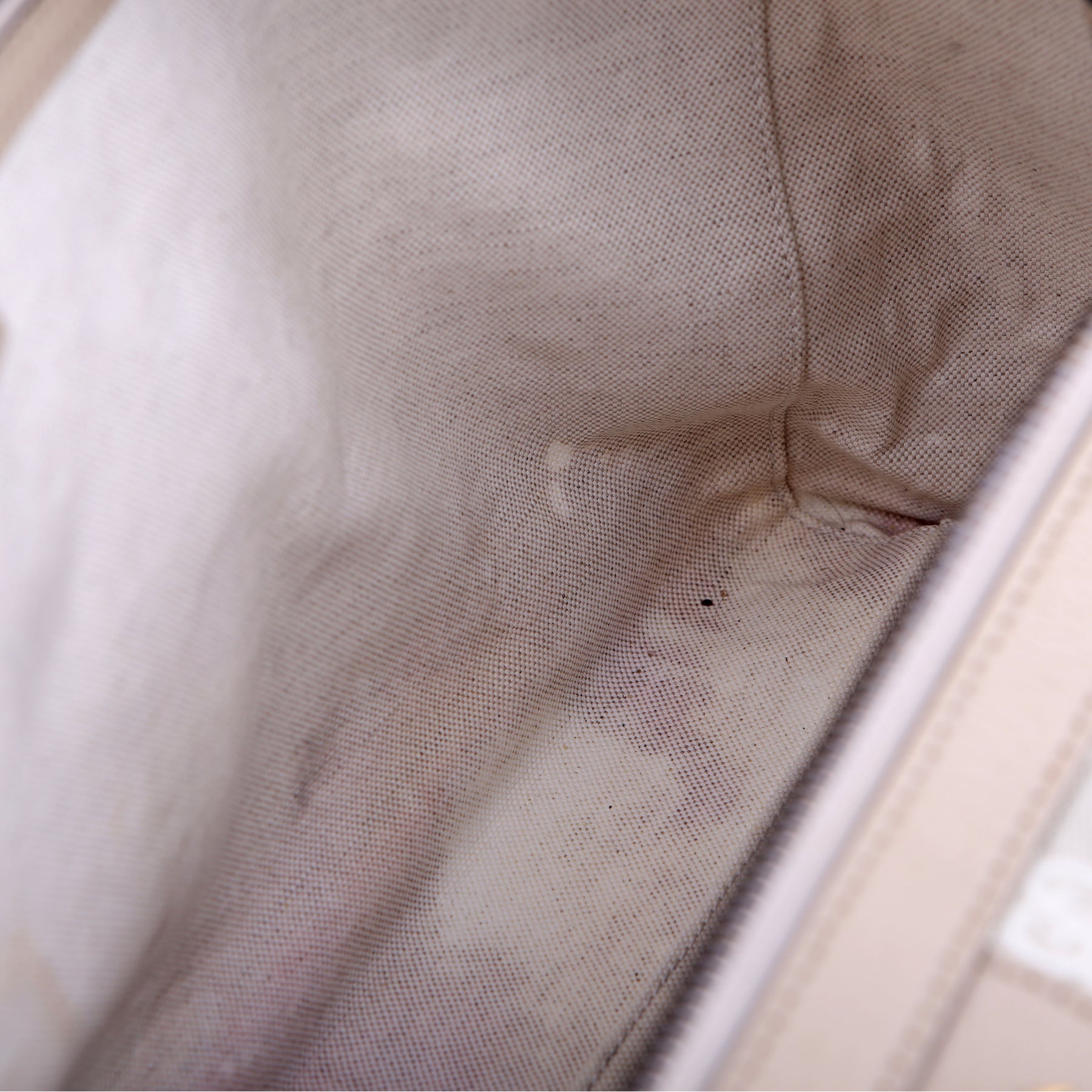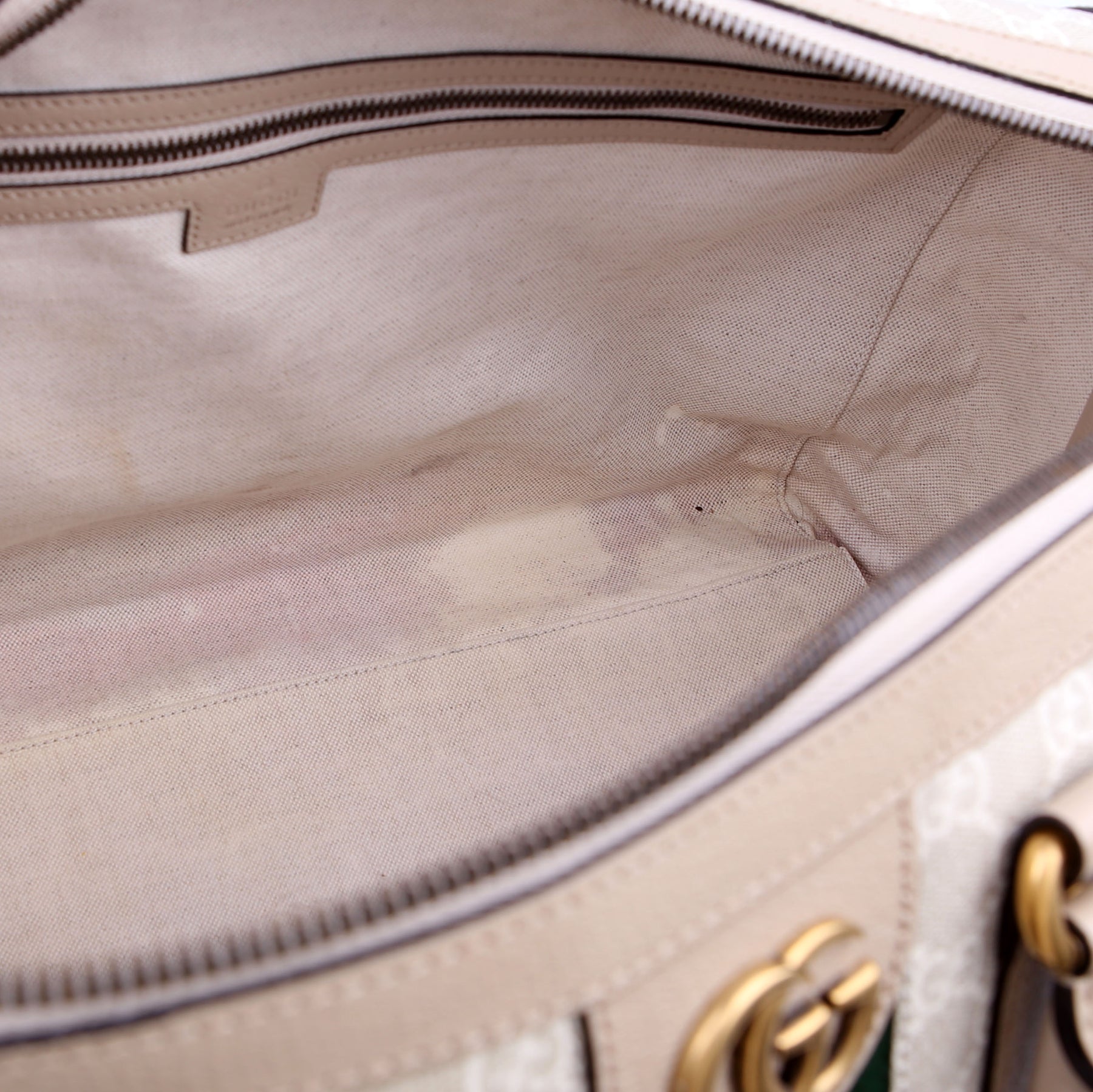 Interior: The interior has major stains throughout. It features one zip closure pocket and one open pocket.