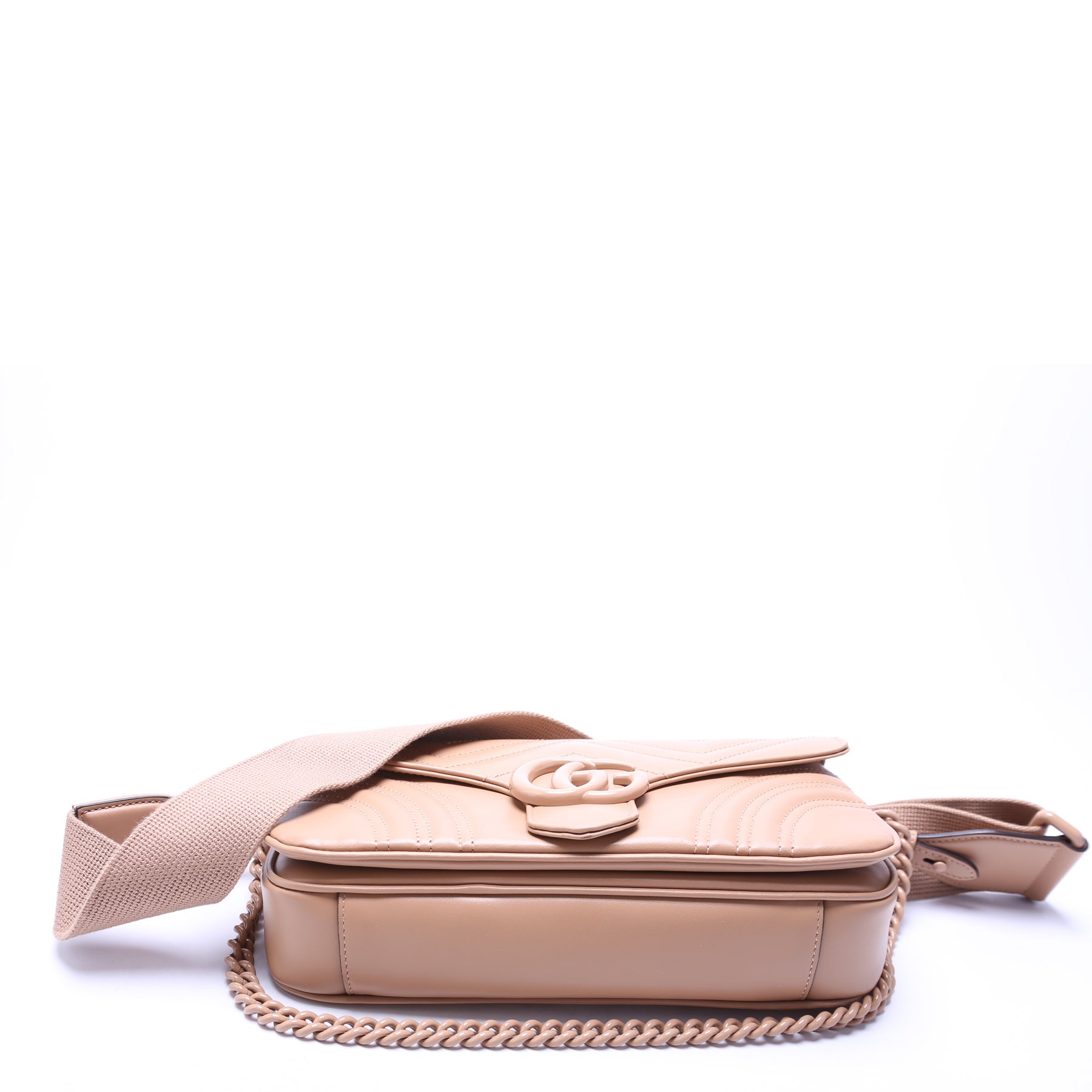 This pre-owned Gucci Marmont Monochrome Leather Shoulder Mini Flap is guaranteed 100% authentic. The exterior is in the classic Gucci Marmont leather.