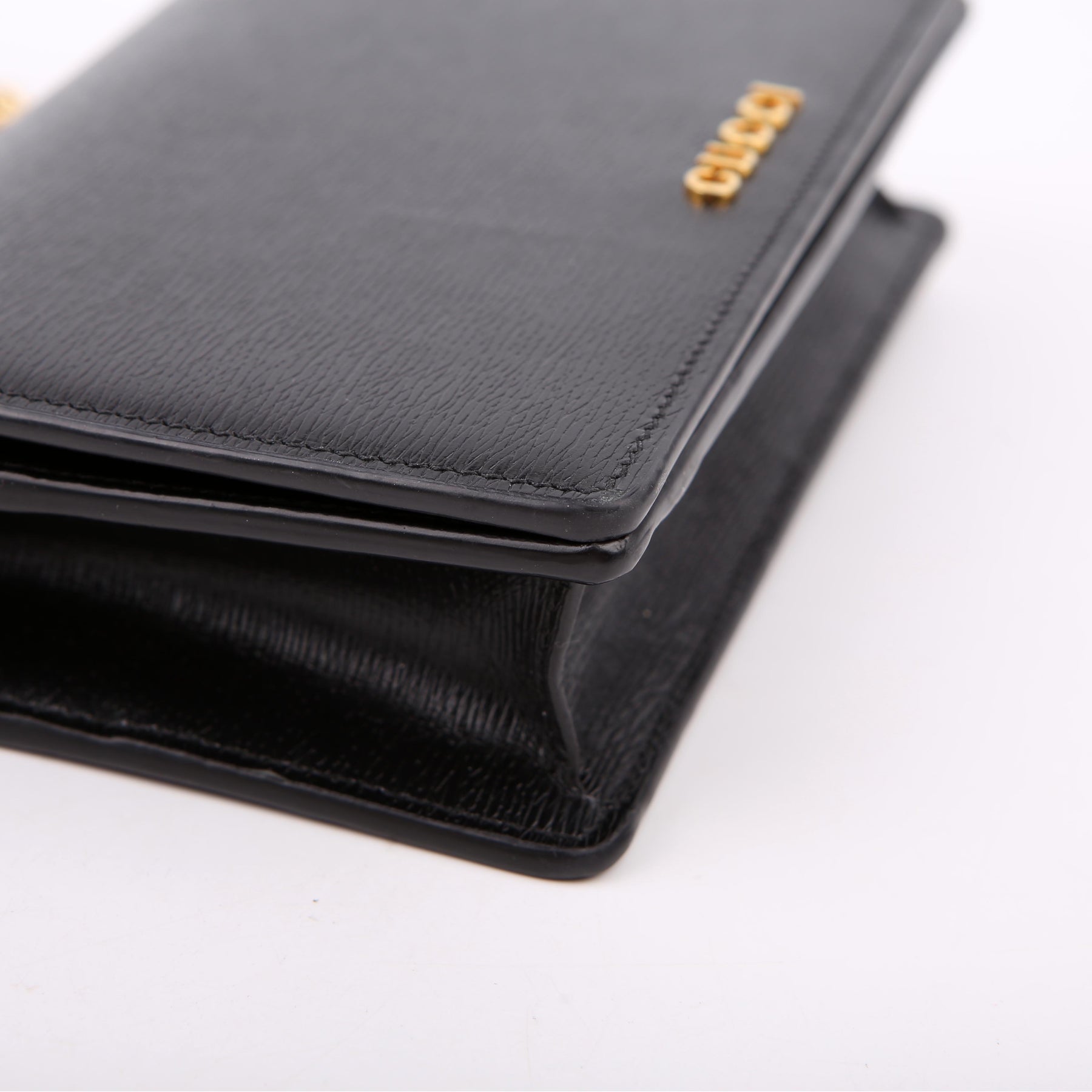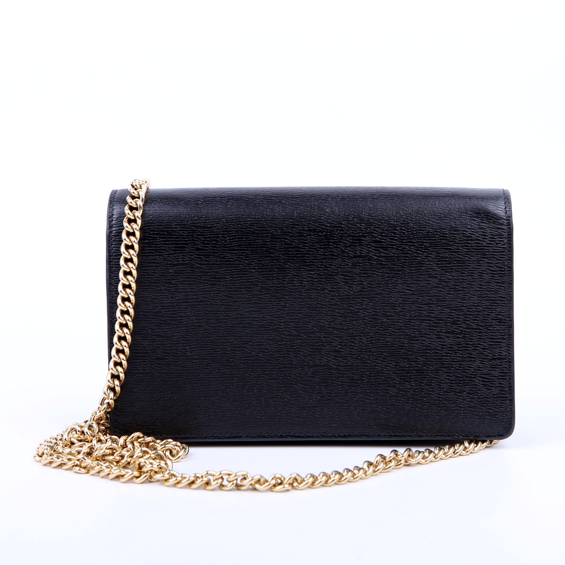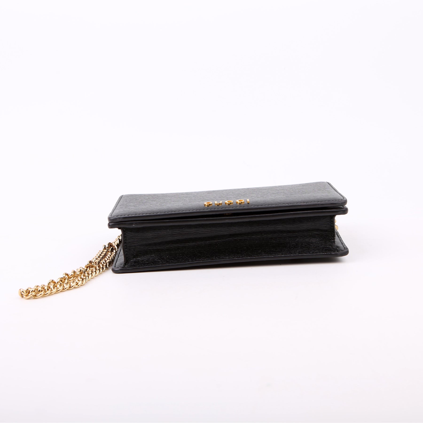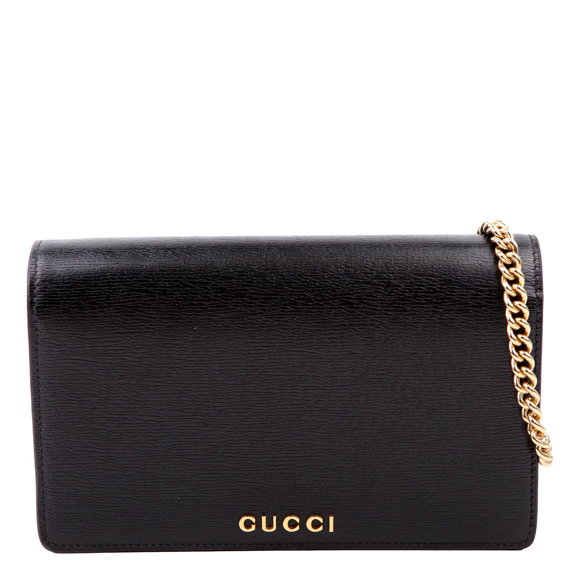 This pre-owned Gucci Script Logo Chain Wallet is guaranteed 100% authentic. The exterior is in the classic Gucci leather.