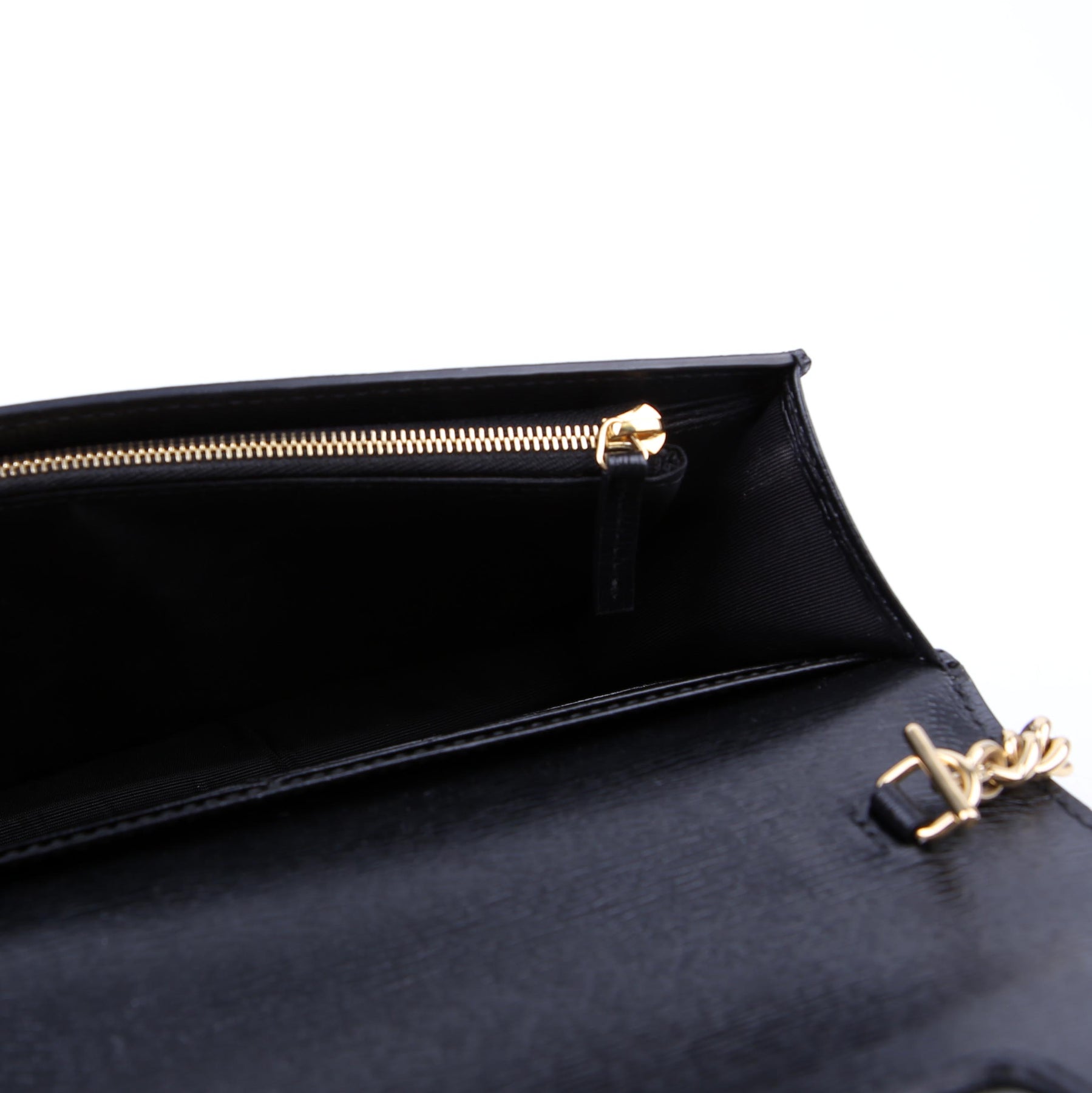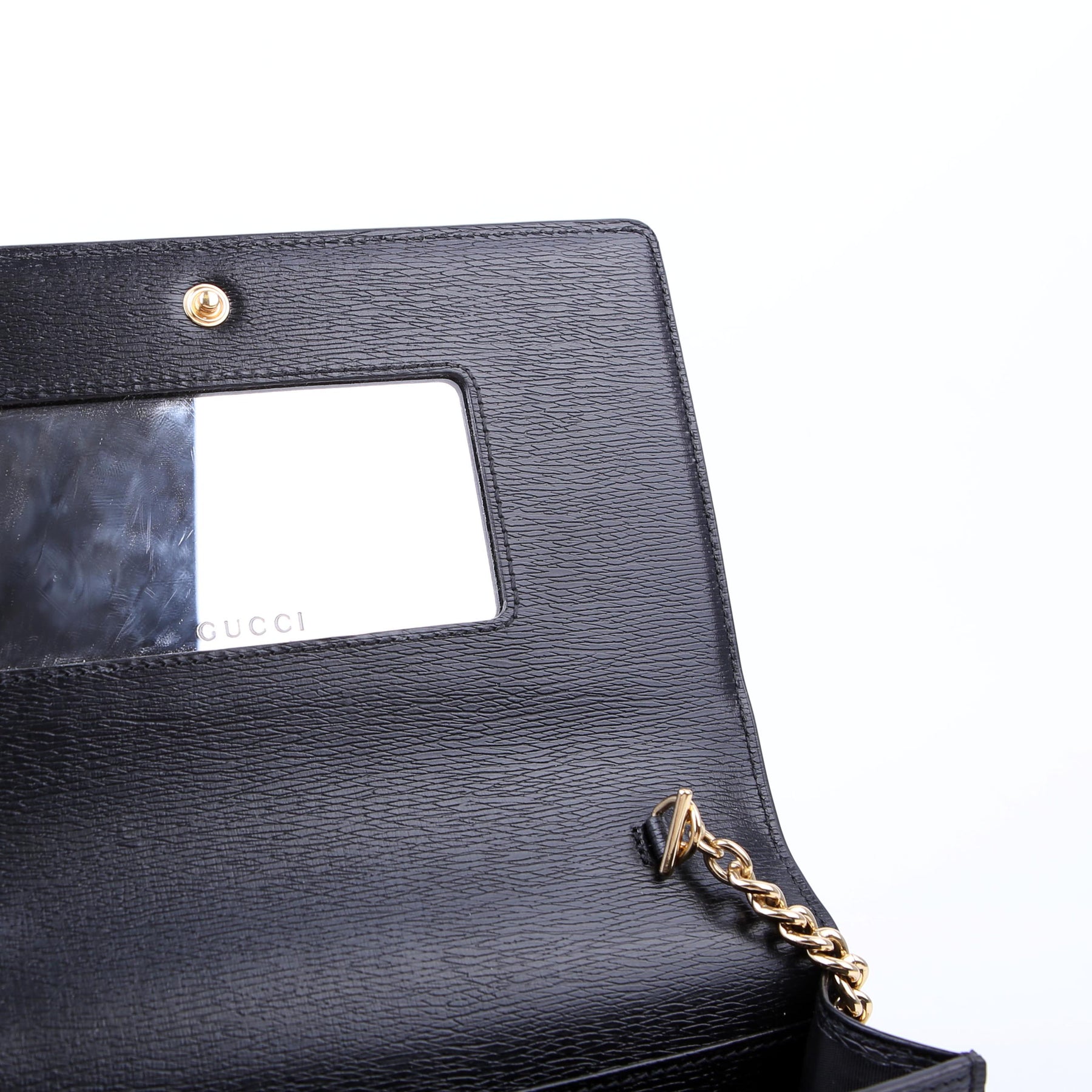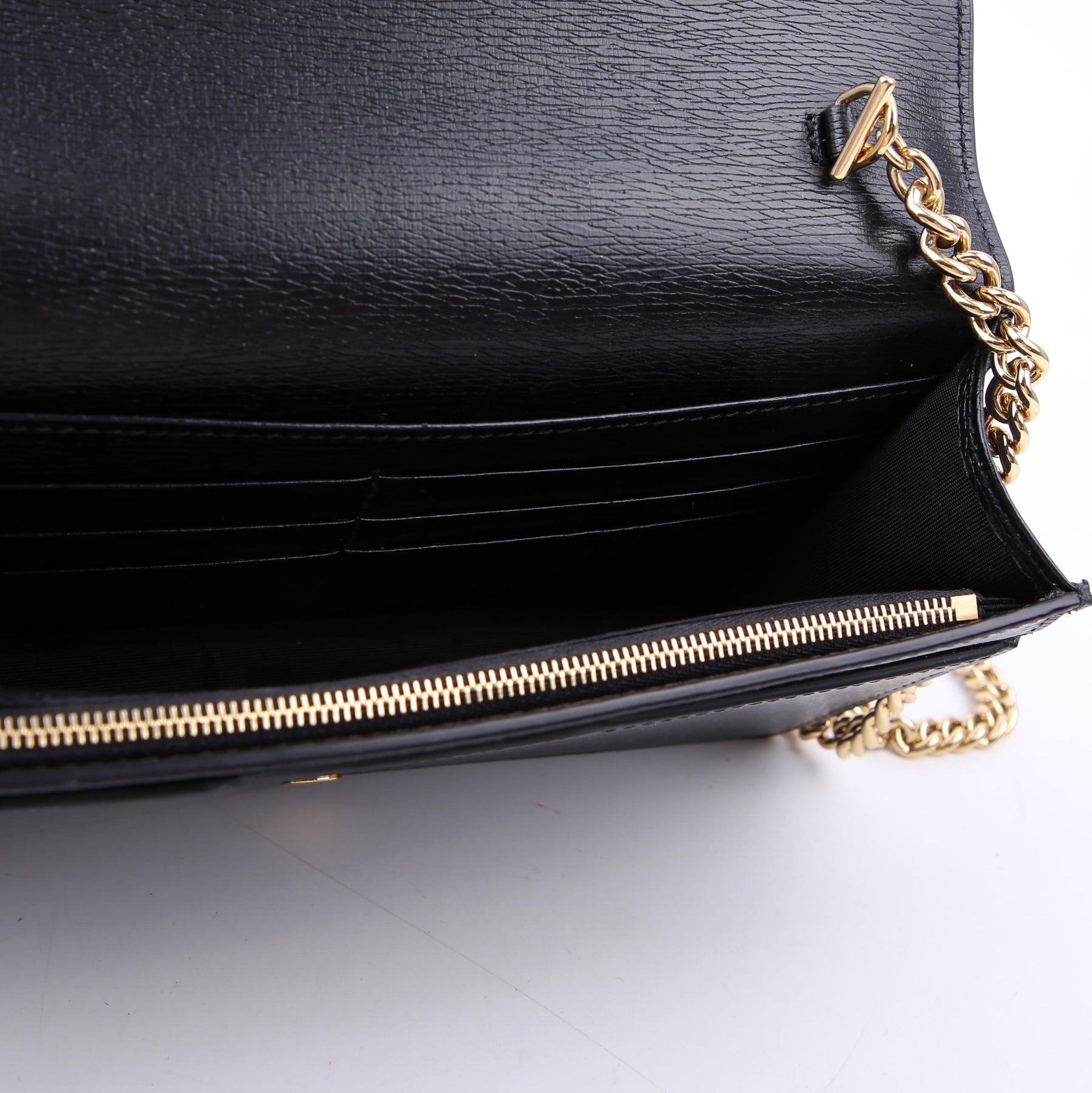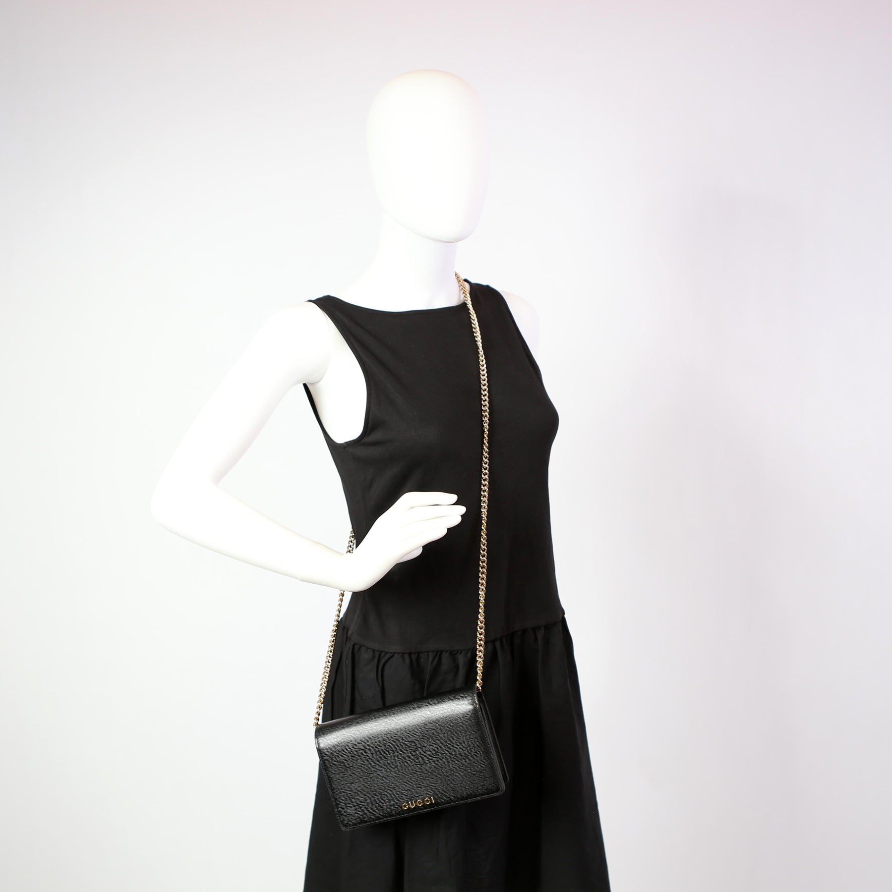 This pre-owned Gucci Script Logo Chain Wallet is guaranteed 100% authentic. The exterior is in the classic Gucci leather.
