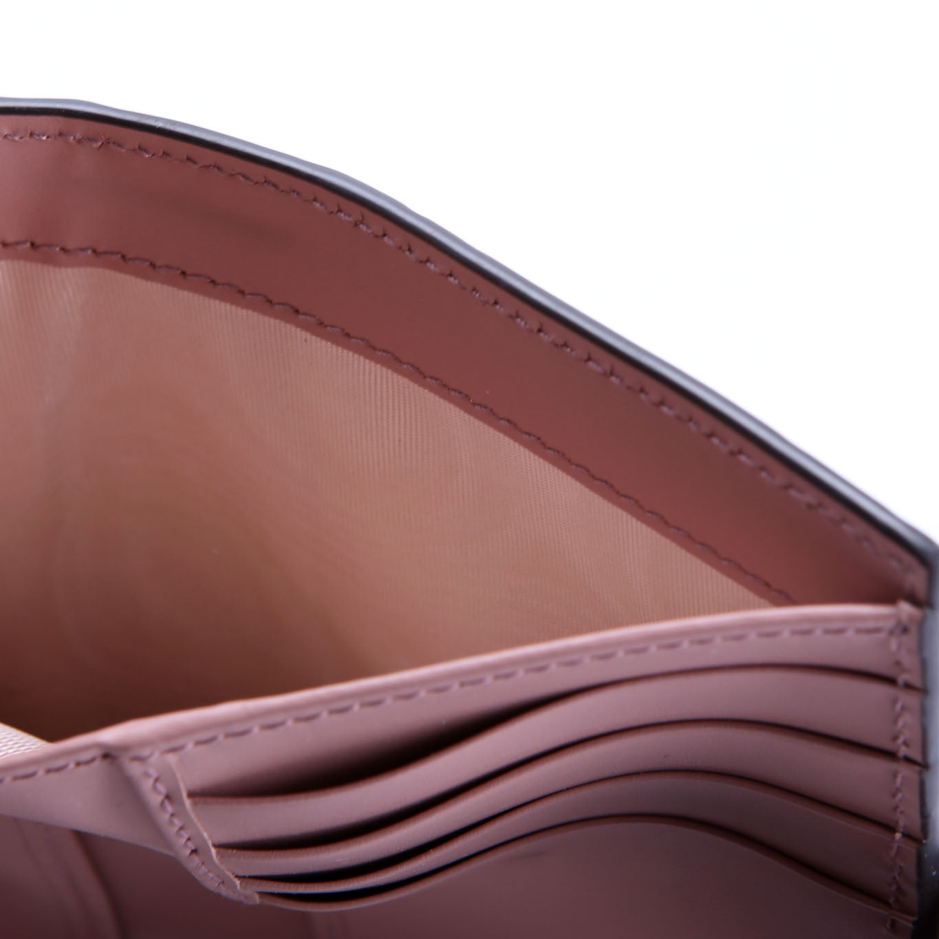 Interior: The interior leather shows marks and indentions from the hardware. It features ten card slots, one bill slot, and one zip closure pocket.