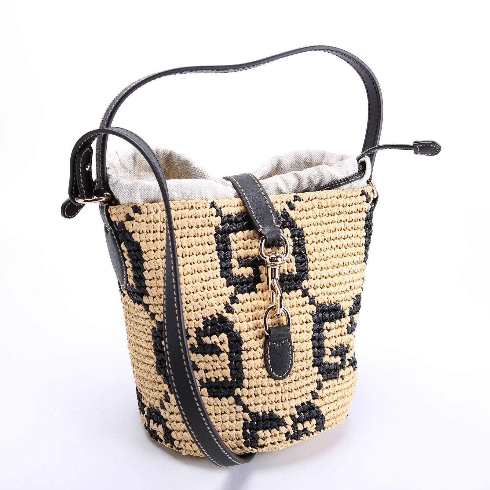 816284 GG Woven Raffia Mini Bucket Bag Tan/Black