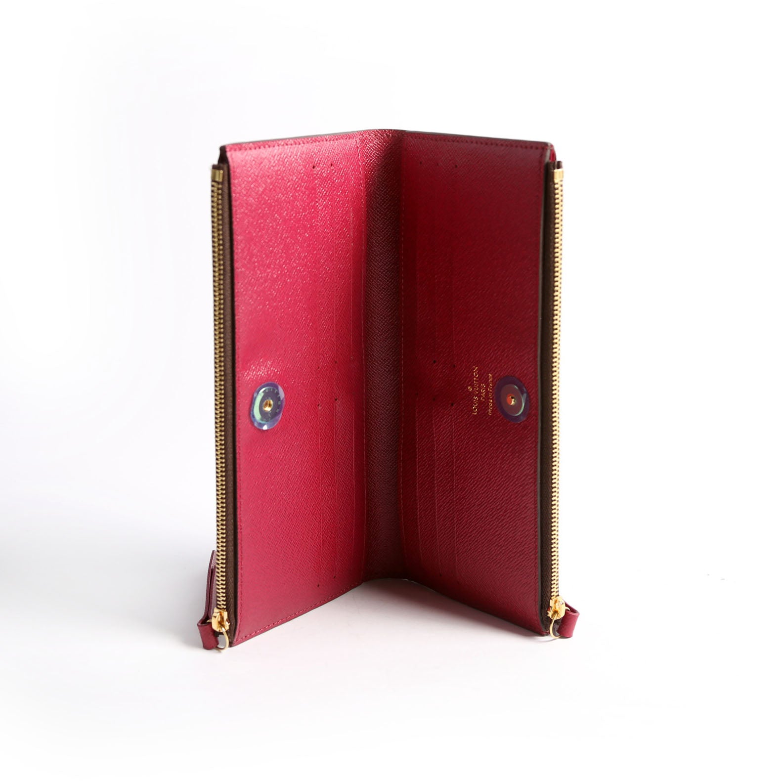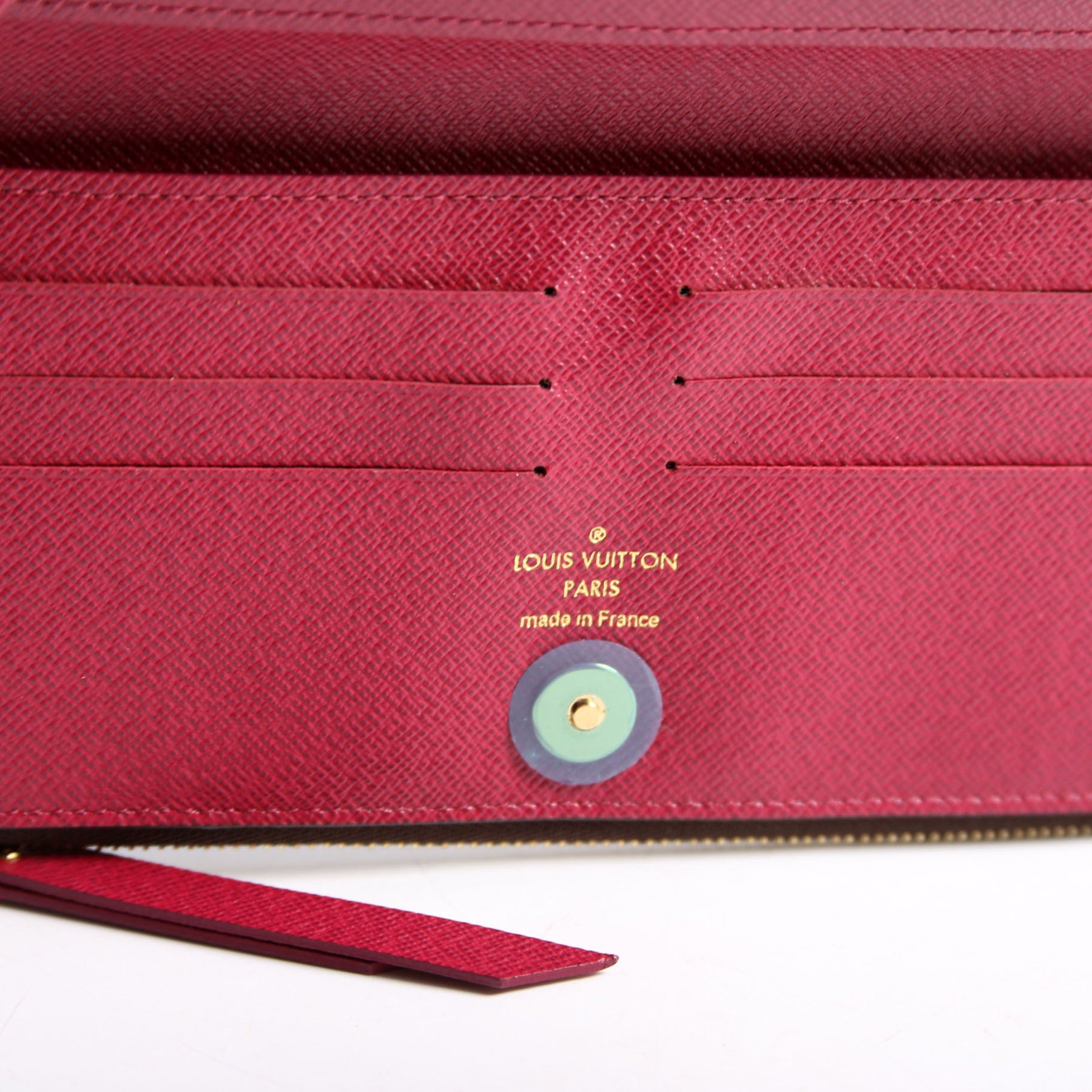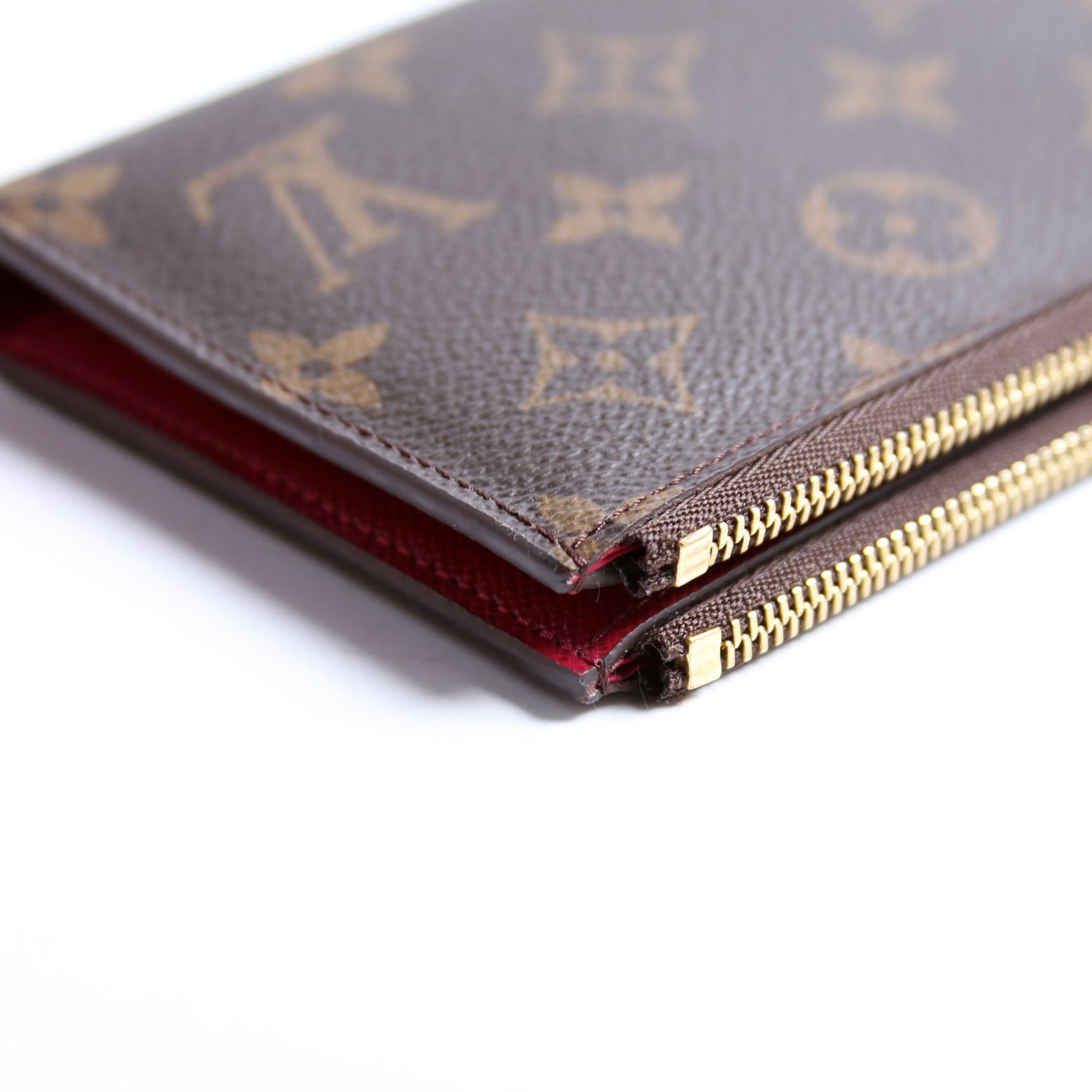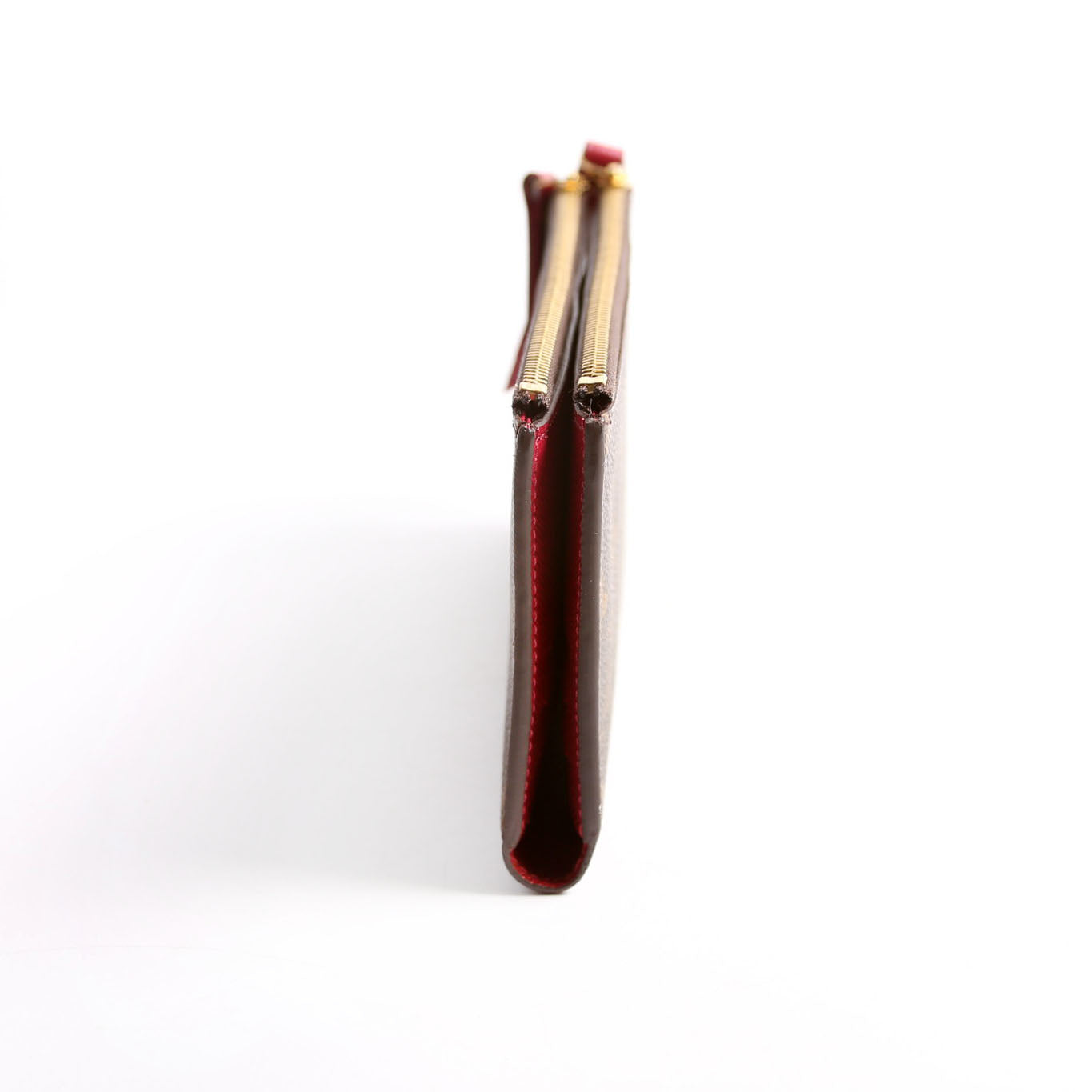 Interior: The interior is free from wear. It features The interior features twelve card slots, two bill slots, and two zip closure coin pouches.