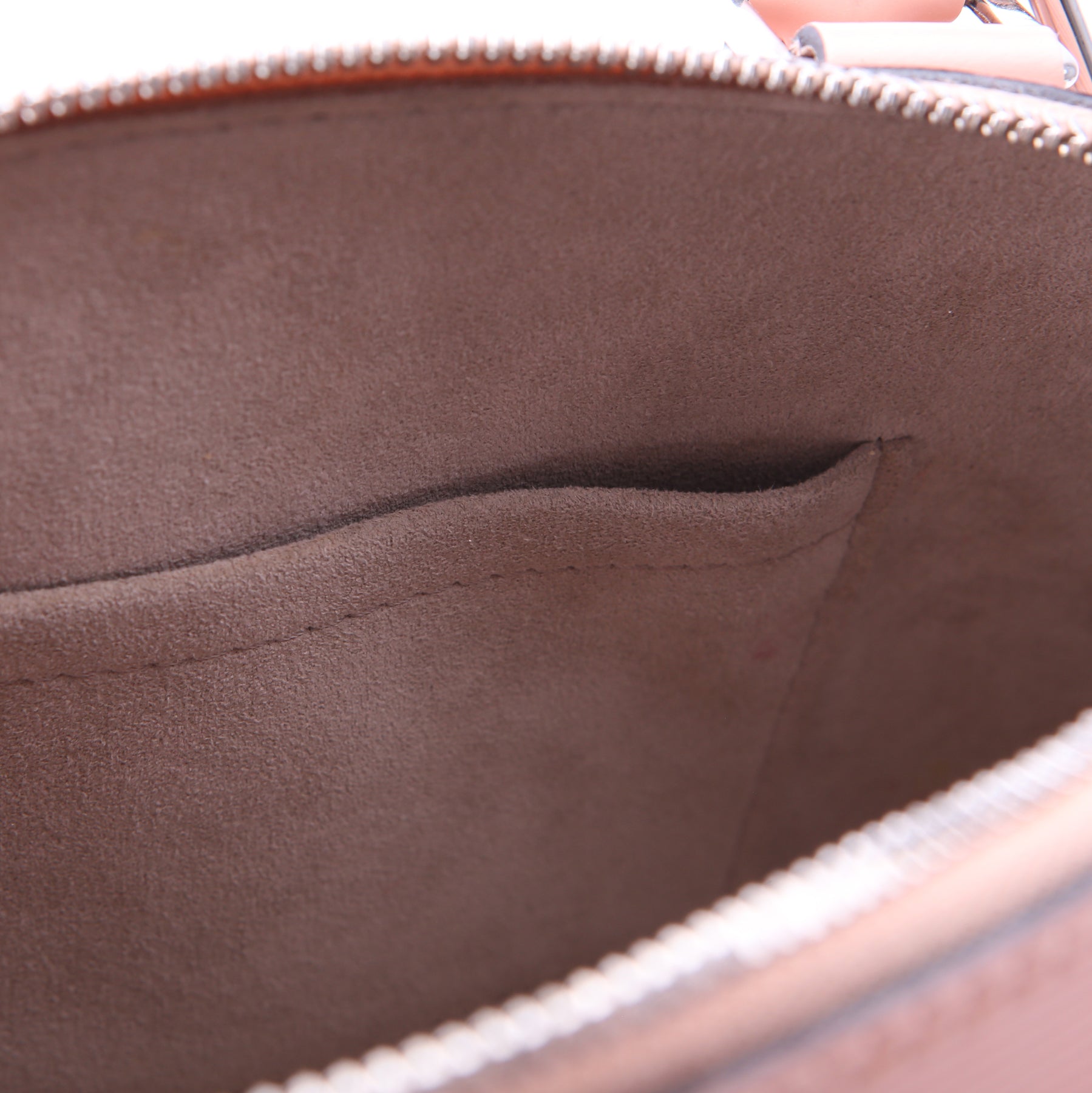 Interior: The interior shows minor discoloration and stain, and features one open pocket.