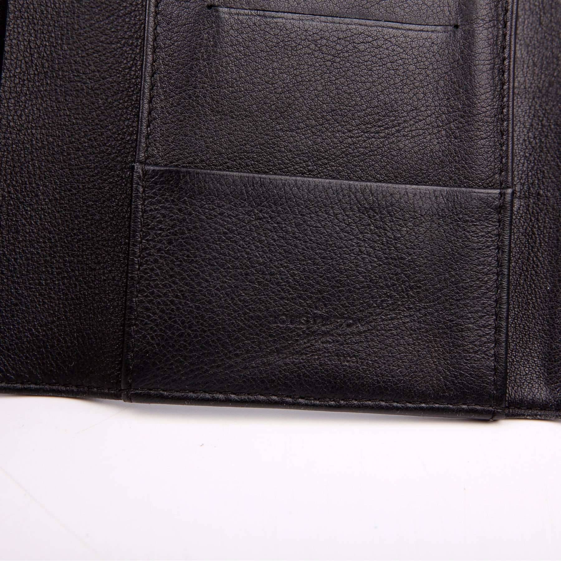 Interior: The interior leather shows wear throughout. It features eighteen card slots, three bill slots, one ID slot, and one zipper closure pocket.