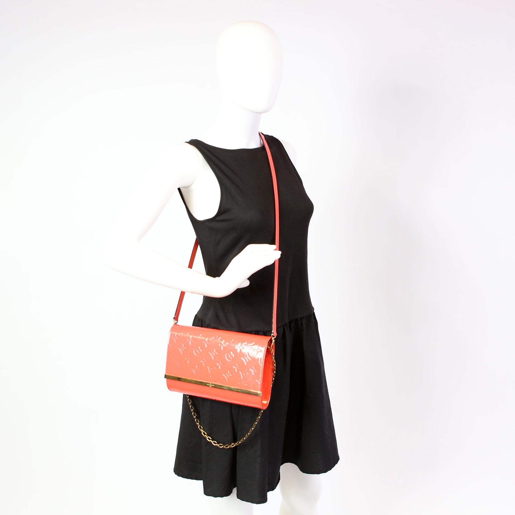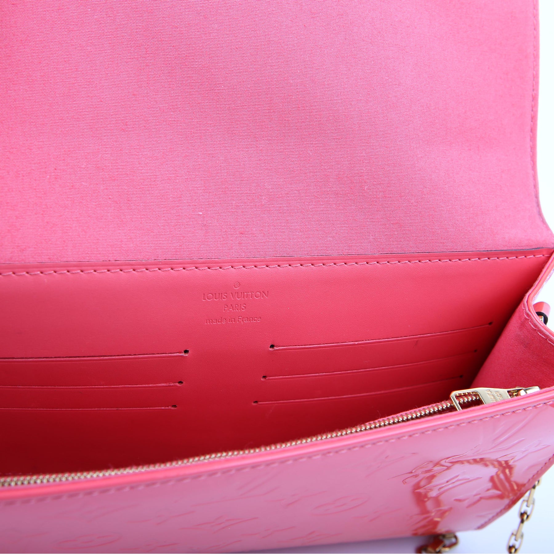 This pre-owned Louis Vuitton Ana Clutch is guaranteed 100% authentic. The exterior is in the classic Louis Vuitton Vernis.