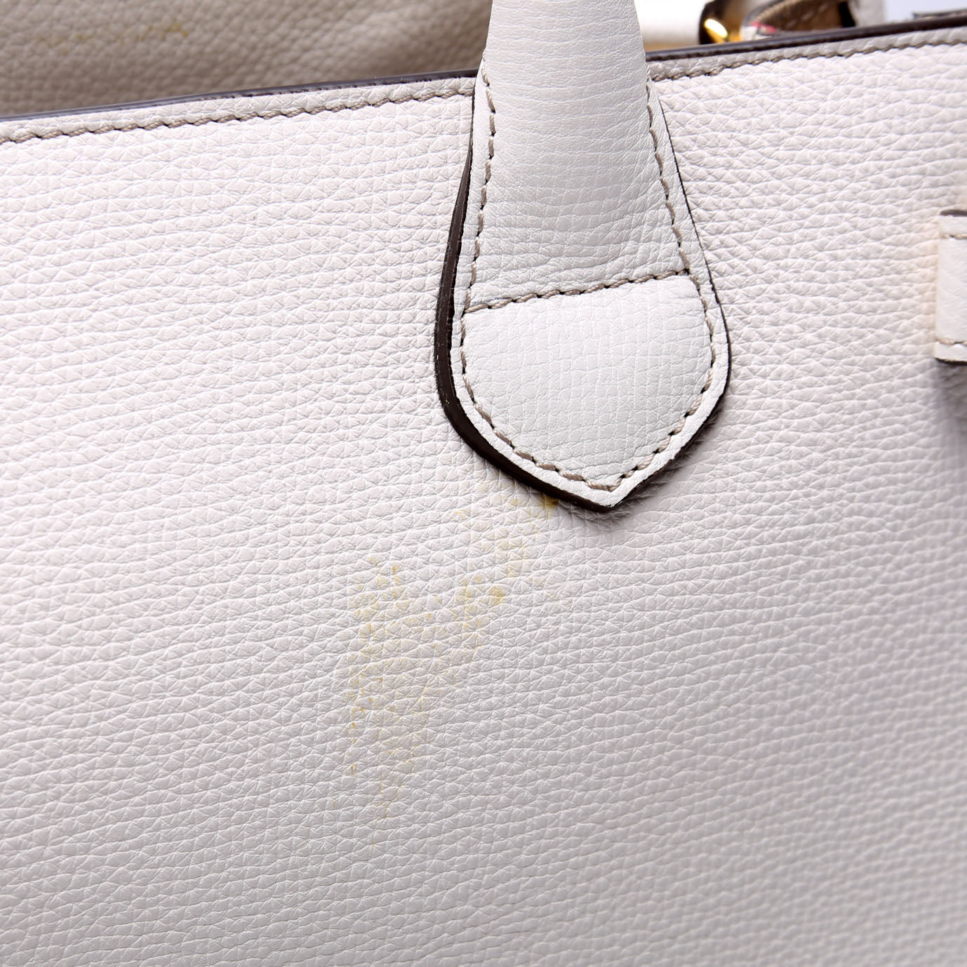 Exterior: The exterior leather is free of any rips or cracks, there are minor marks and stains throughout. The corners and edges show light wear.