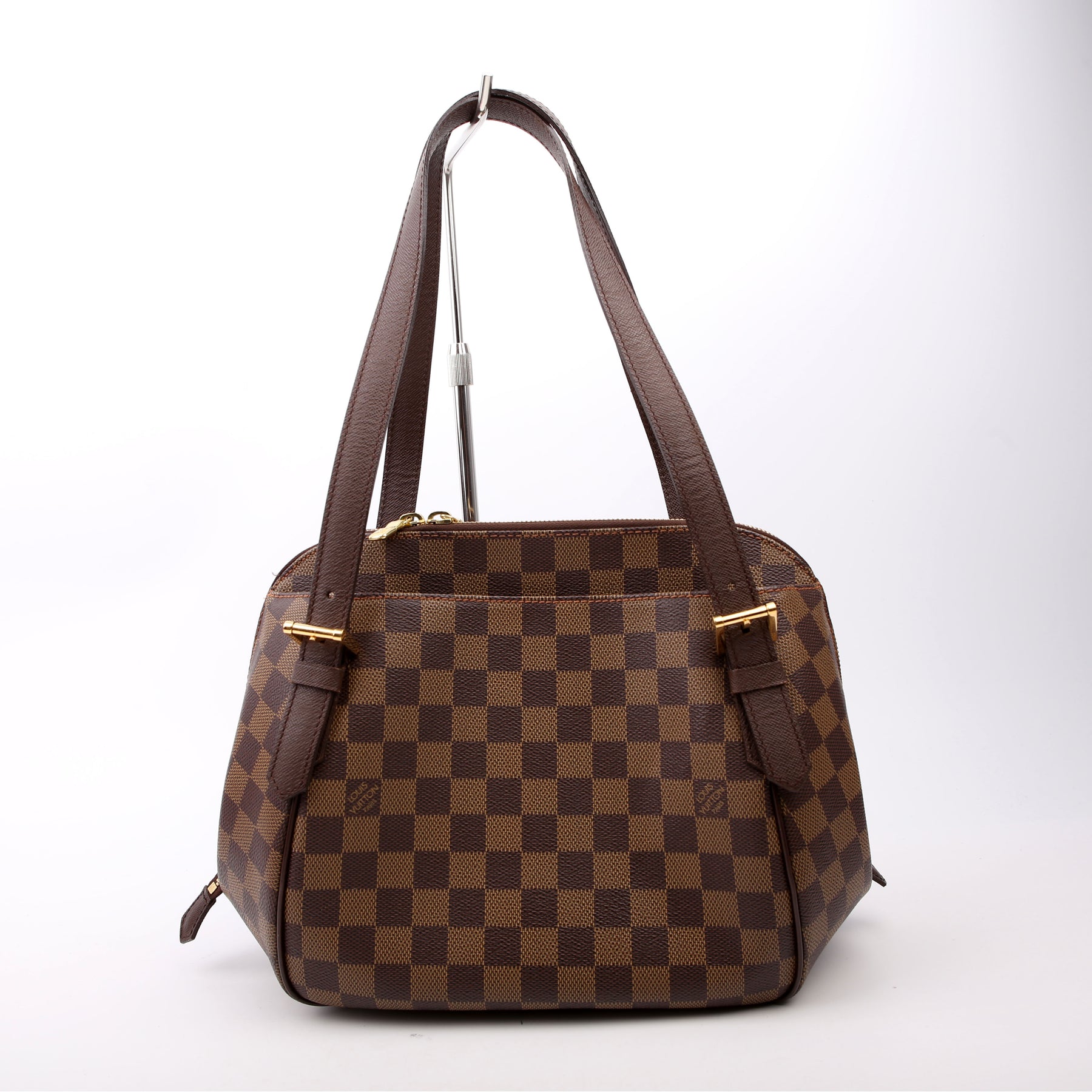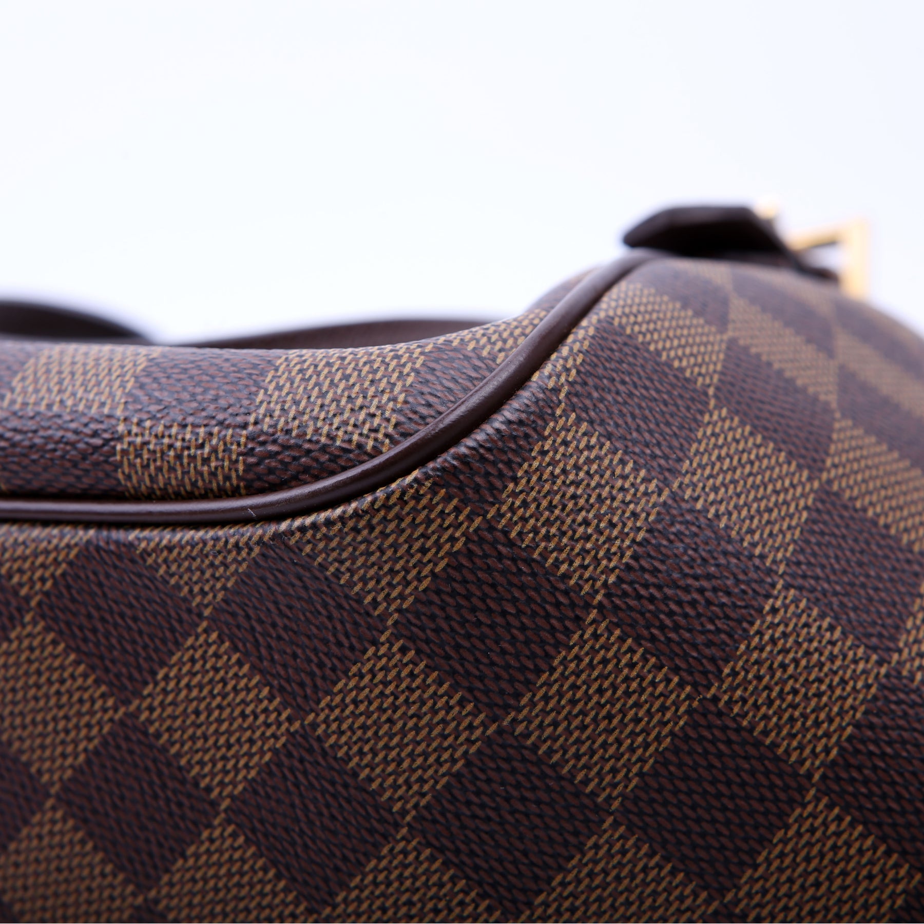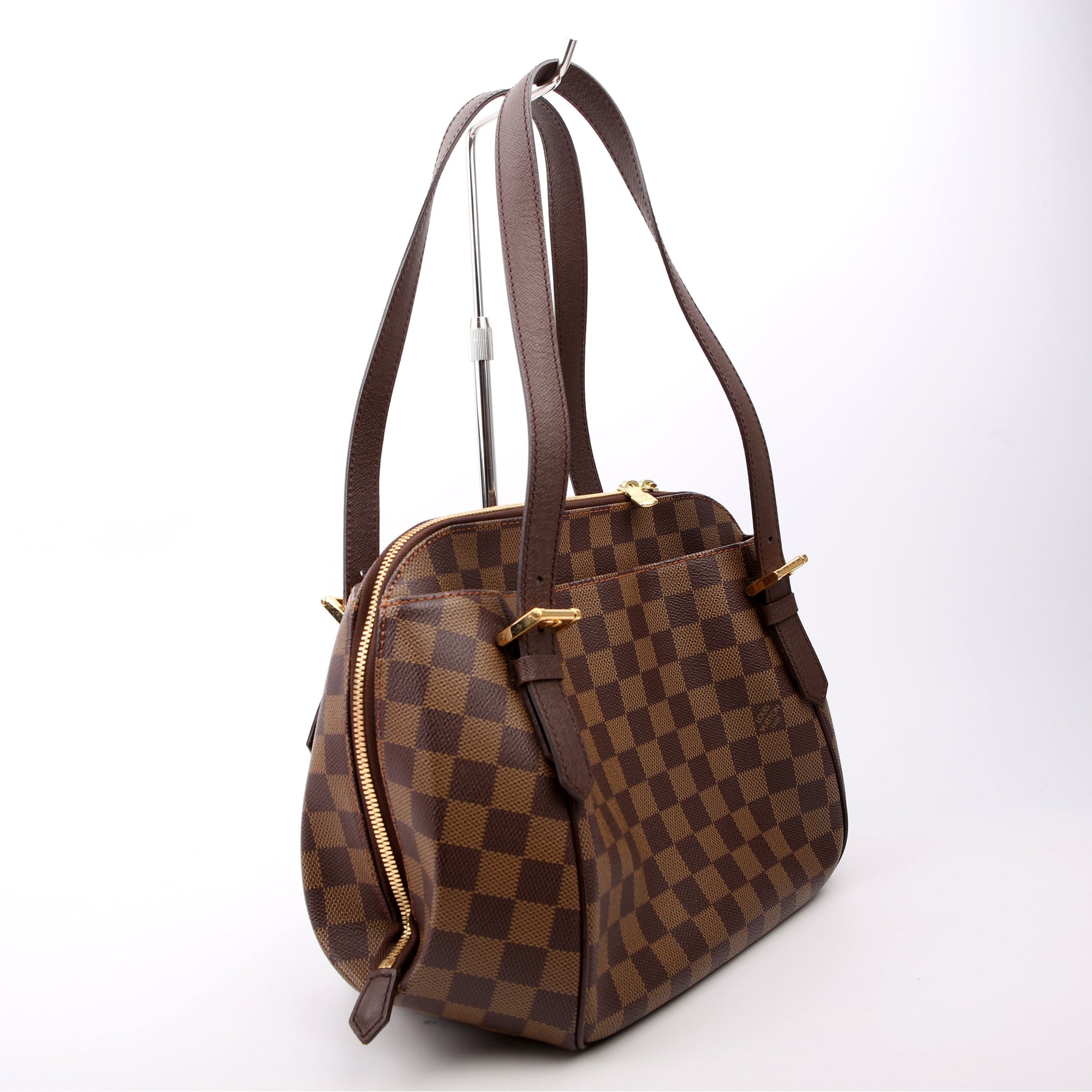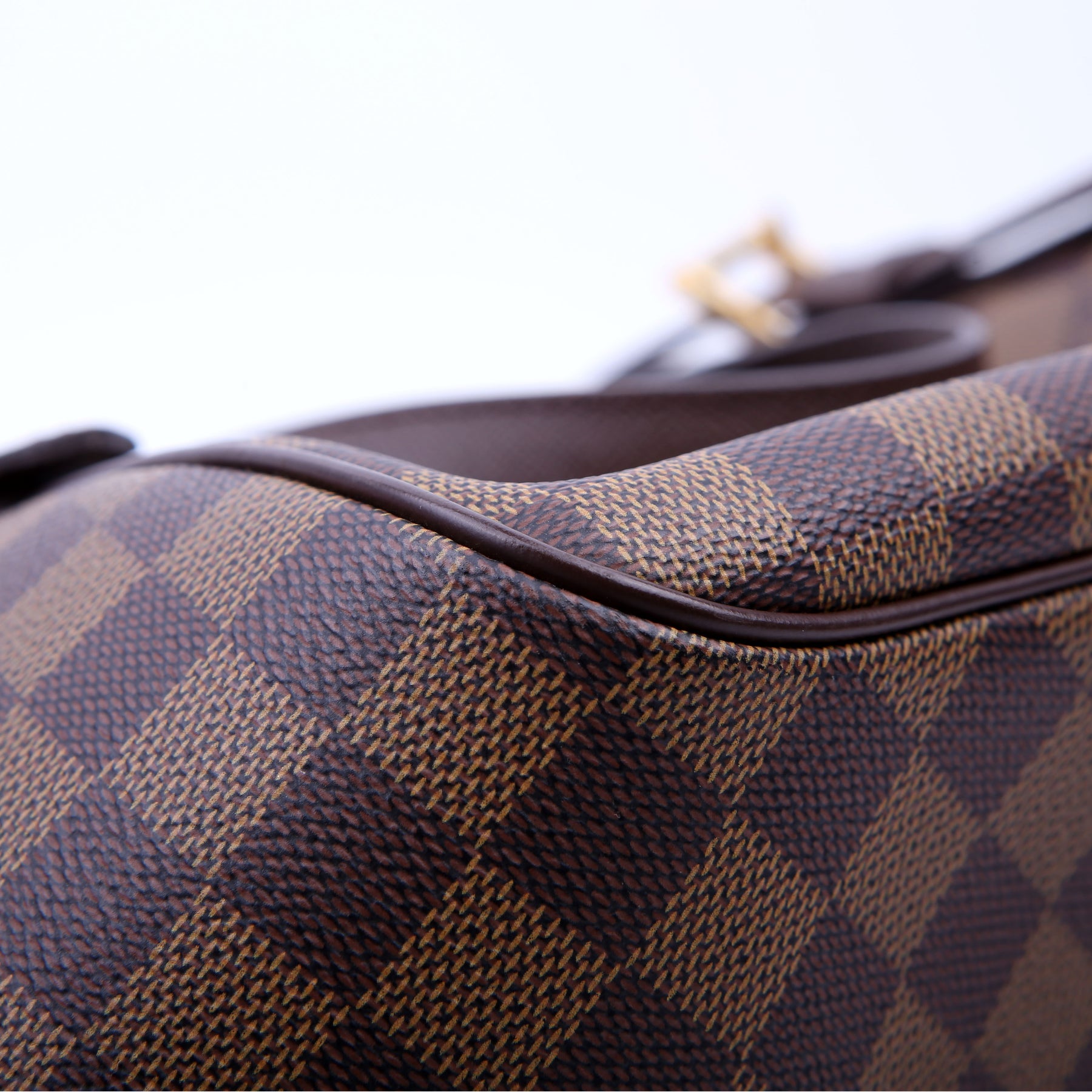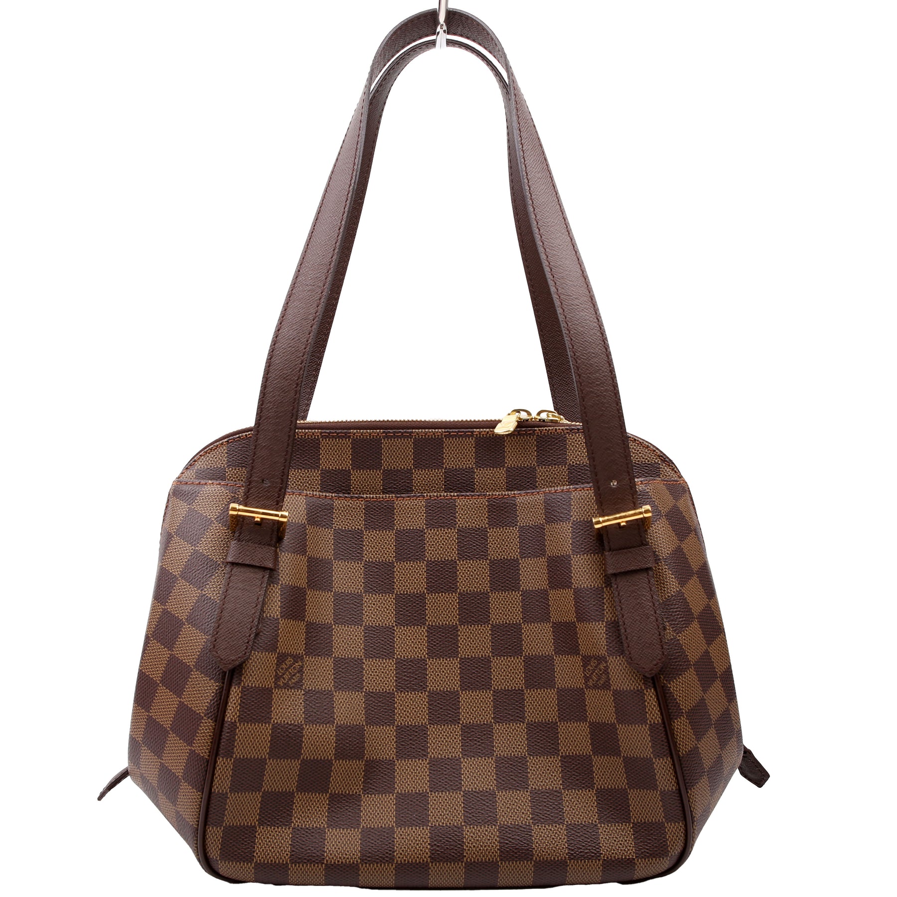 This pre-owned Louis Vuitton Belem MM is guaranteed 100% authentic. The exterior is in the classic Louis Vuitton Damier Ebene coated canvas.