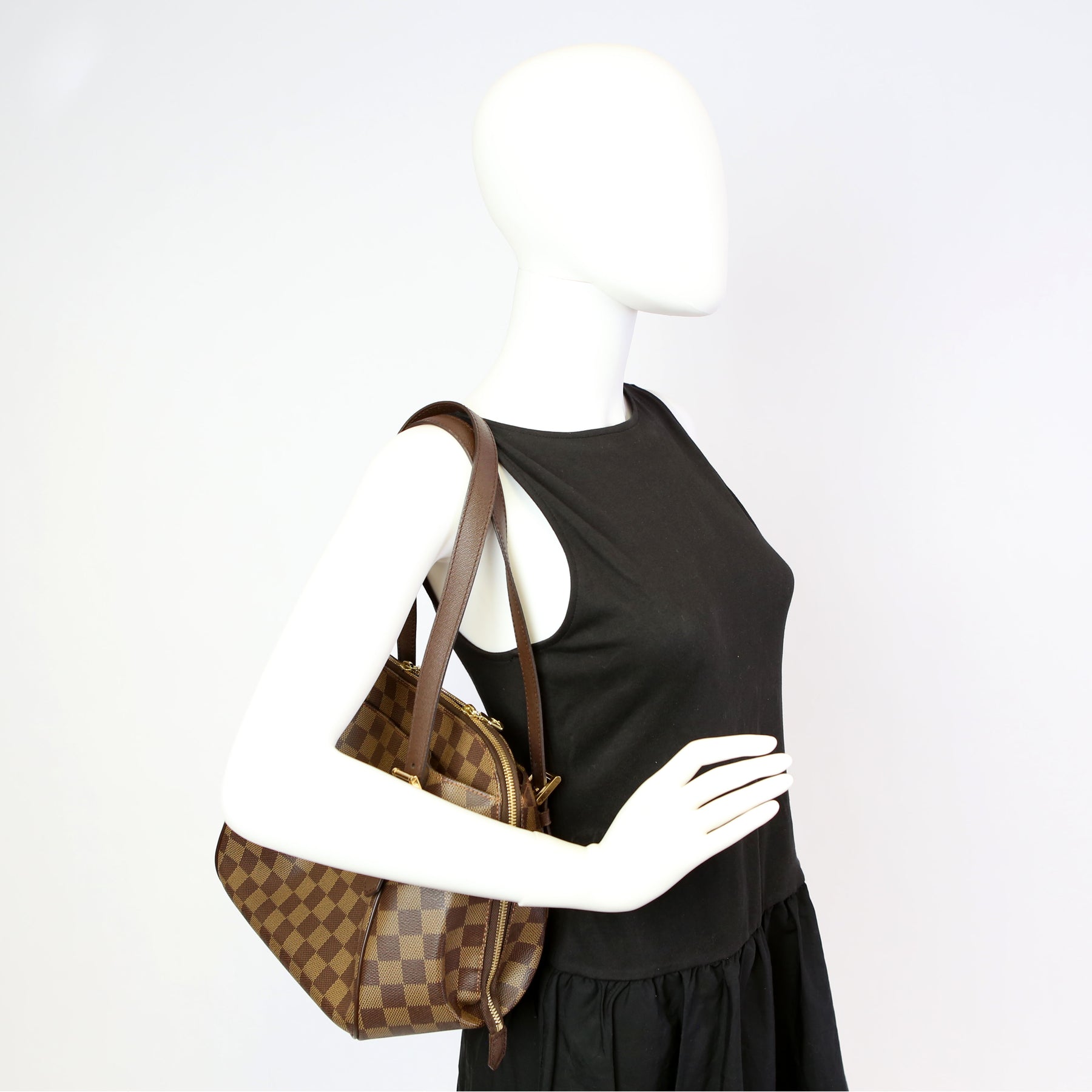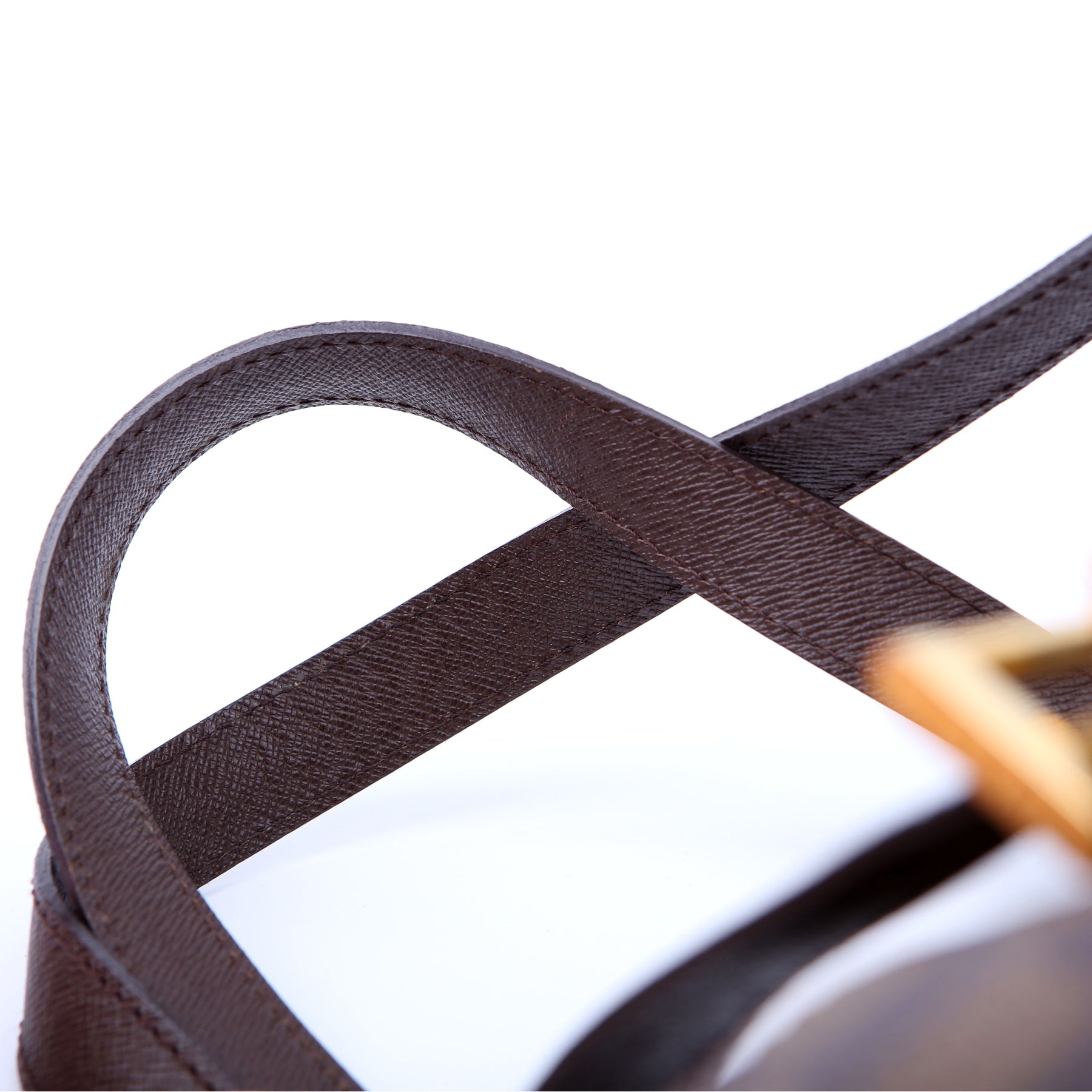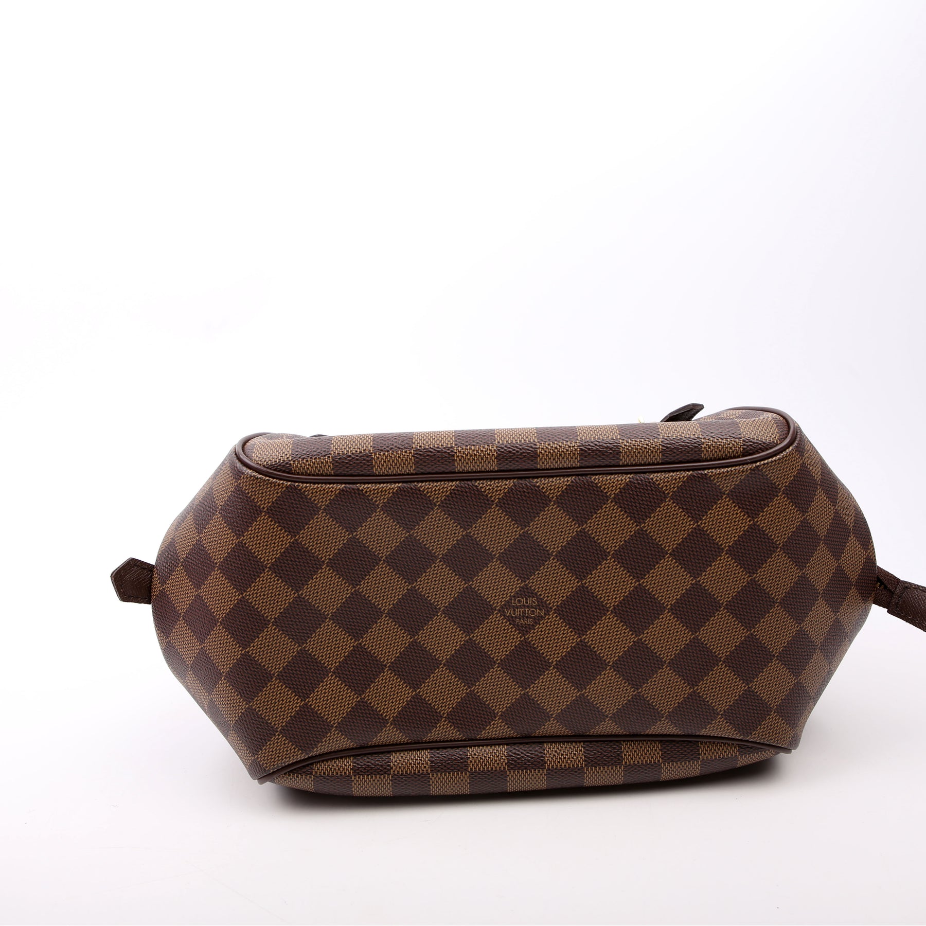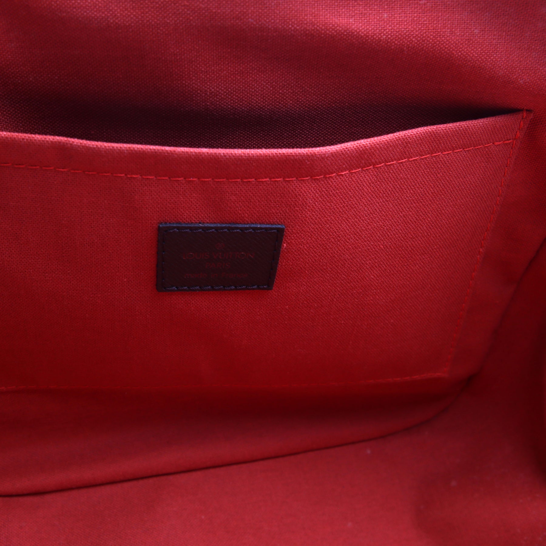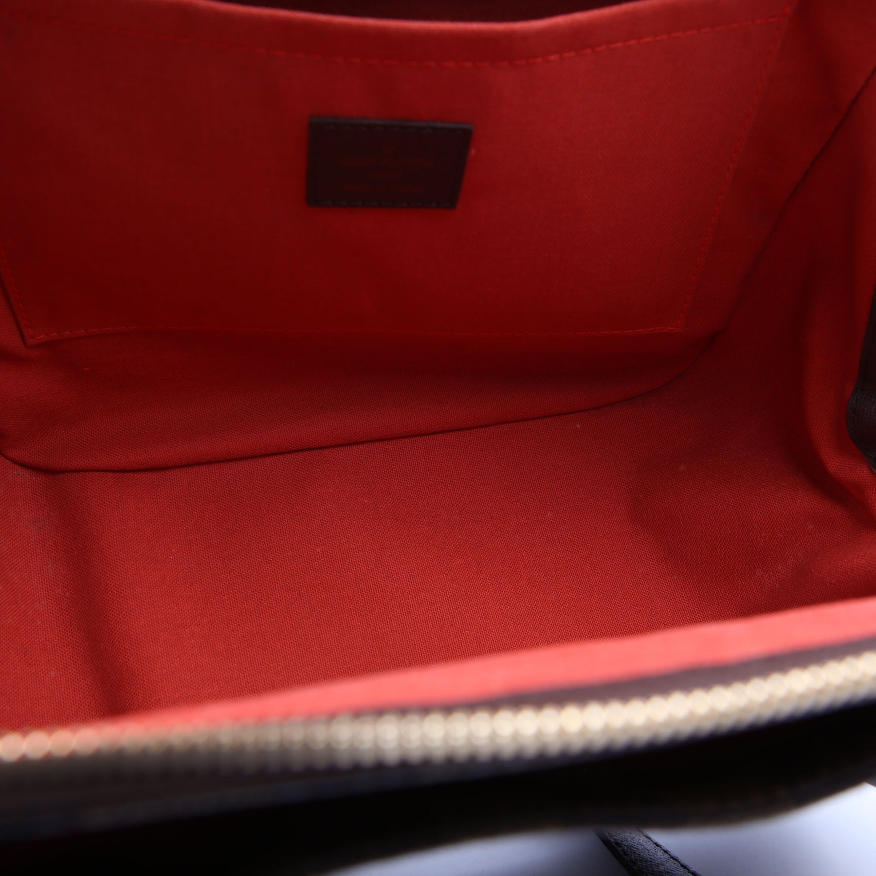 This pre-owned Louis Vuitton Belem MM is guaranteed 100% authentic. The exterior is in the classic Louis Vuitton Damier Ebene coated canvas.