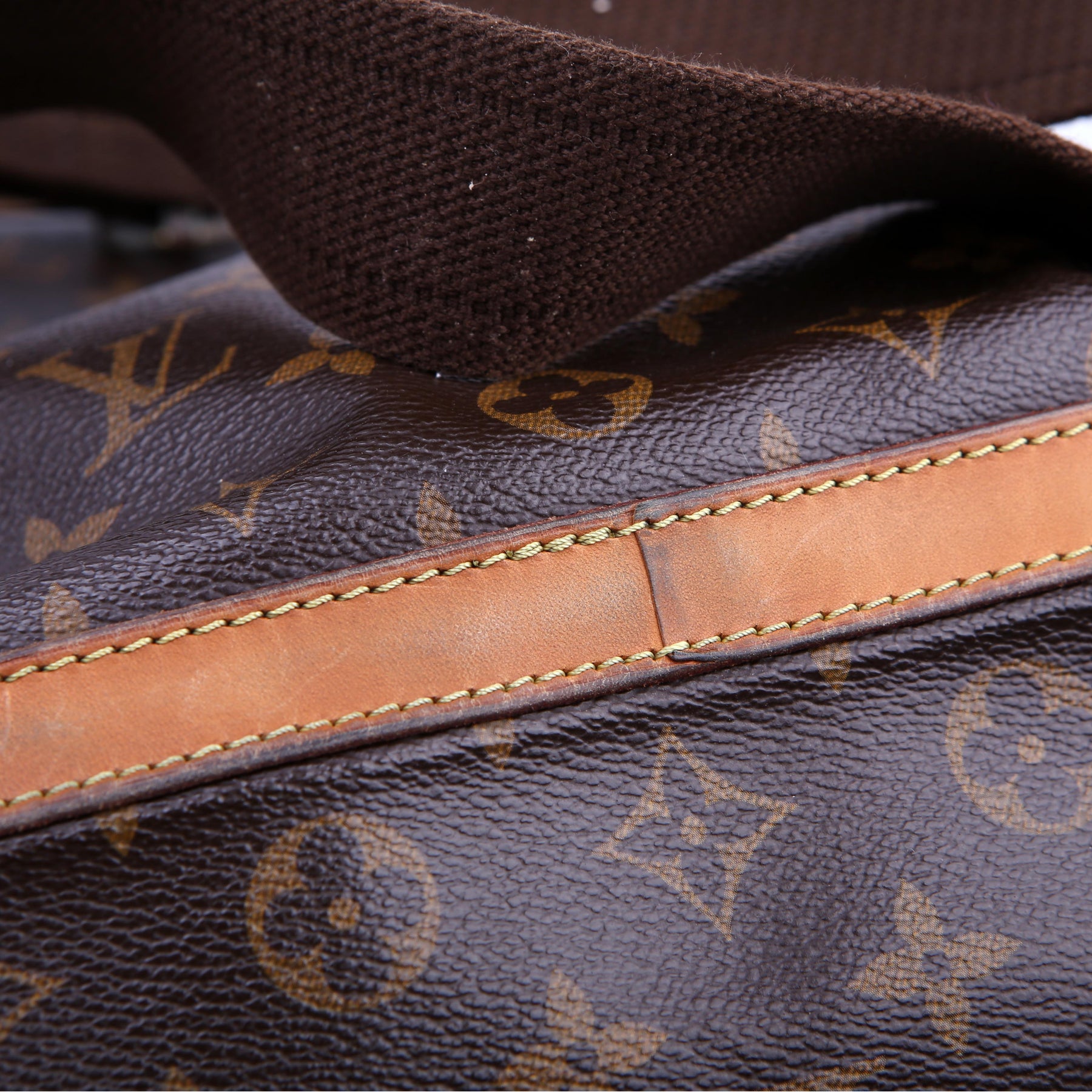 Handle: The leather handle shows minor wear and discoloration.