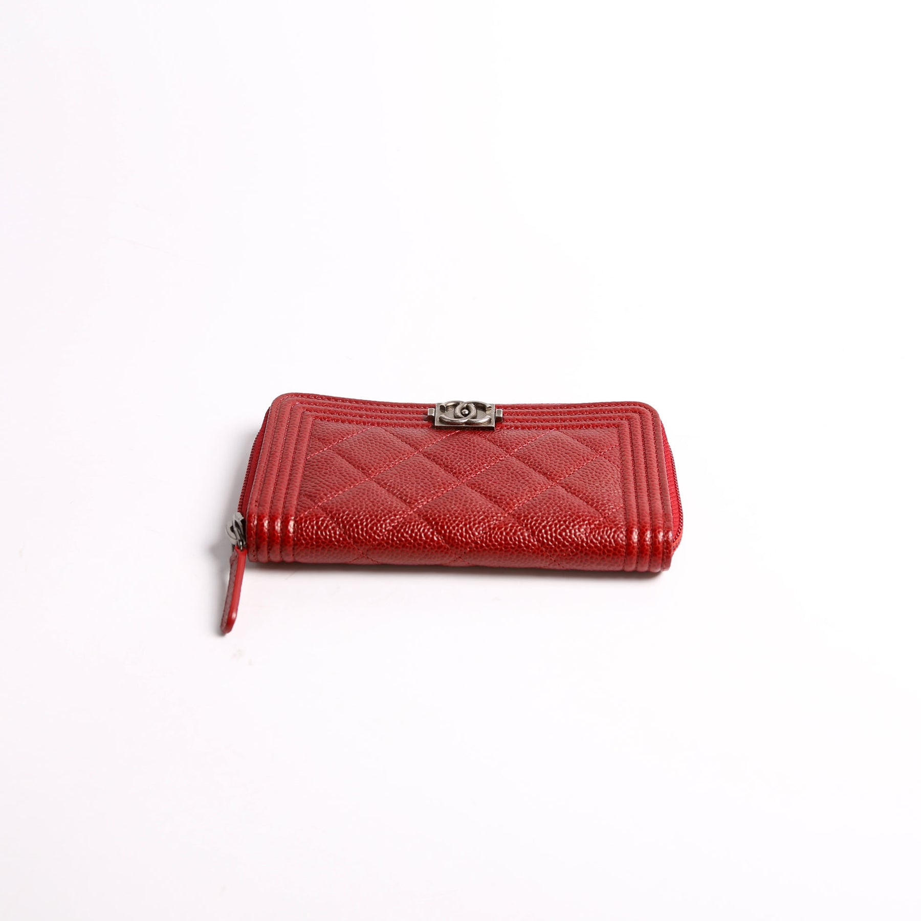 This pre-owned Chanel Boy Wallet Zip Around Small Quilted Caviar is guaranteed 100% authentic.