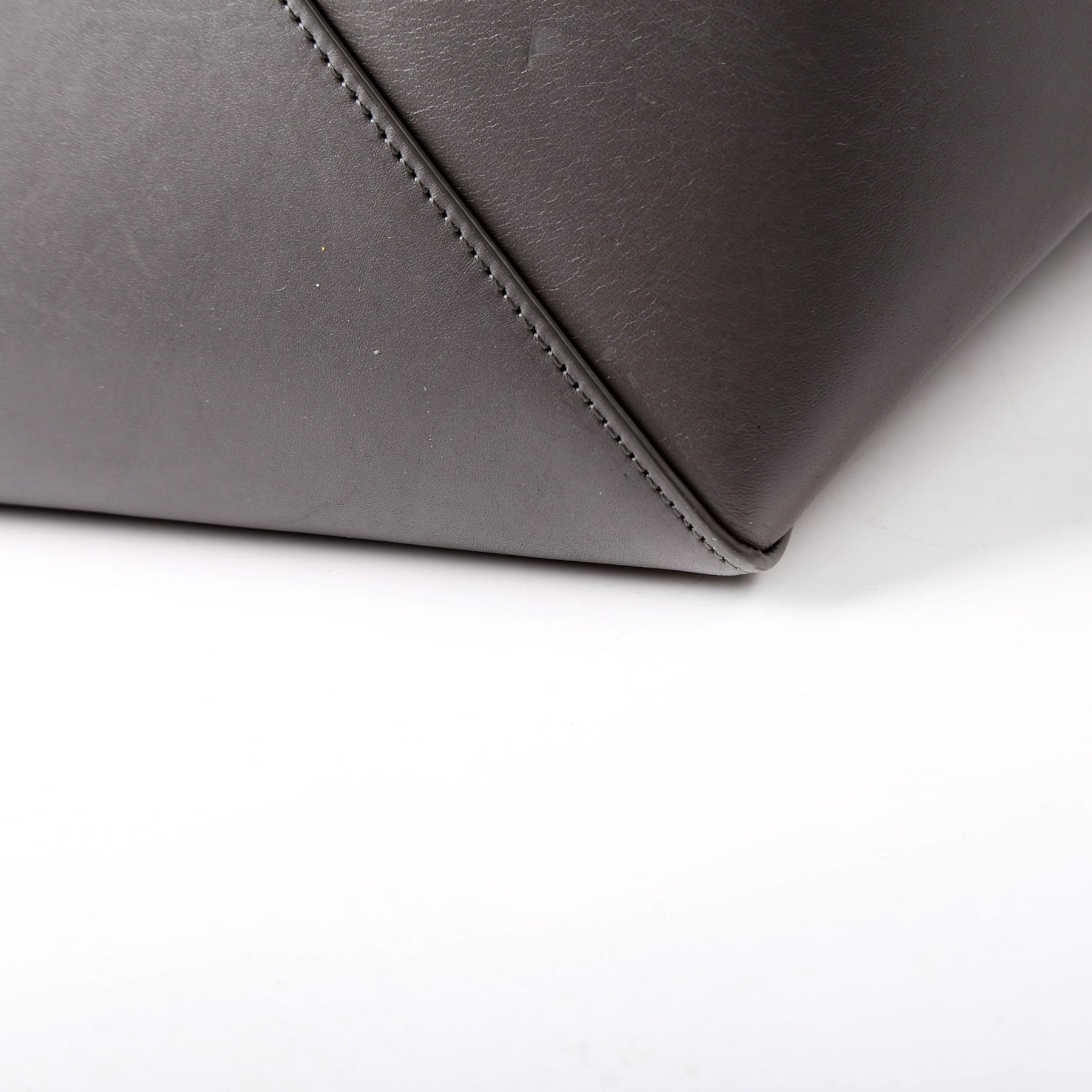 Exterior: The exterior leather shows light scuffs throughout. The corners show wear and rubbing. The base shows light marks.