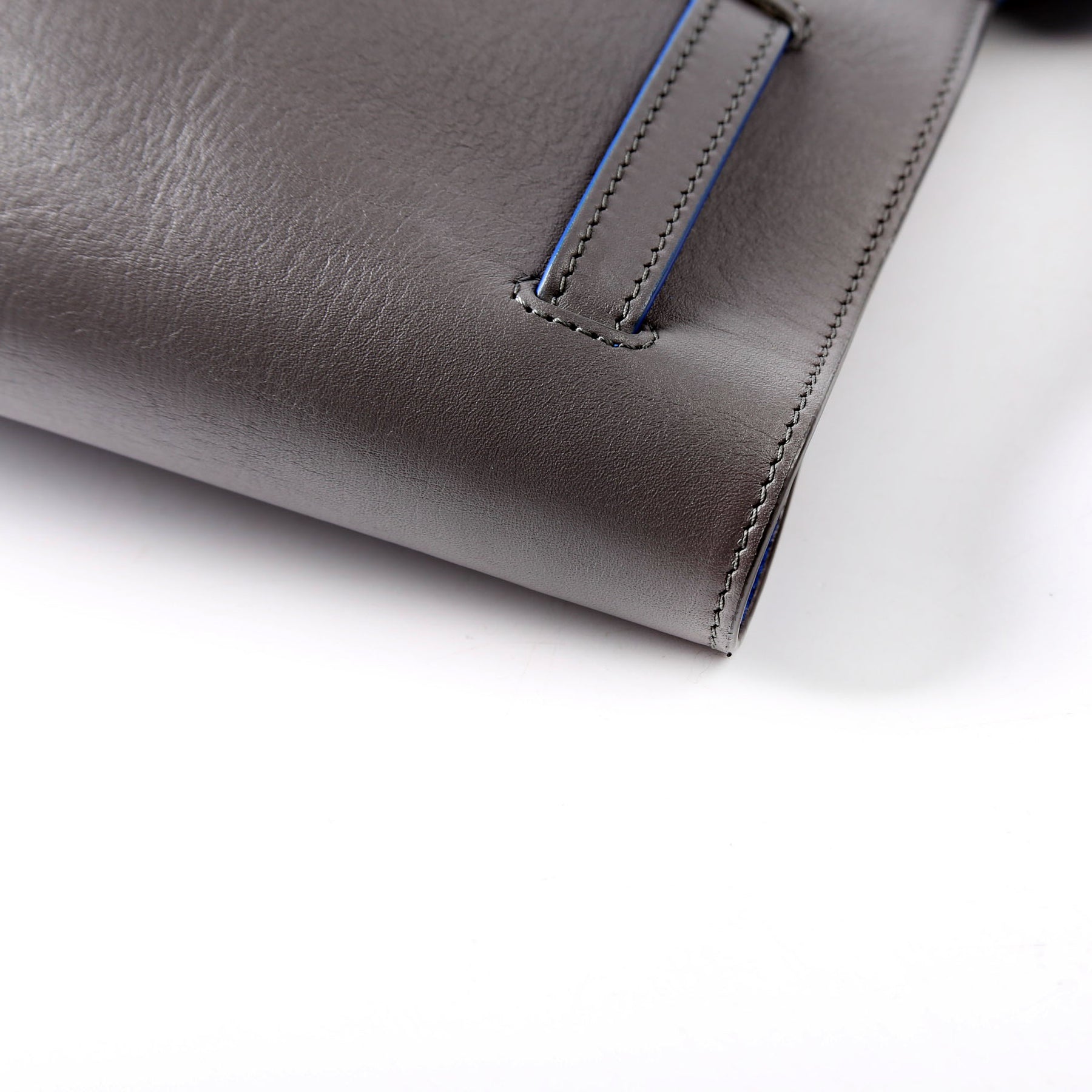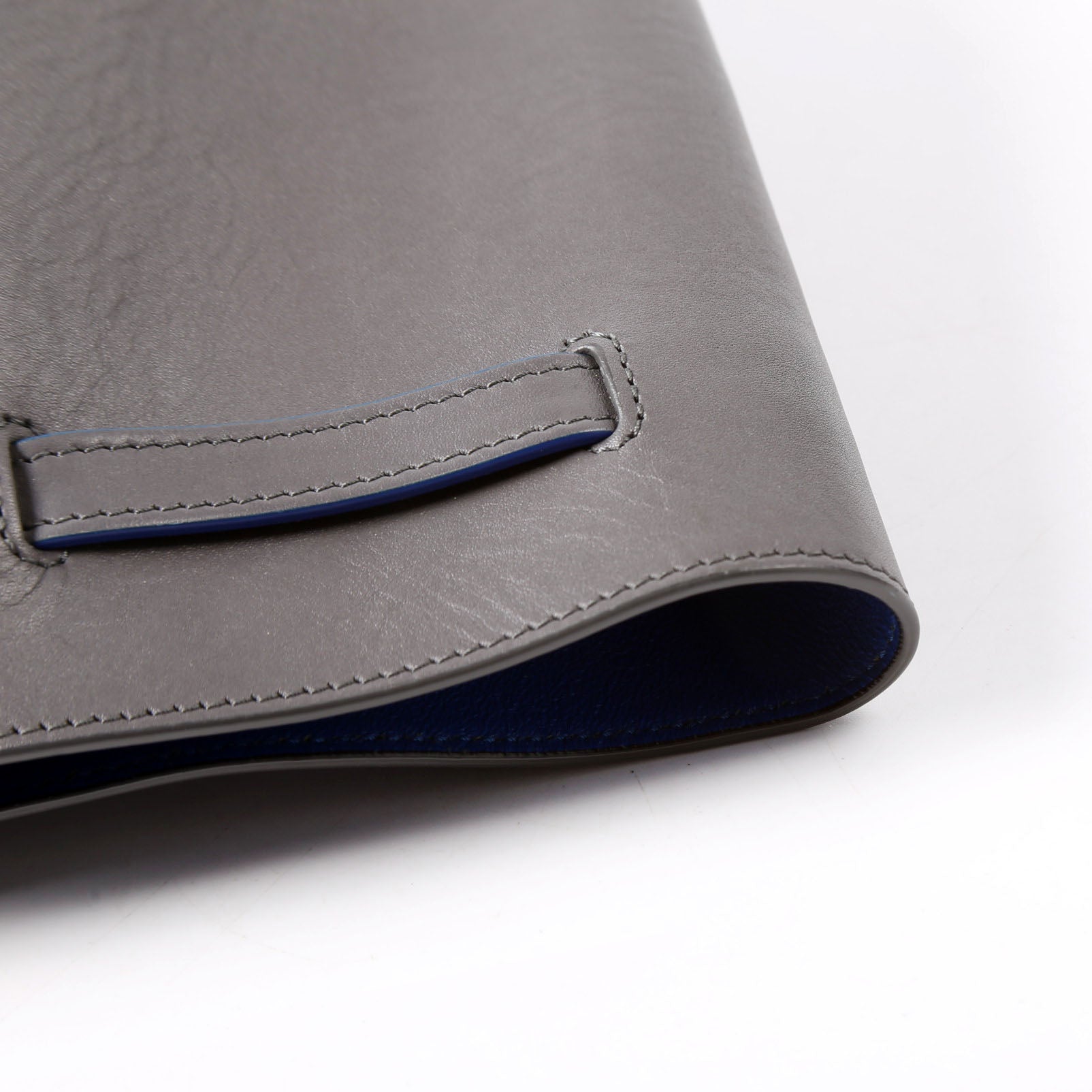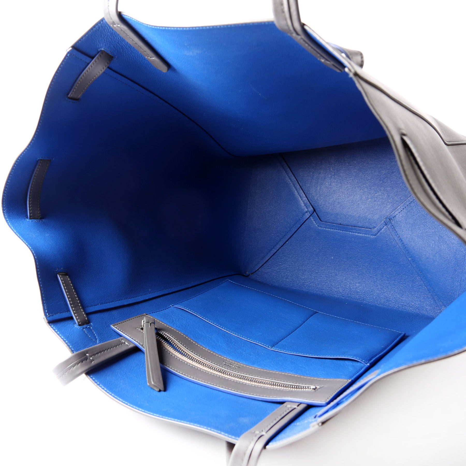 Interior: The interior shows light scratches to the leather. It features two open pockets and one zip closure pocket.