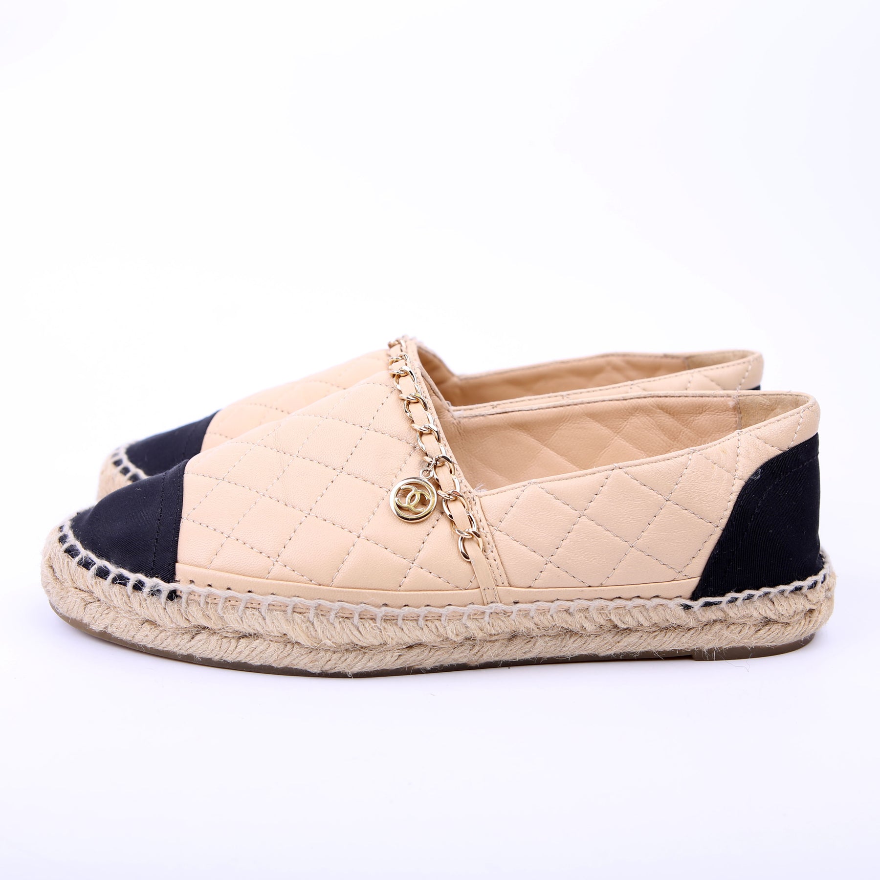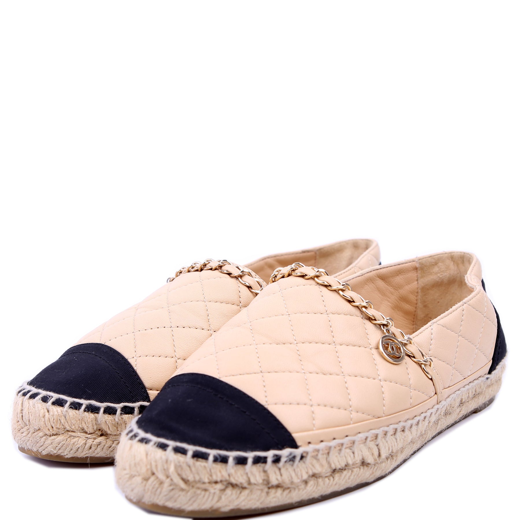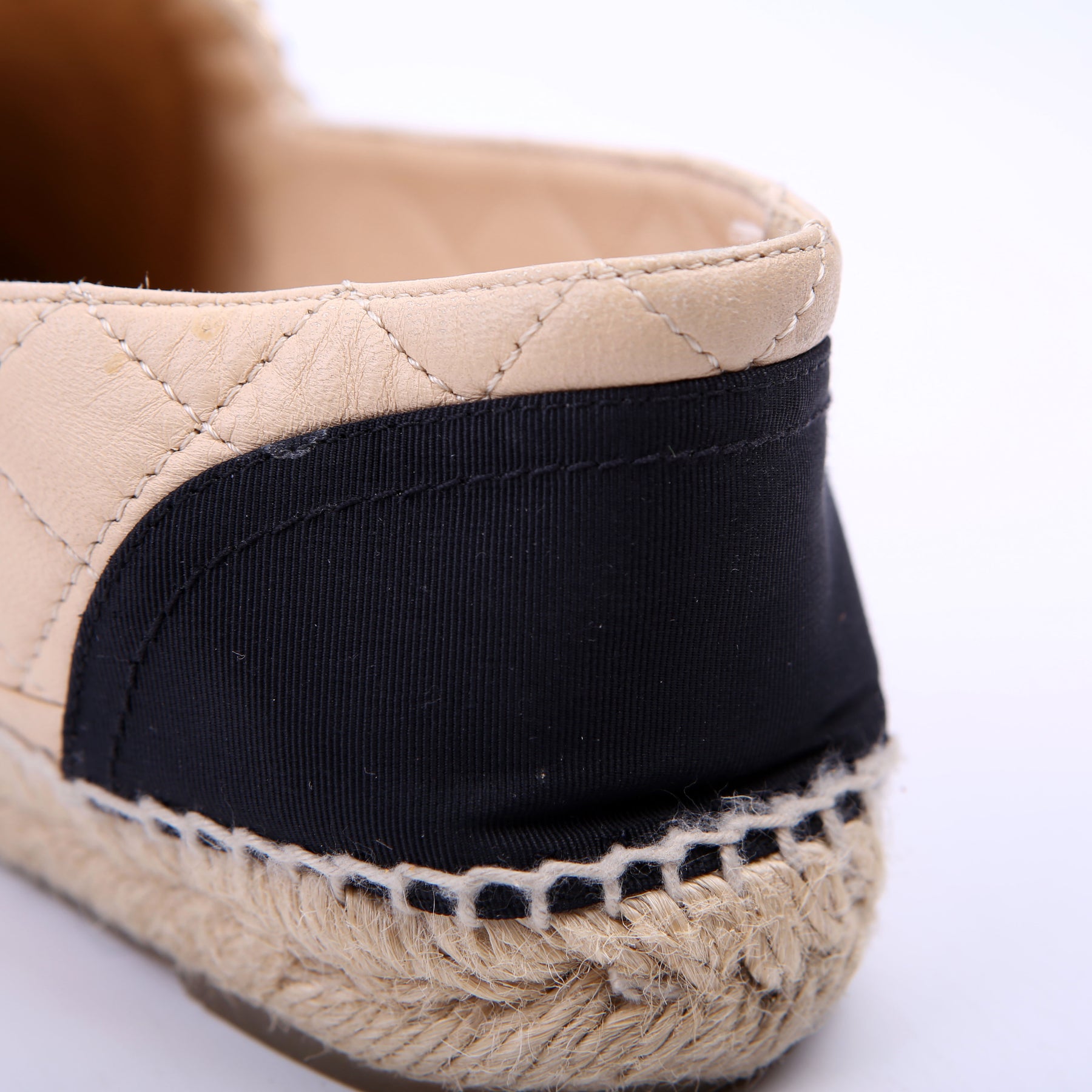 These pre-owned Chanel CC Cap Toe Quilted Espadrilles are guaranteed 100% authentic.