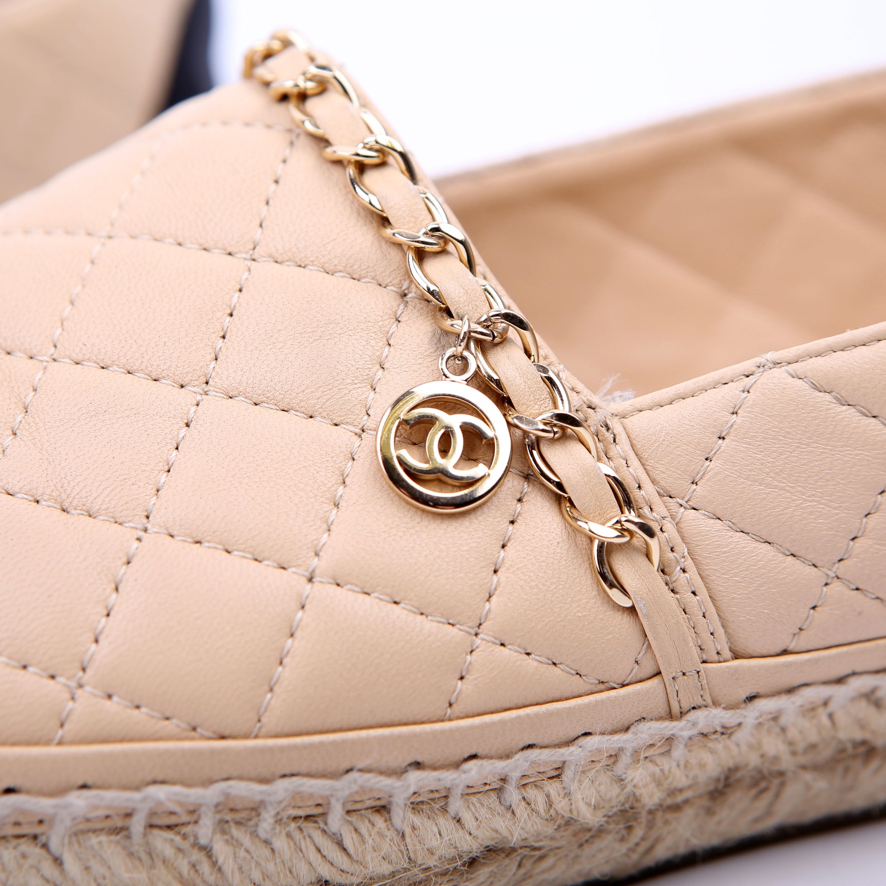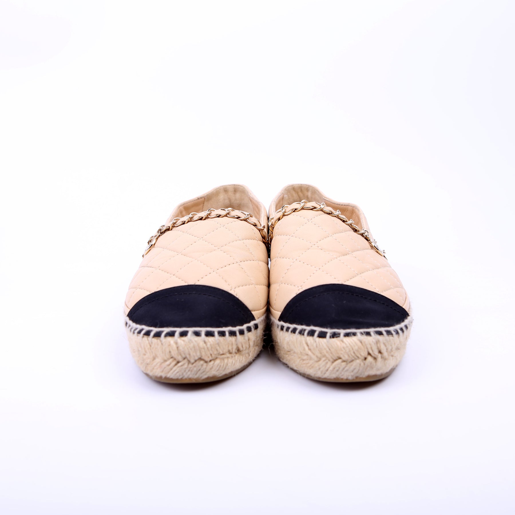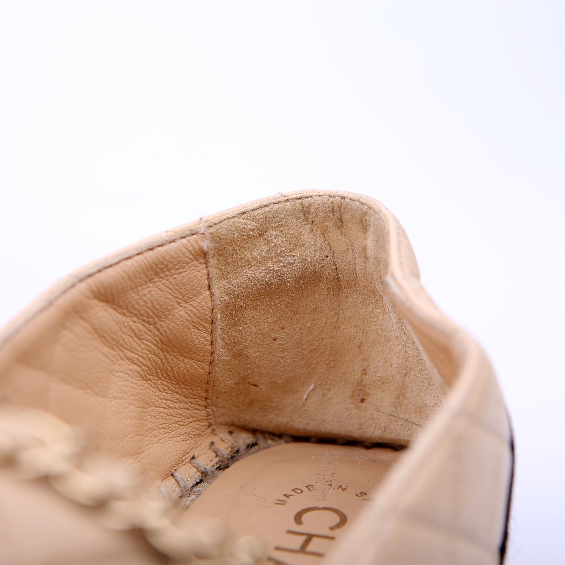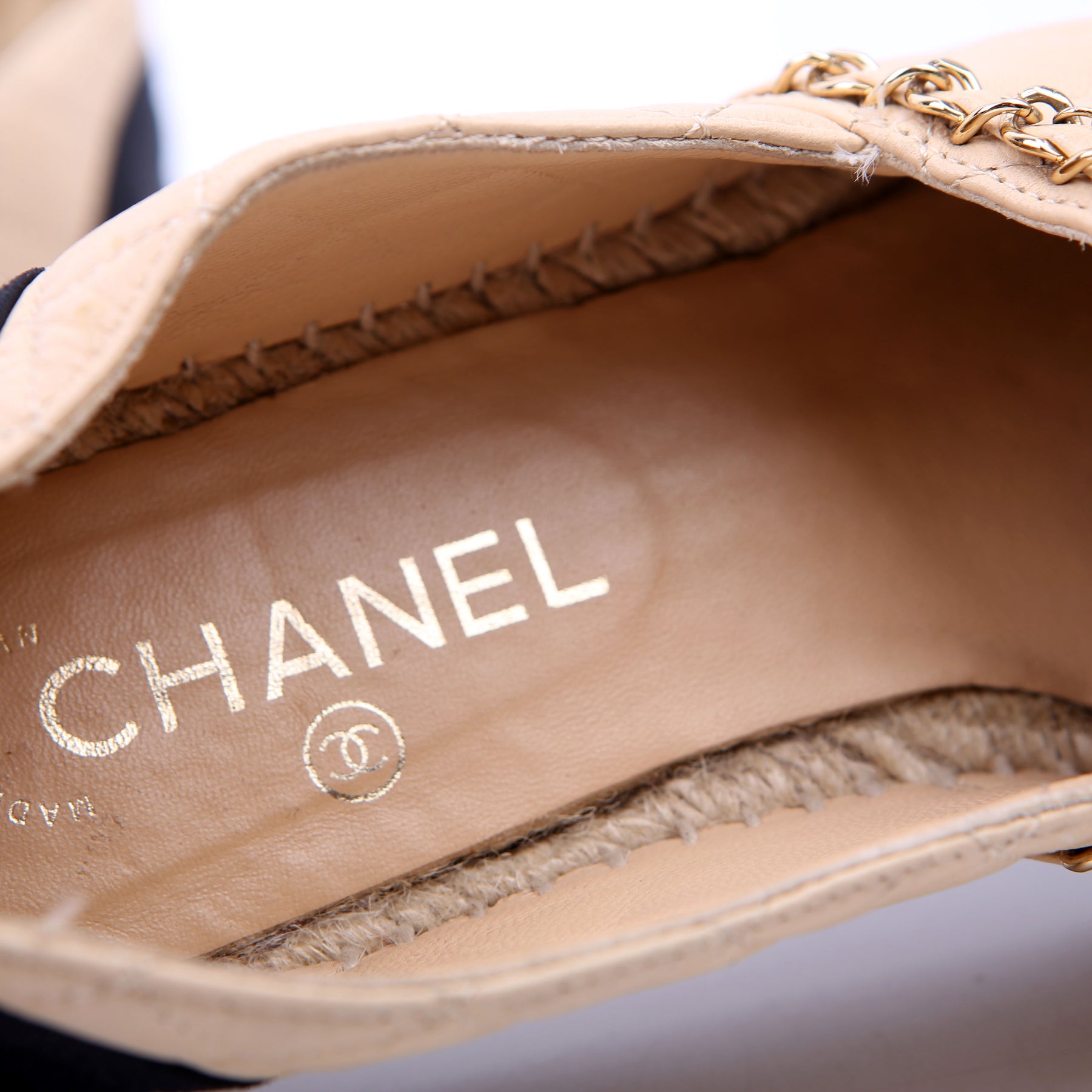 These pre-owned Chanel CC Cap Toe Quilted Espadrilles are guaranteed 100% authentic.