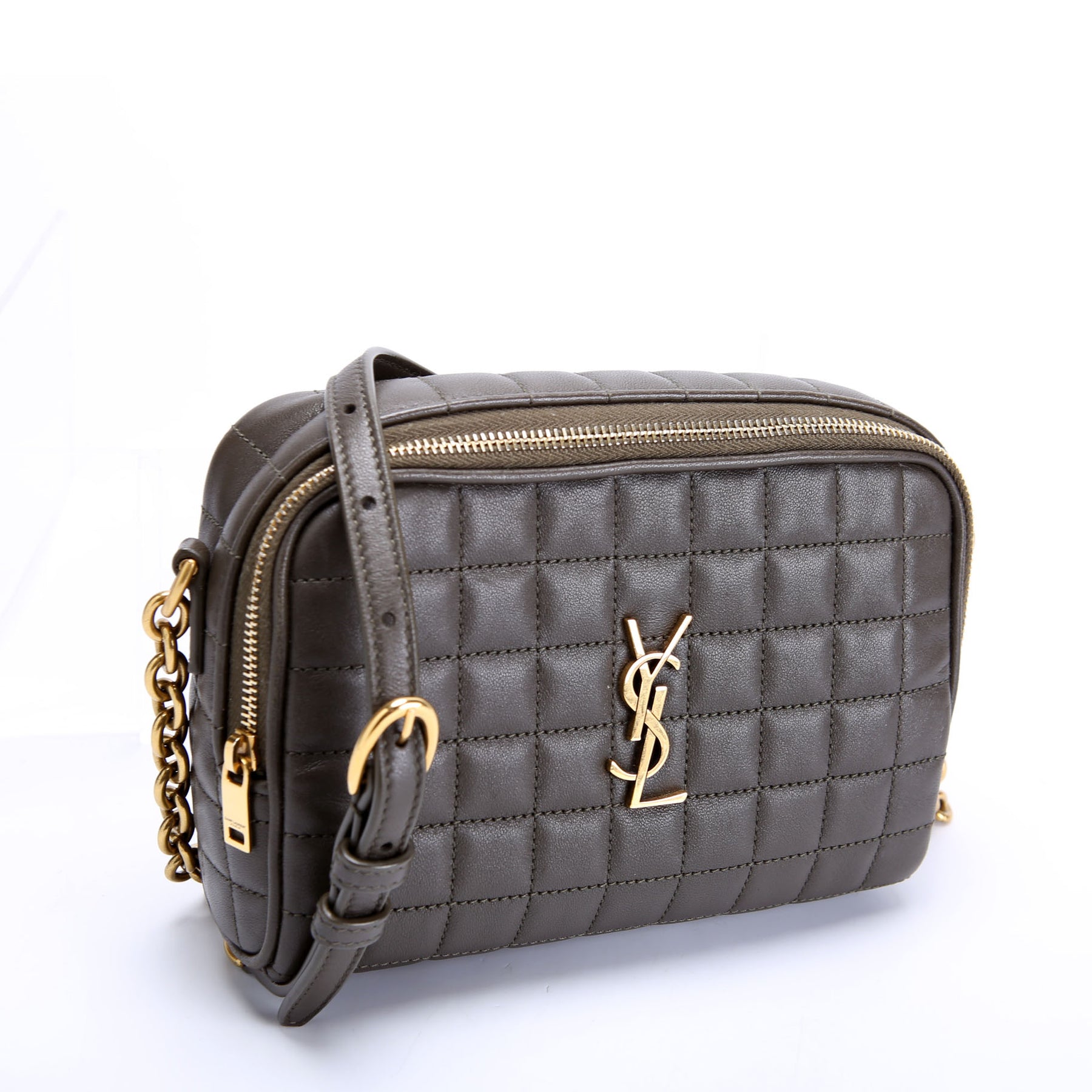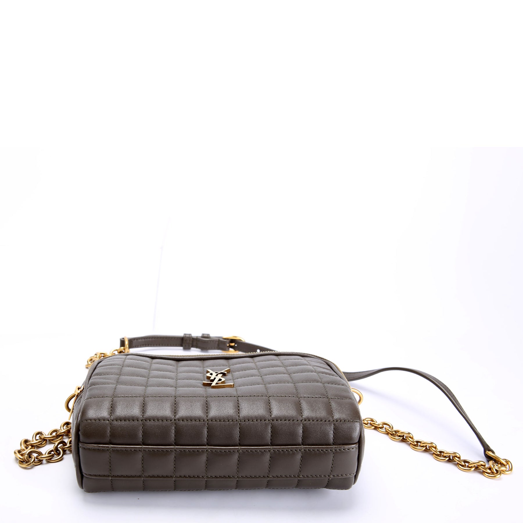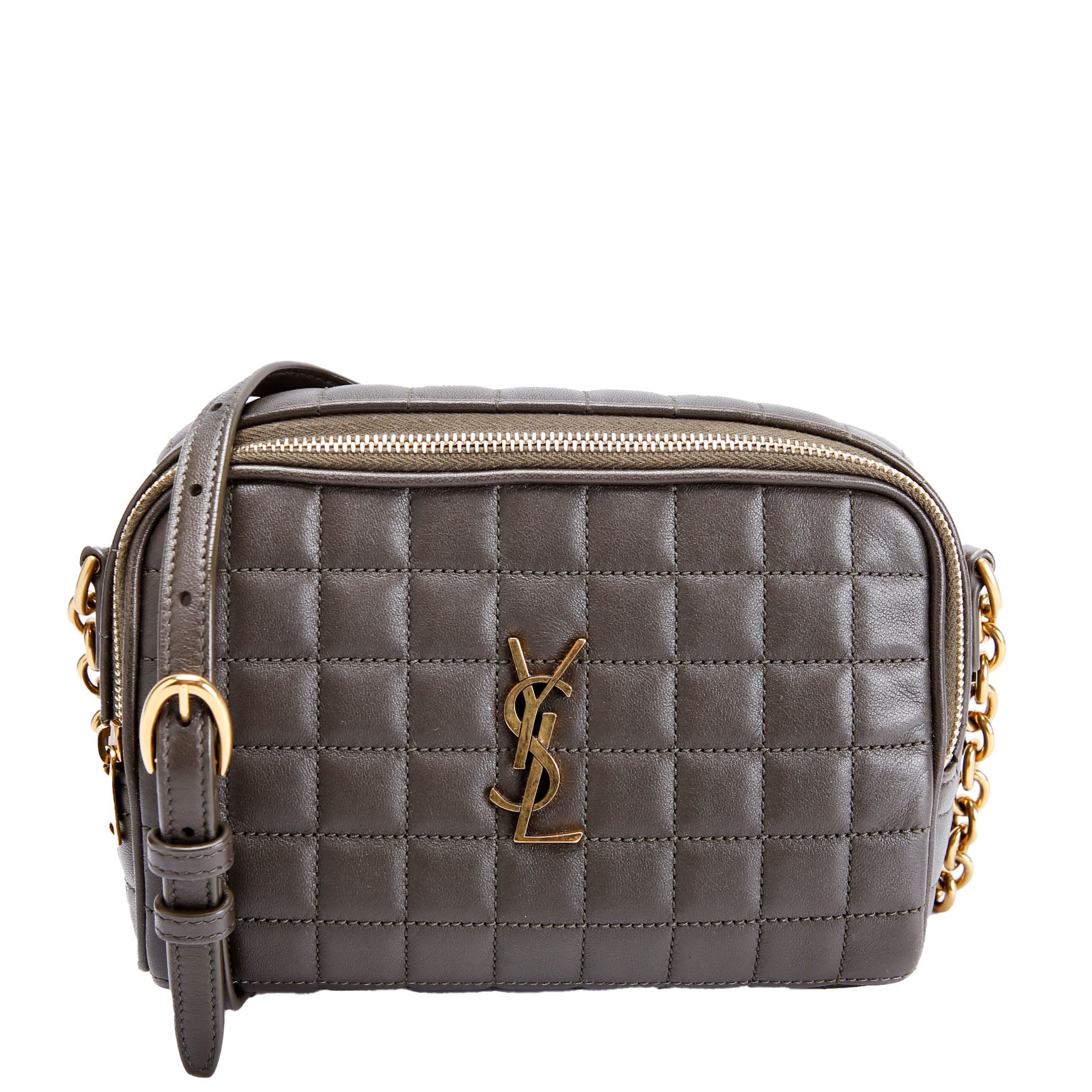 This pre-owned Saint Laurent Cassandre Carre Camera Bag is guaranteed 100% authentic. The exterior is in the classic Saint Laurent Lambskin leather.