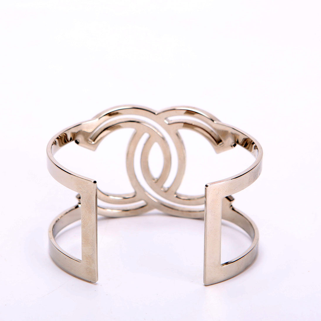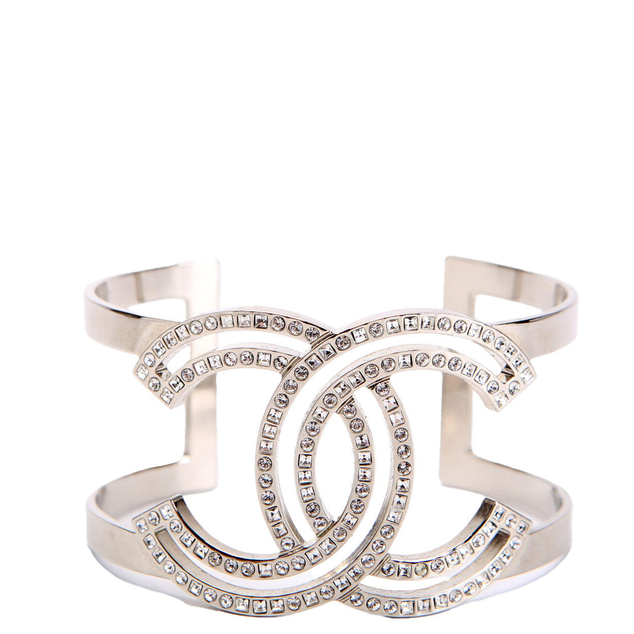 These pre-owned Chanel CC Cut-Out Crystal Cuff Bracelet are guaranteed 100% authentic.