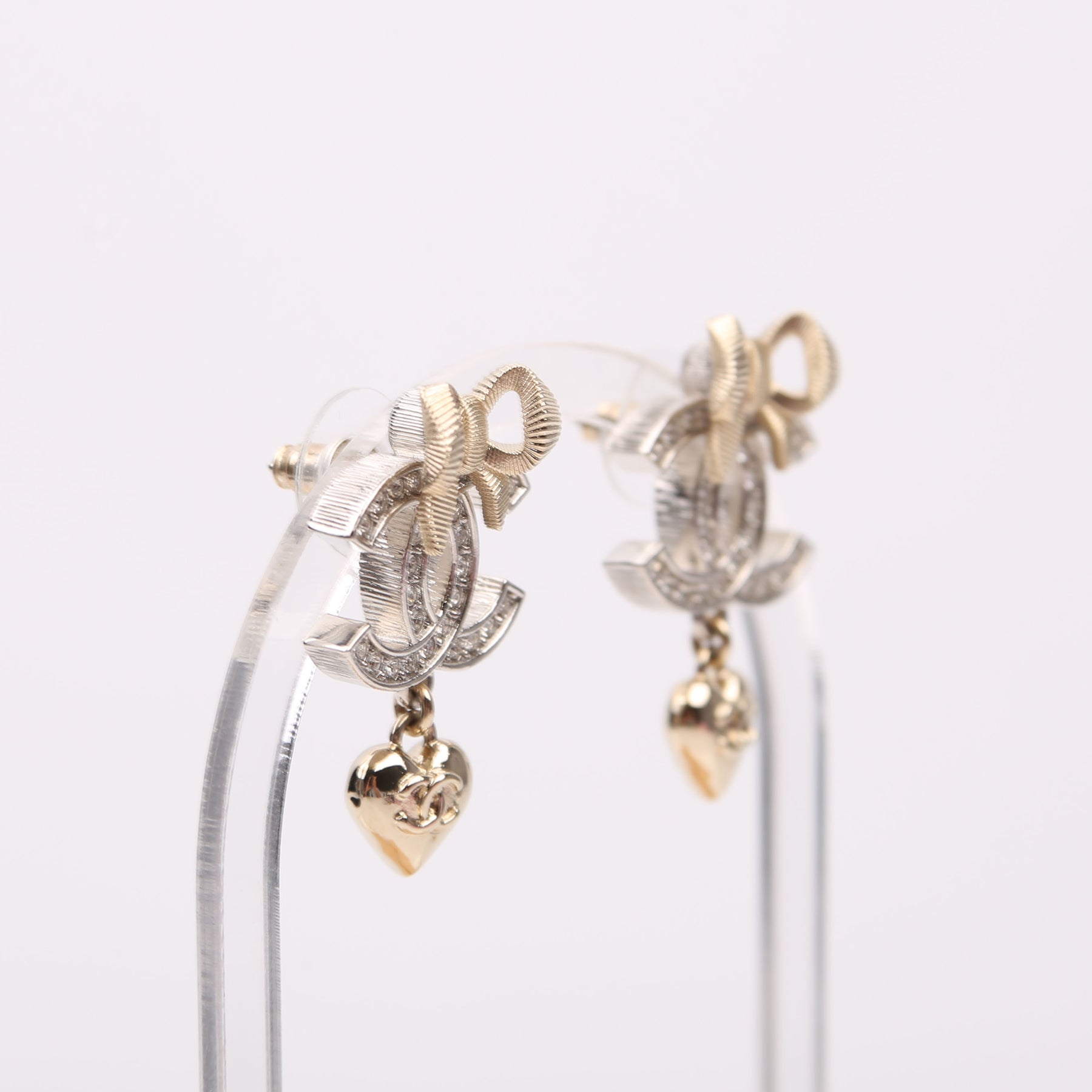 These pre-owned Chanel CC Strass Bow Heart Drop Stud Earrings are guaranteed 100% authentic.