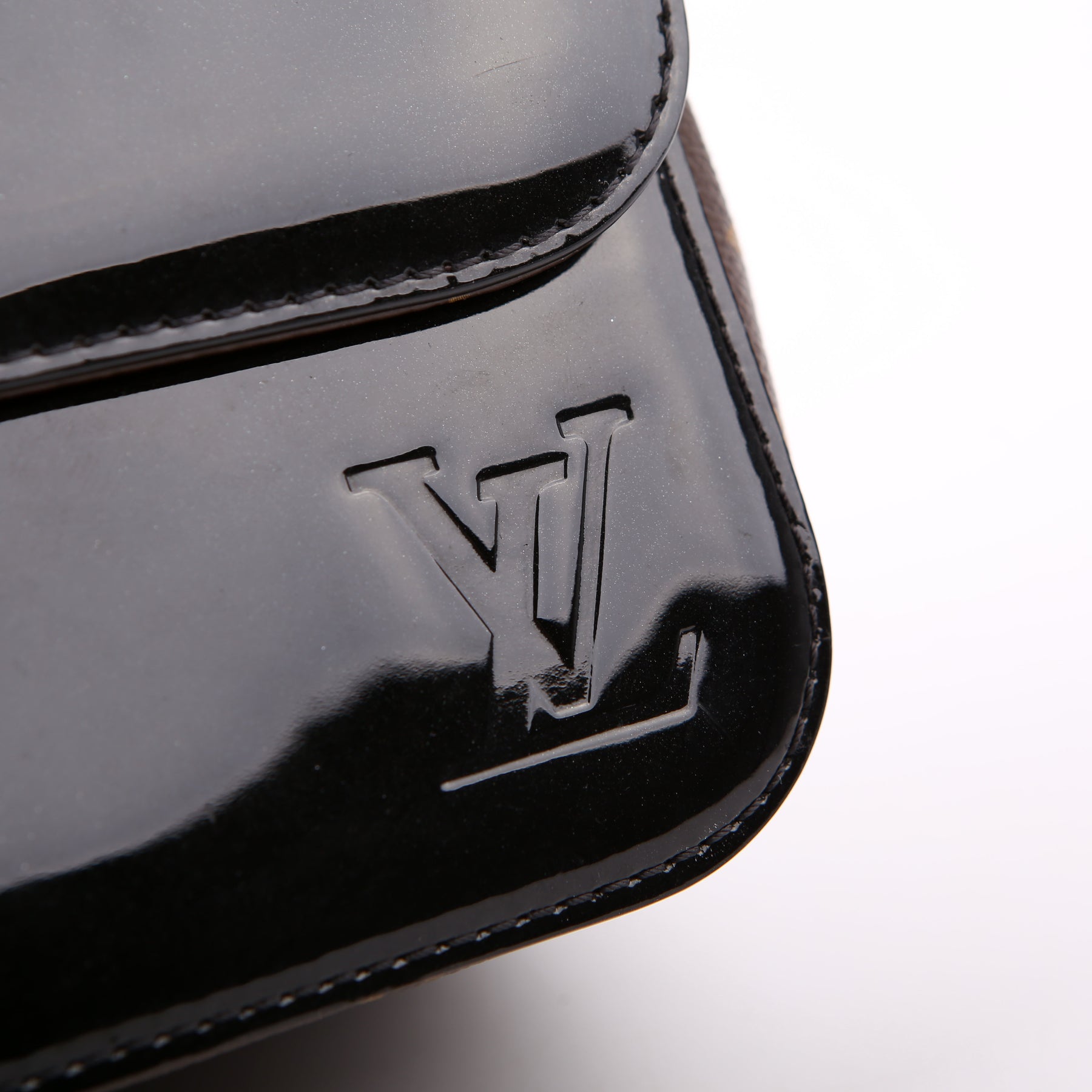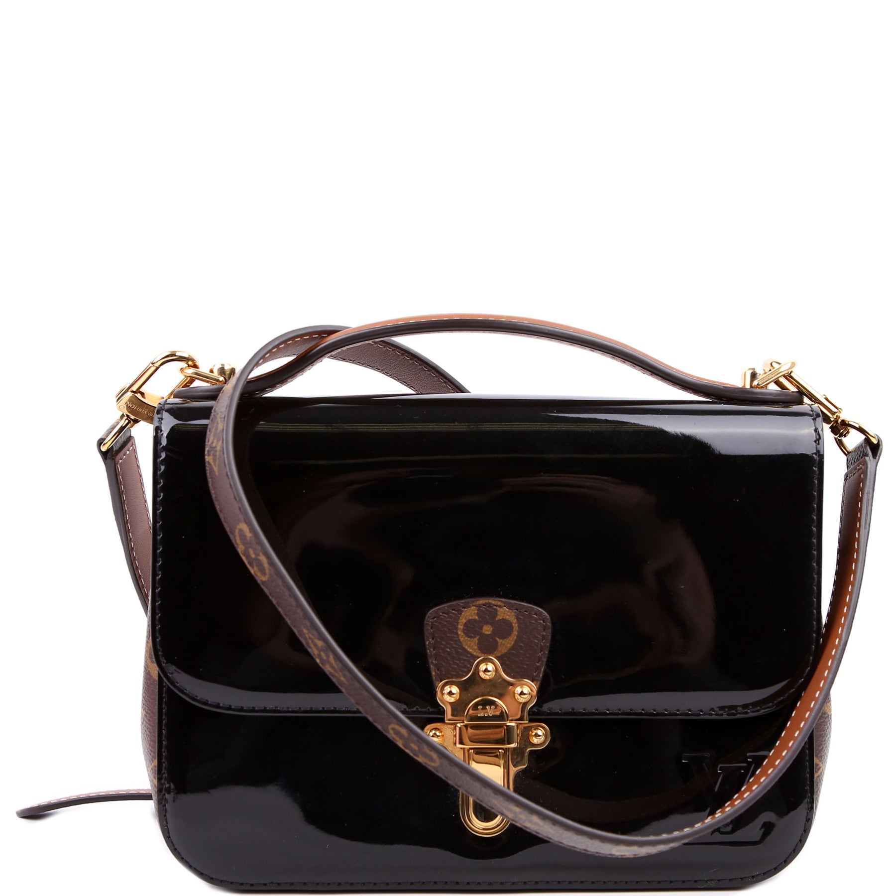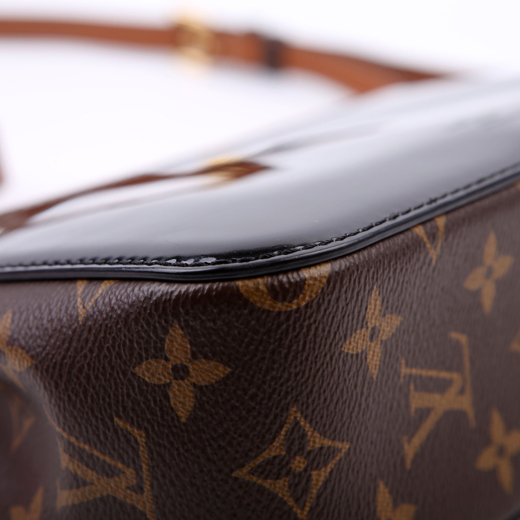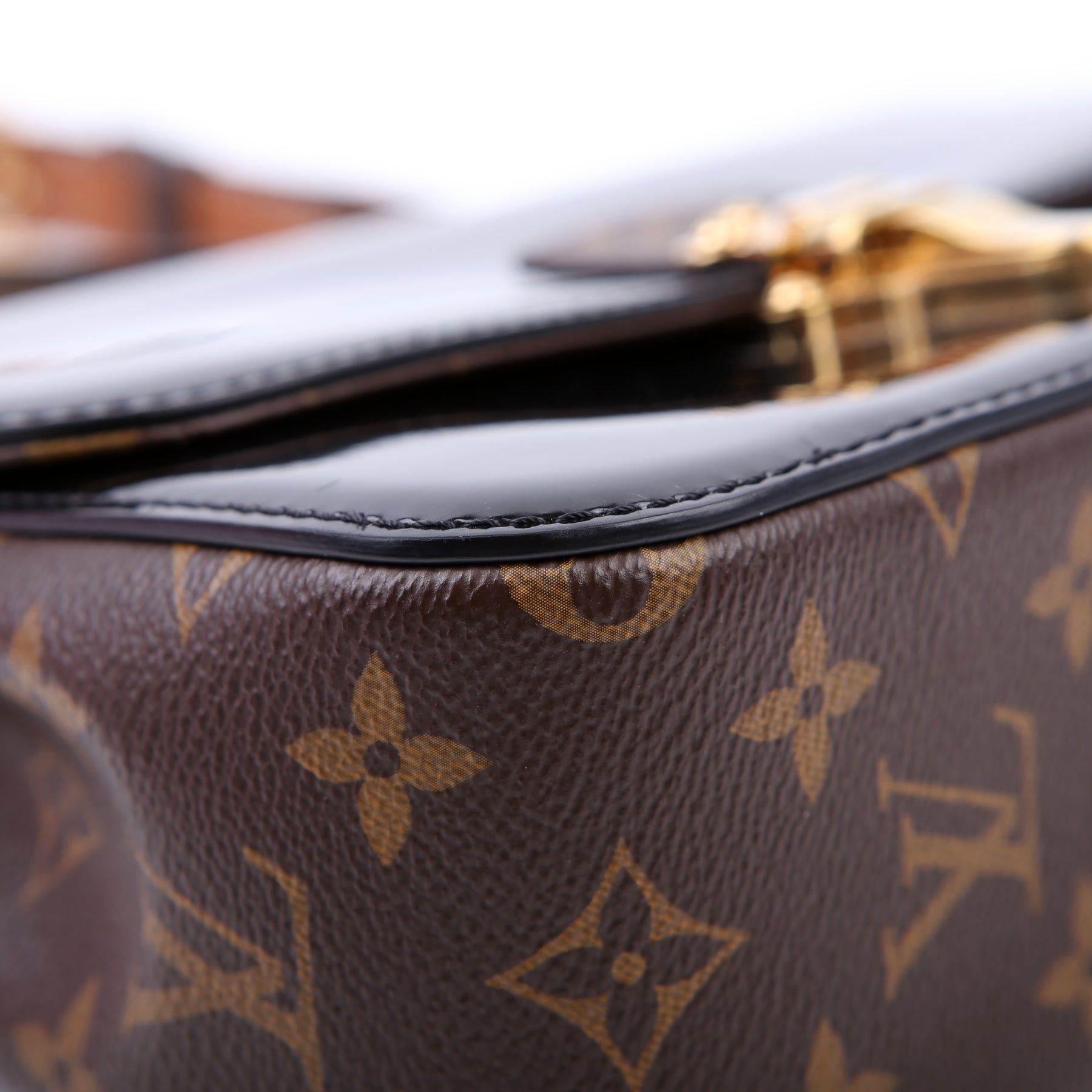 This pre-owned Louis Vuitton Cherrywood BB is guaranteed 100% authentic. The exterior is in the classic Louis Vuitton patent leather and monogram coated canvas.