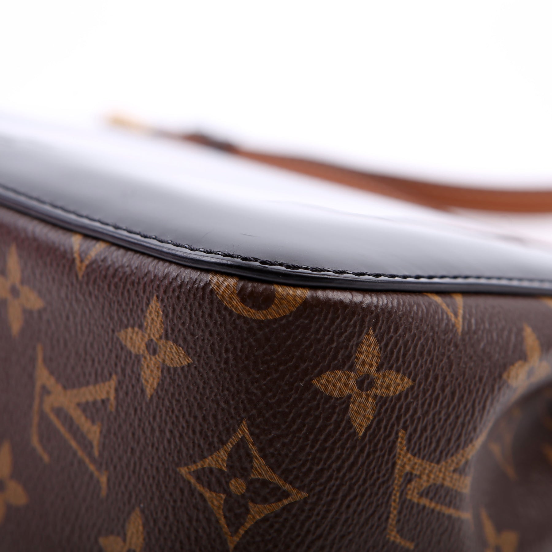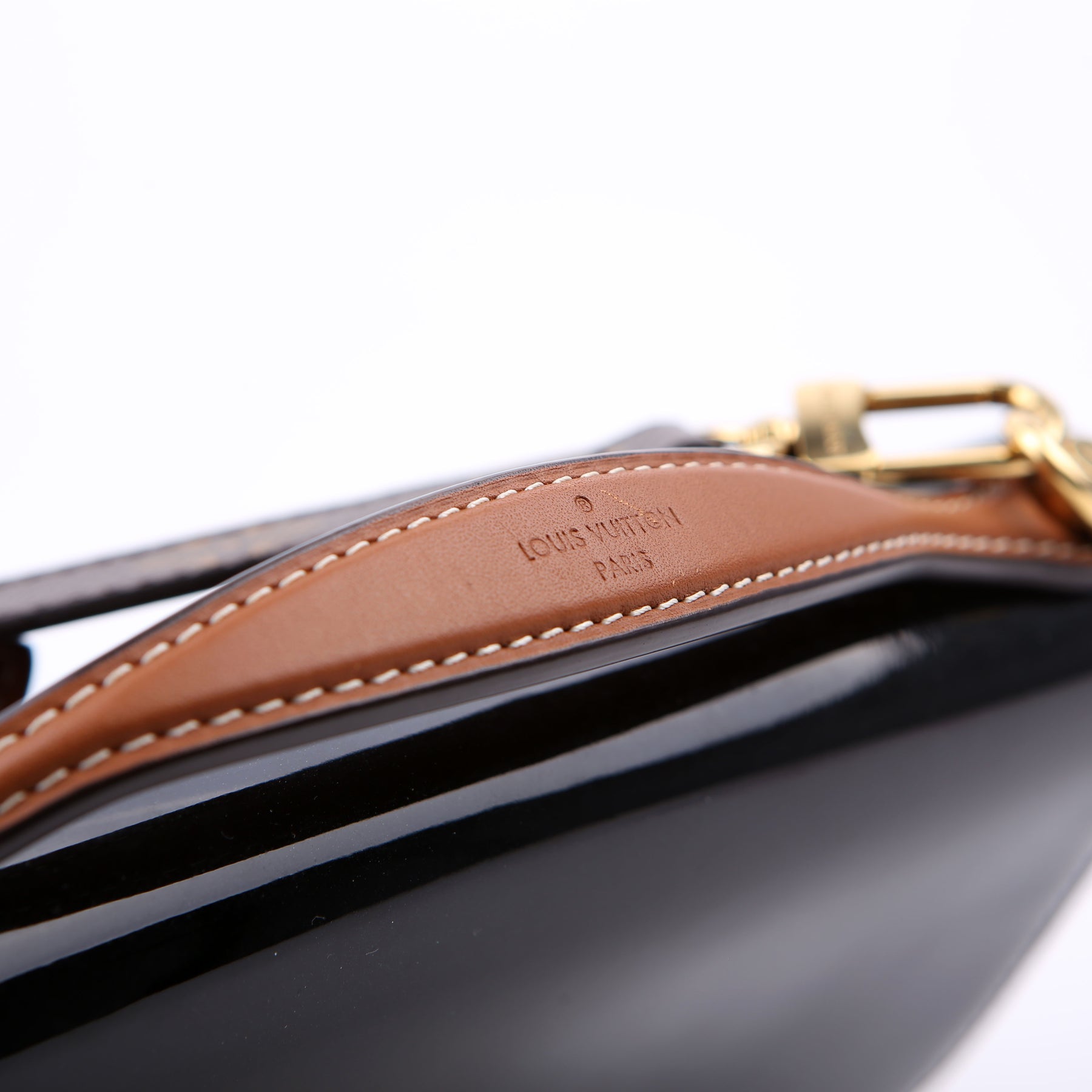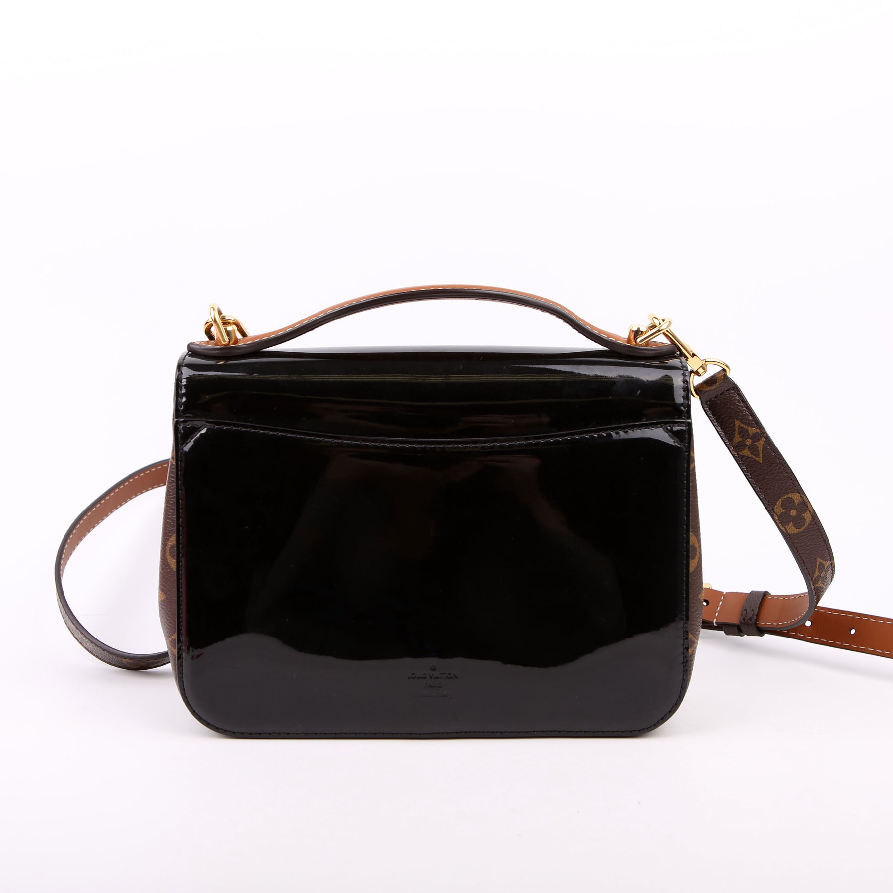 This pre-owned Louis Vuitton Cherrywood BB is guaranteed 100% authentic. The exterior is in the classic Louis Vuitton patent leather and monogram coated canvas.