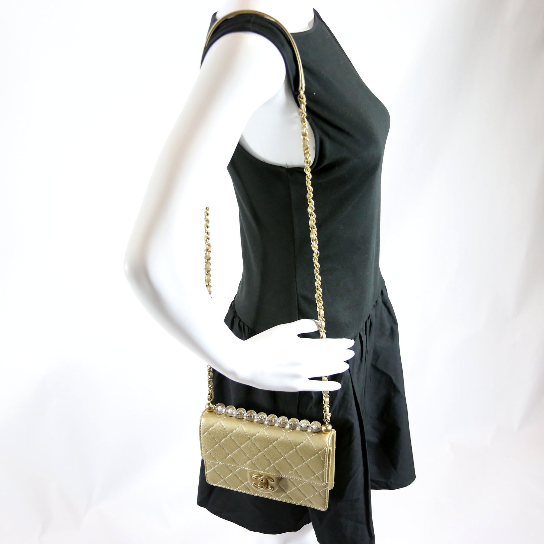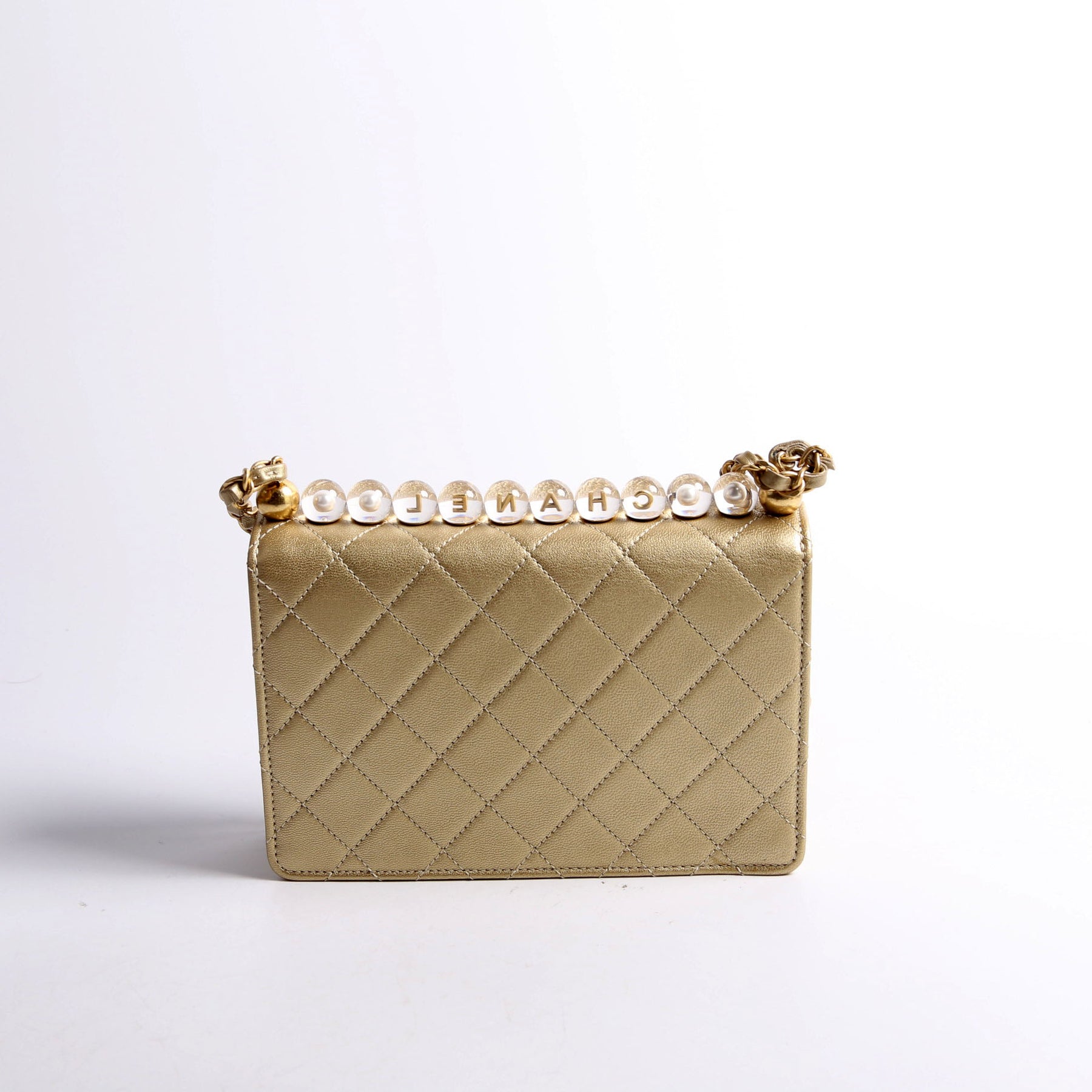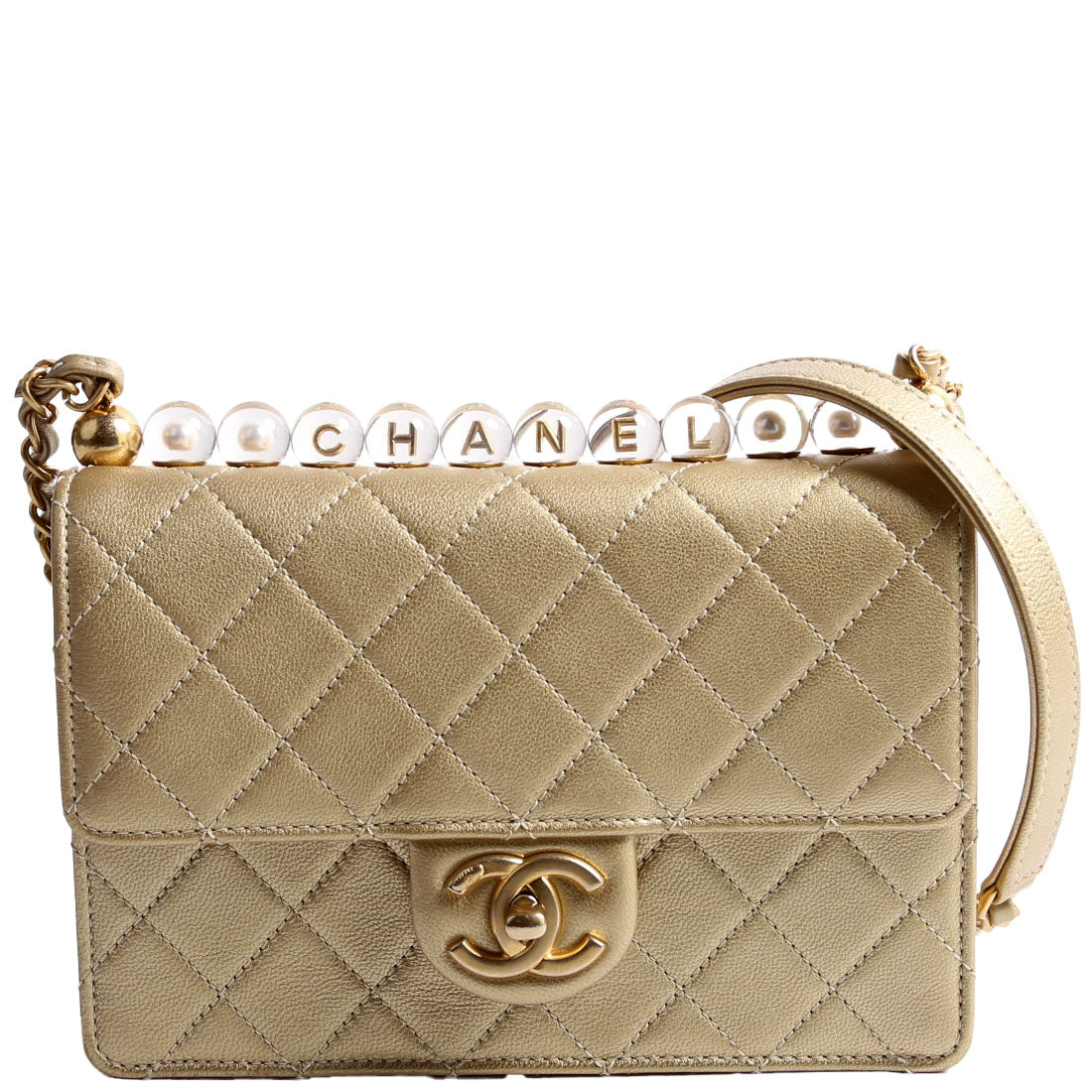 This pre-owned Chanel Chic Pearls Flap Small Metallic 30M is guaranteed 100% authentic. The exterior is in the classic Quilted Lambskin.