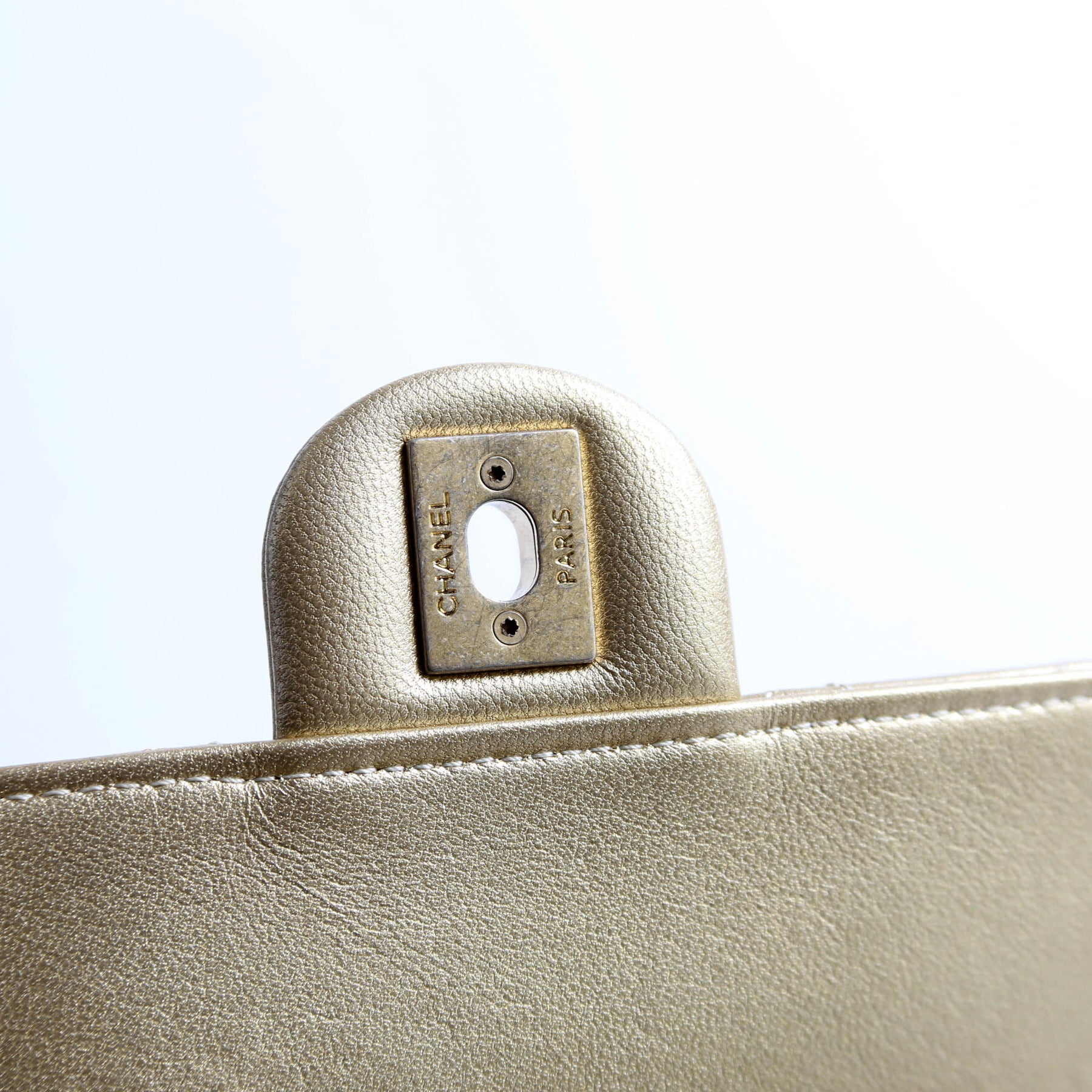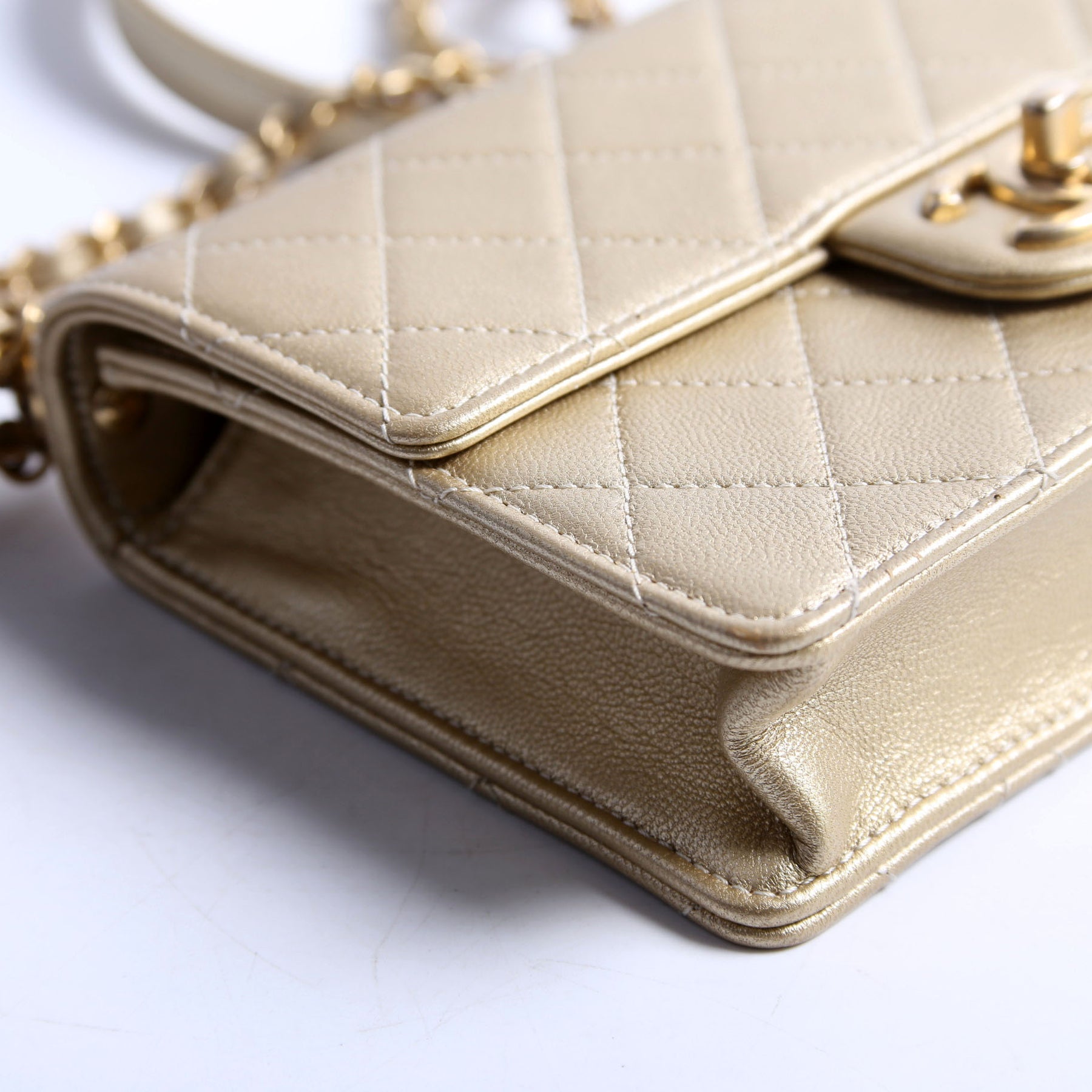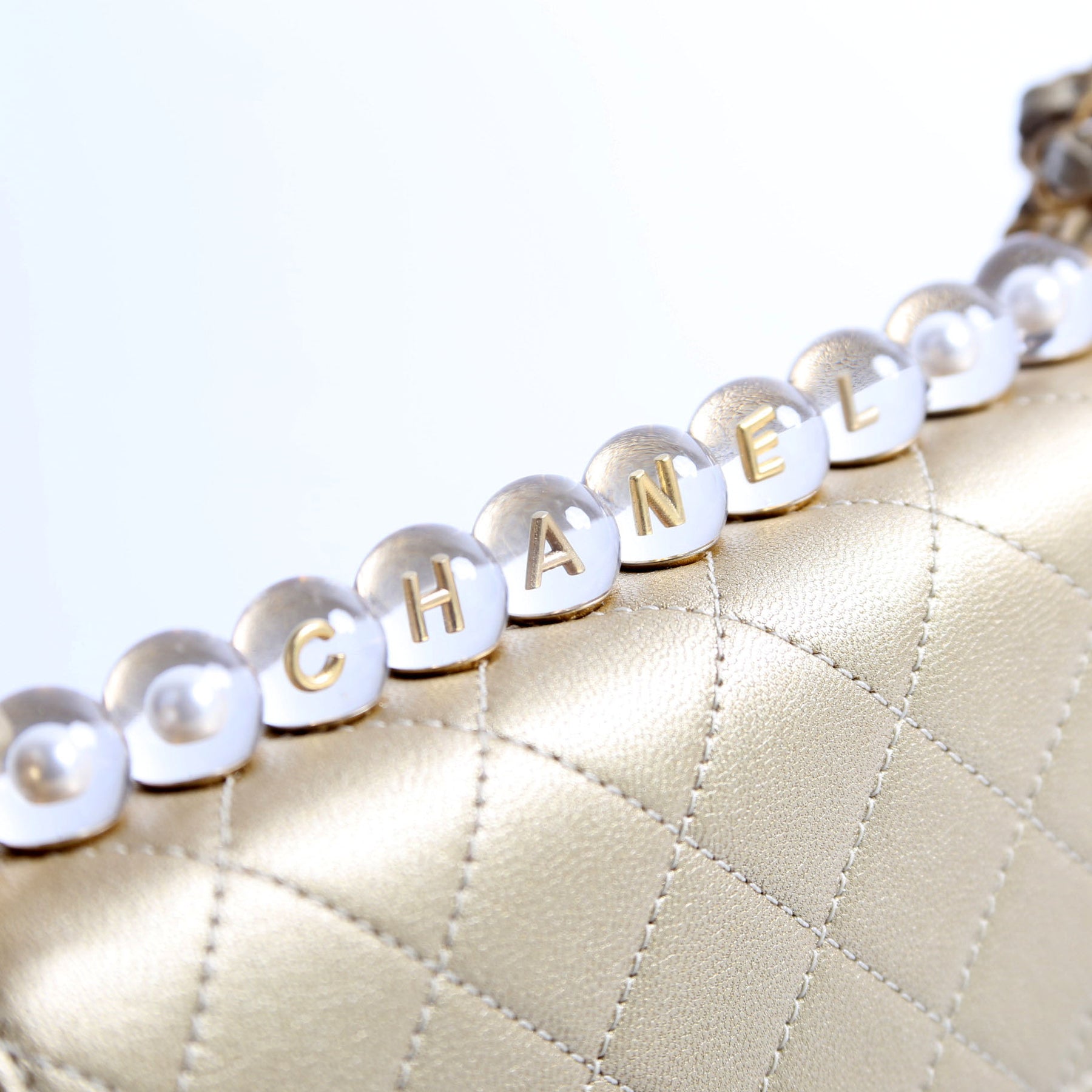 This pre-owned Chanel Chic Pearls Flap Small Metallic 30M is guaranteed 100% authentic. The exterior is in the classic Quilted Lambskin.