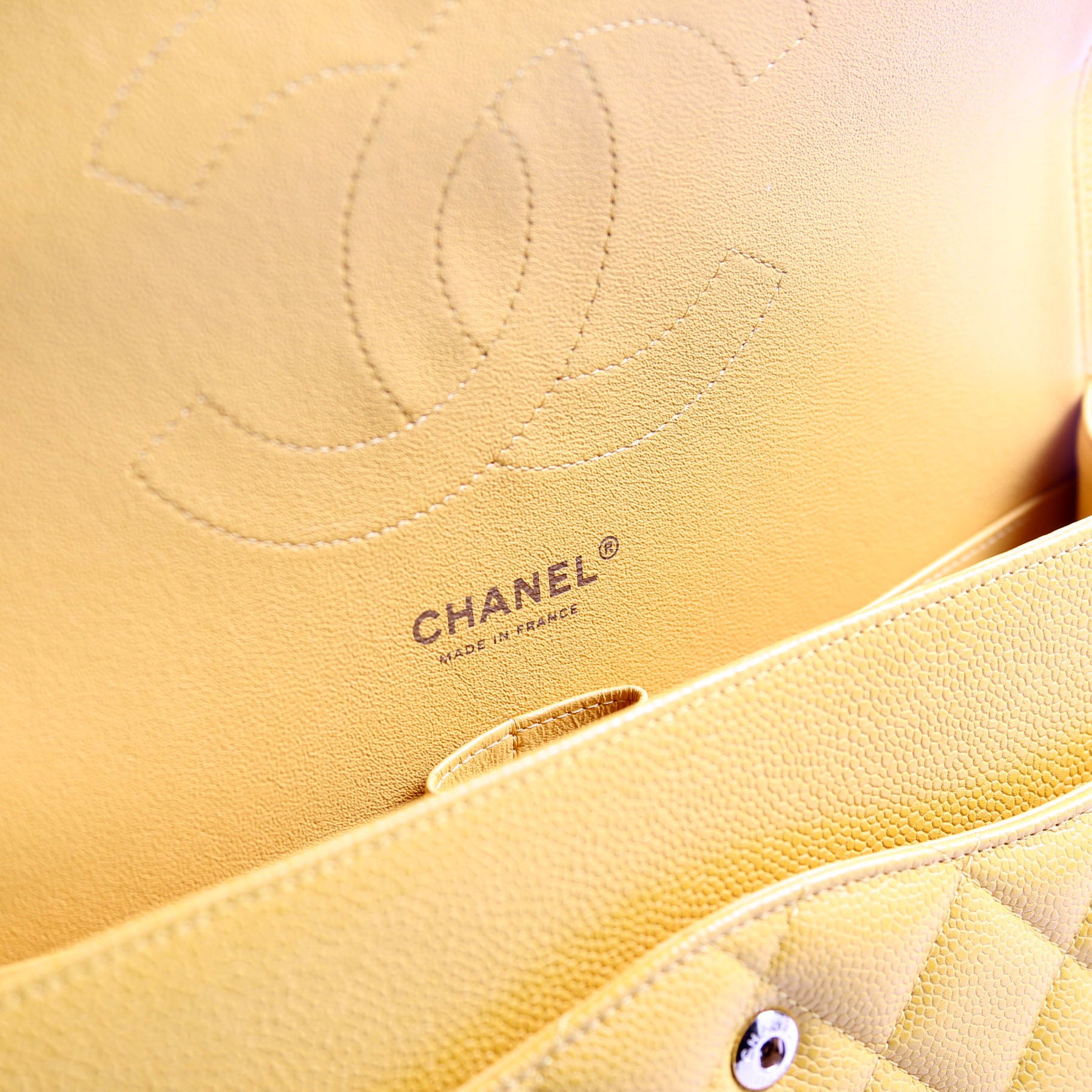 This pre-owned Chanel Classic Flap Jumbo is guaranteed 100% authentic. The exterior is in the classic Chanel Caviar Leather.