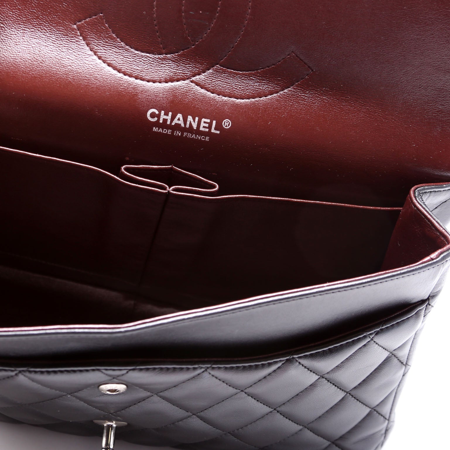 This pre-owned Chanel Classic Flap Jumbo is guaranteed 100% authentic. The exterior is in the classic Chanel Lambskin Leather.