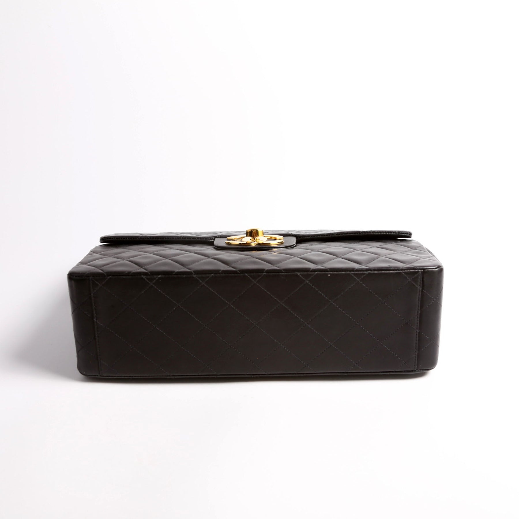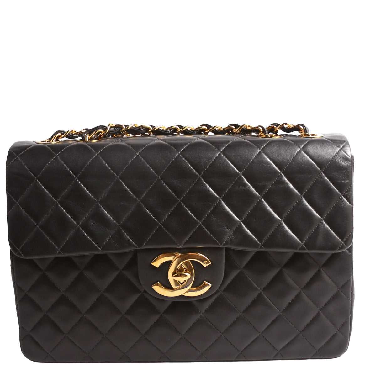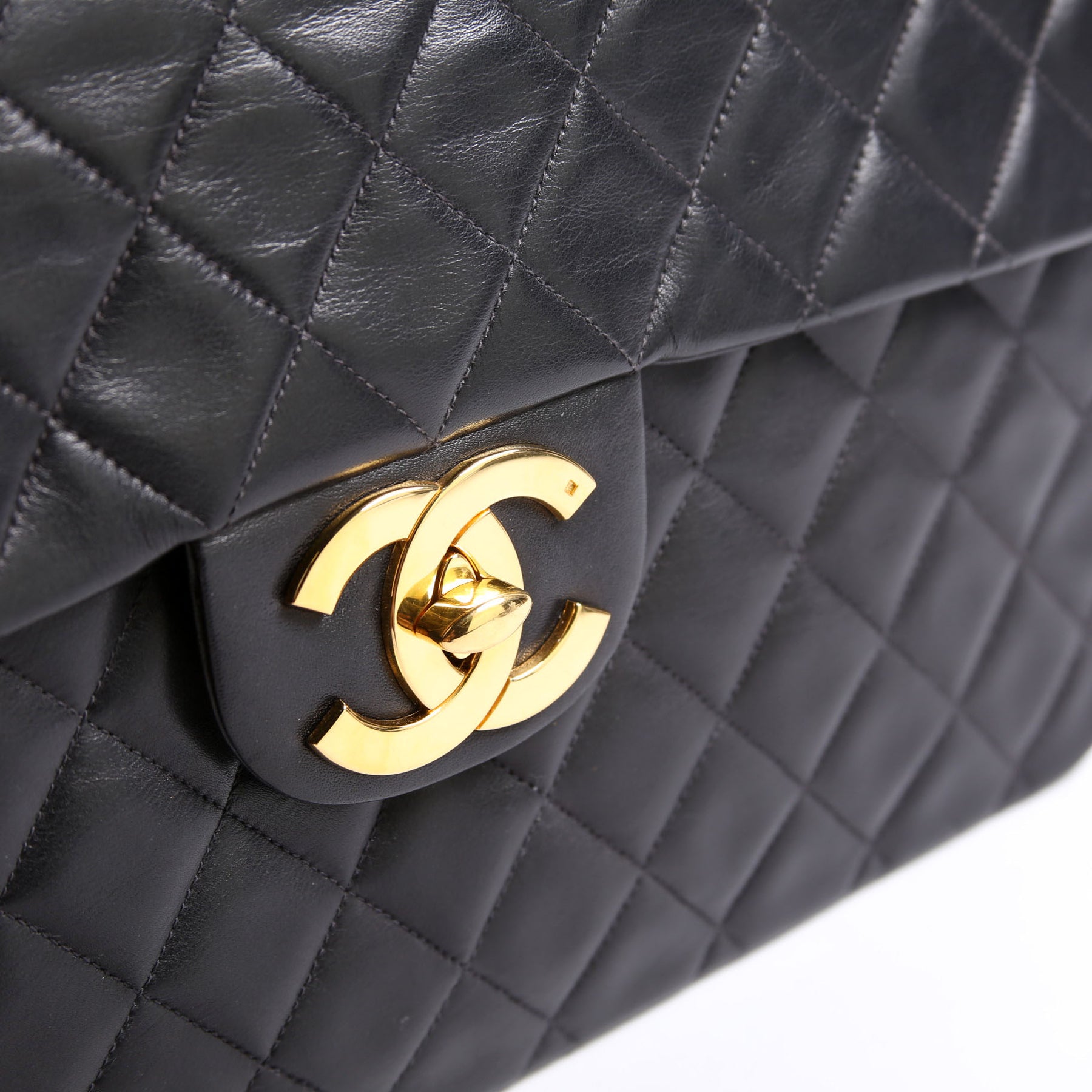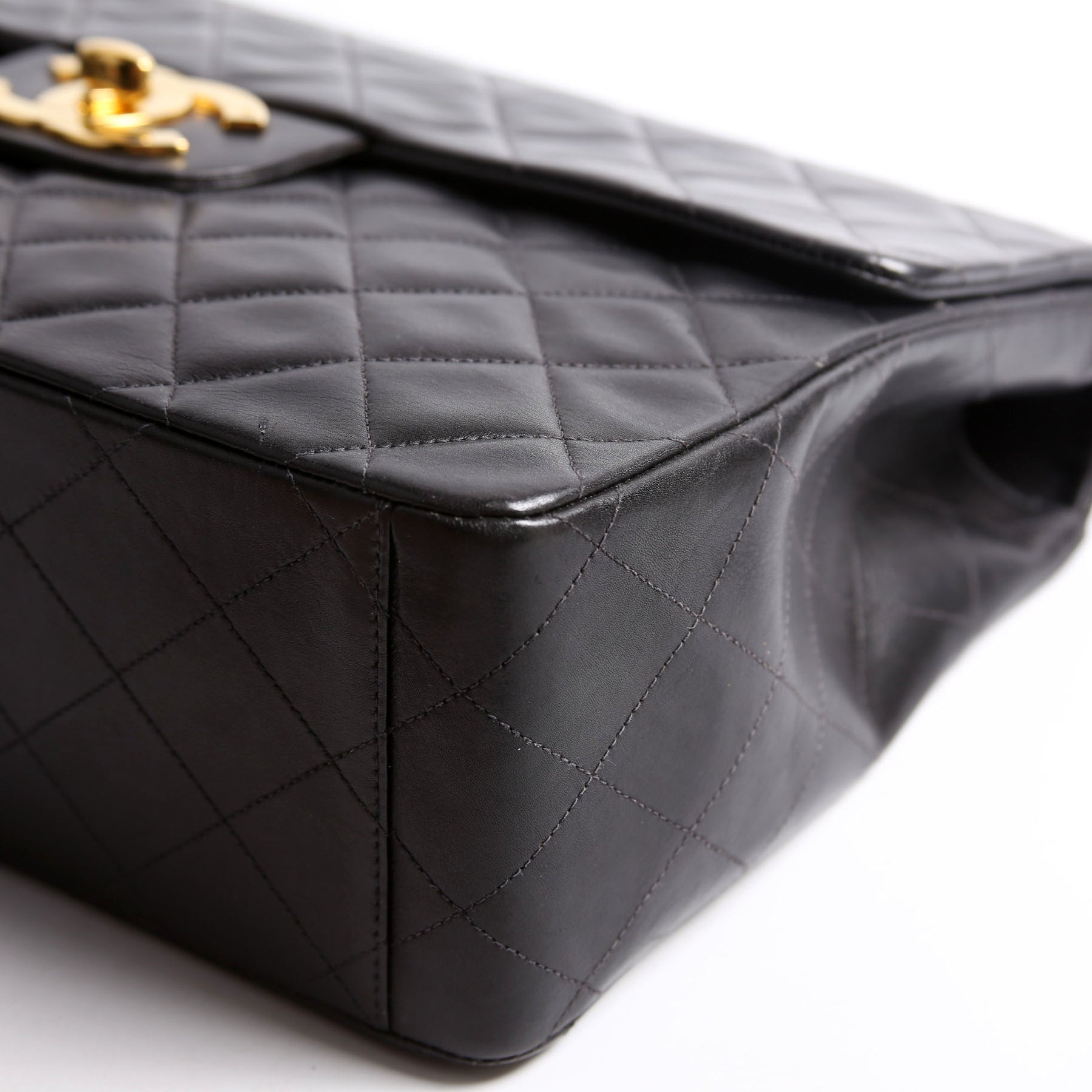 This pre-owned Chanel Classic Flap XL Jumbo is guaranteed 100% authentic. The exterior is in the classic Chanel Lambskin leather.