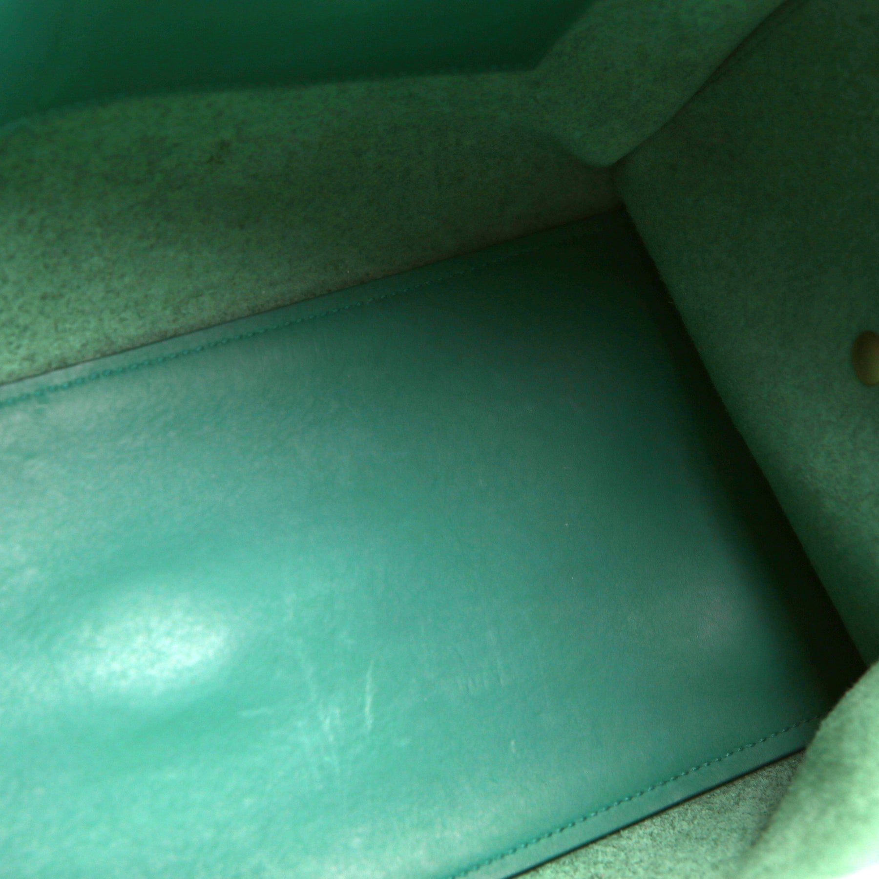 Interior: The interior has minor wear throughout the suede, and features two open pockets.