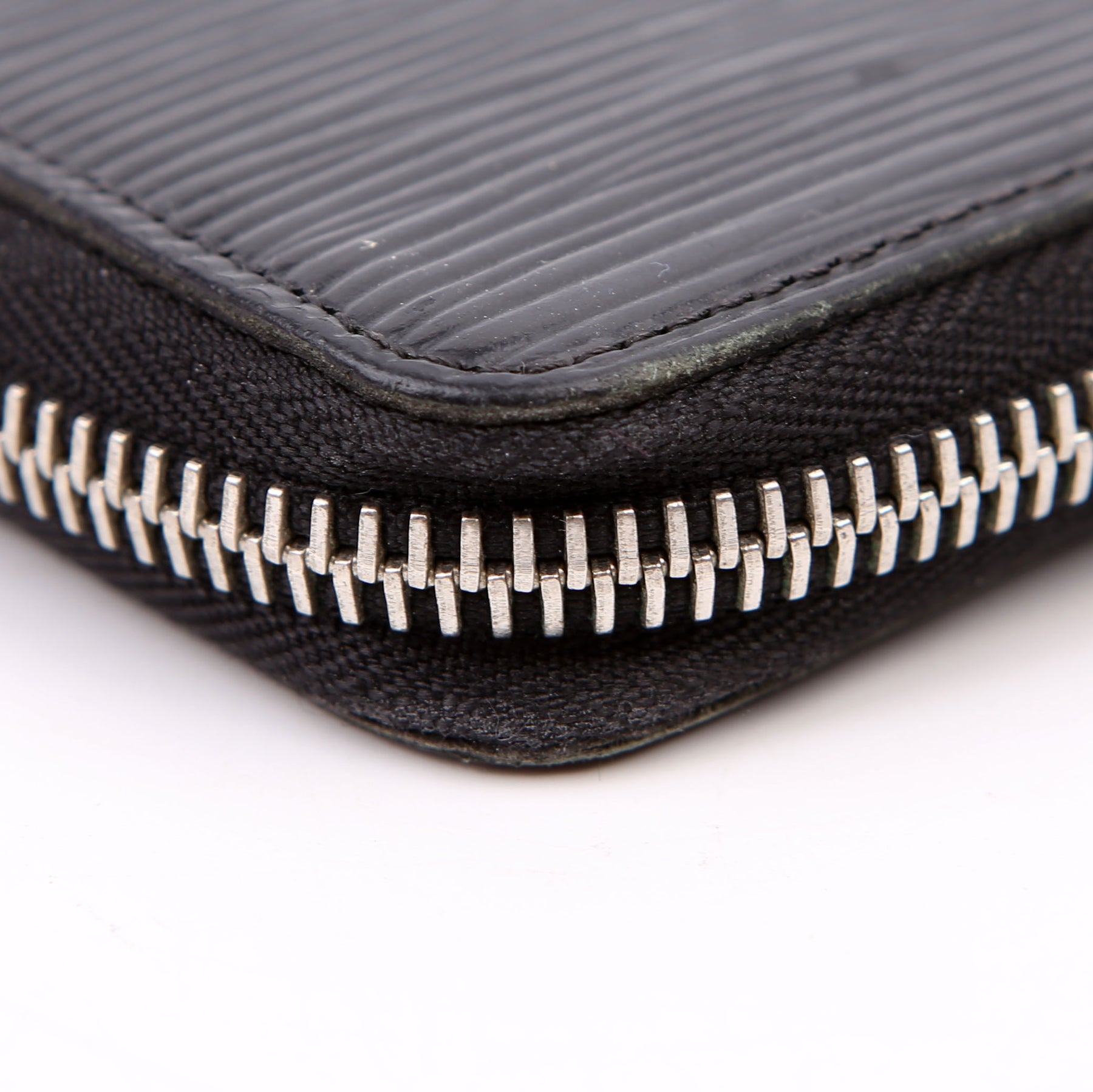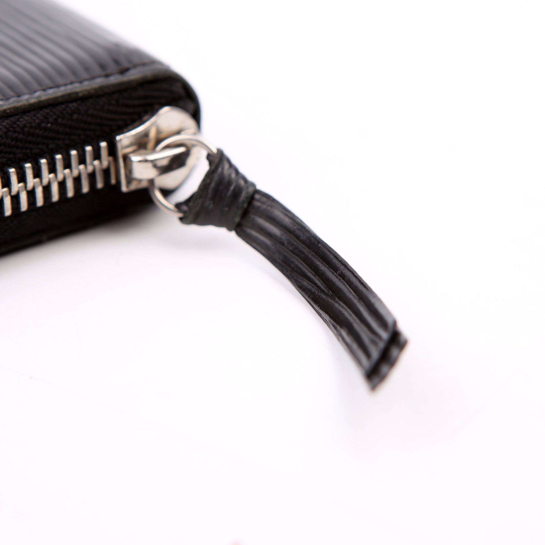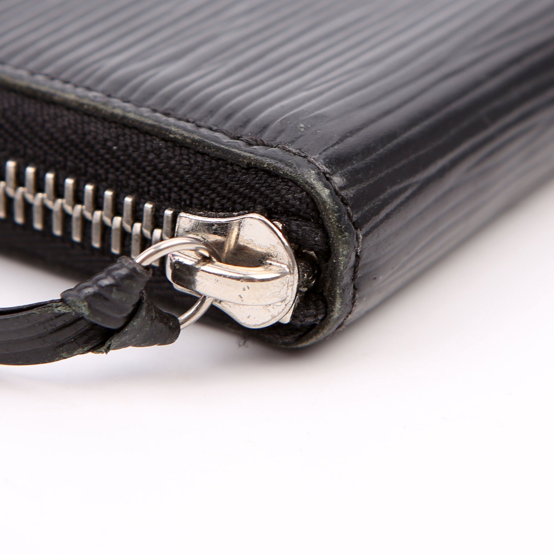 Hardware: The zipper operates properly and runs smoothly. The leather zipper pull shows minor wear.