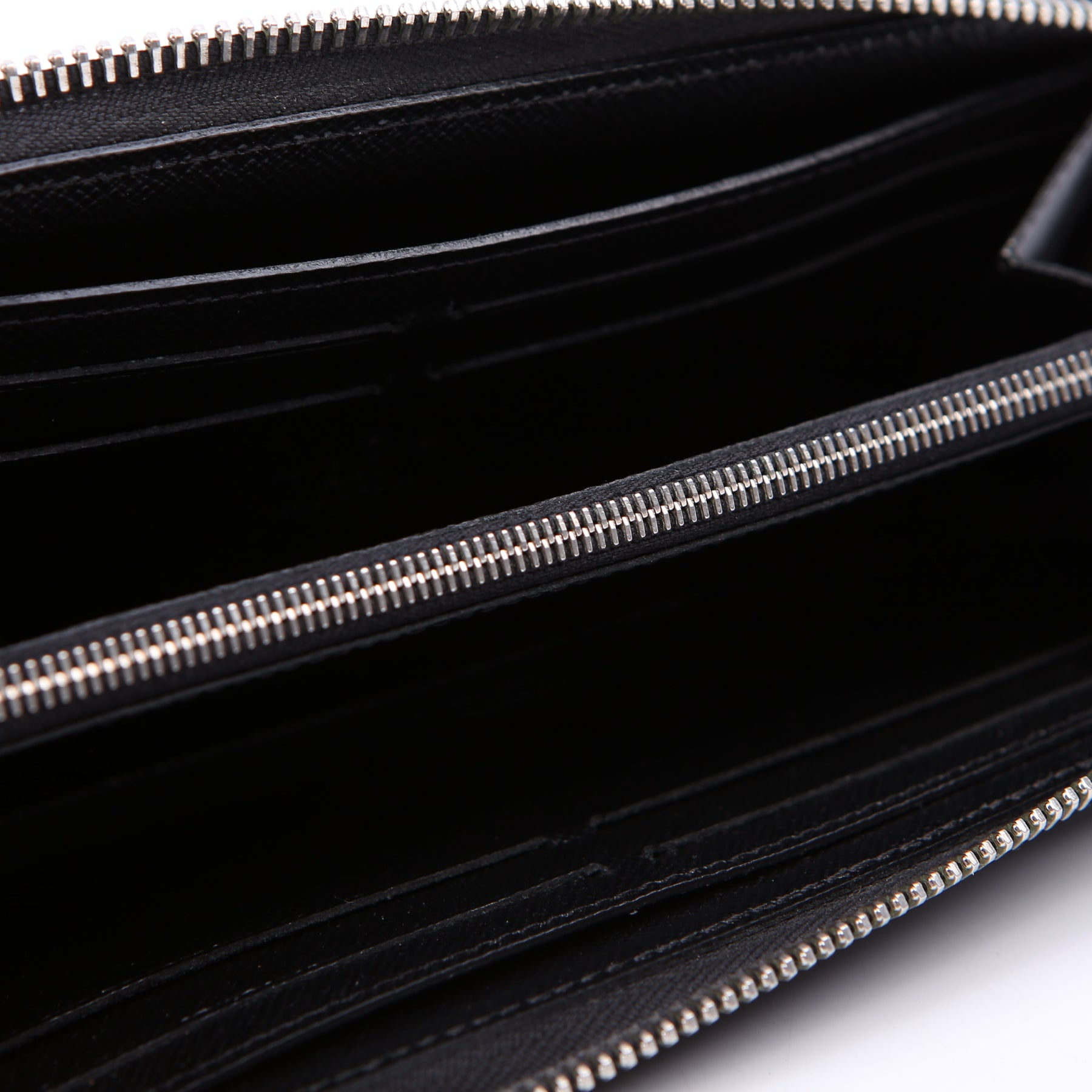 Interior: The interior shows light wear, and features eight card slots, two bill slots, and one zip closure coin pouch.