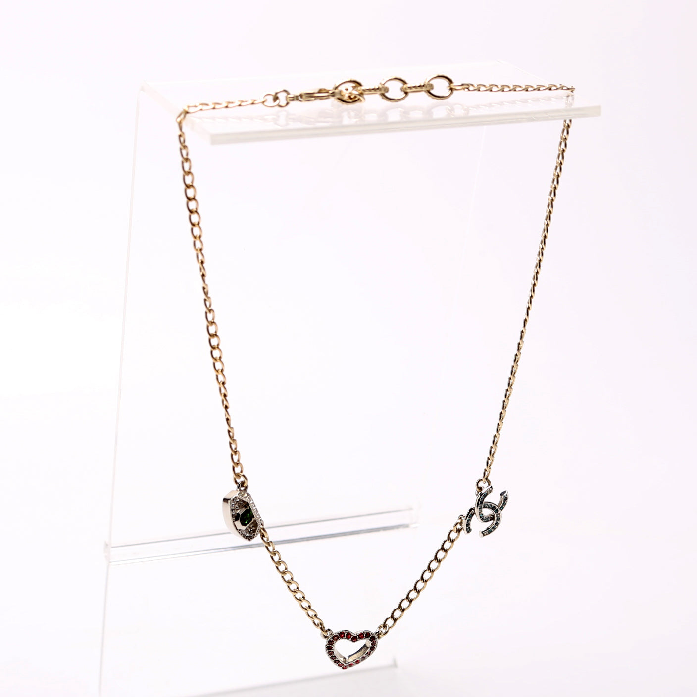 These pre-owned Chanel Crystal Eye Heart CC Necklace are guaranteed 100% authentic.