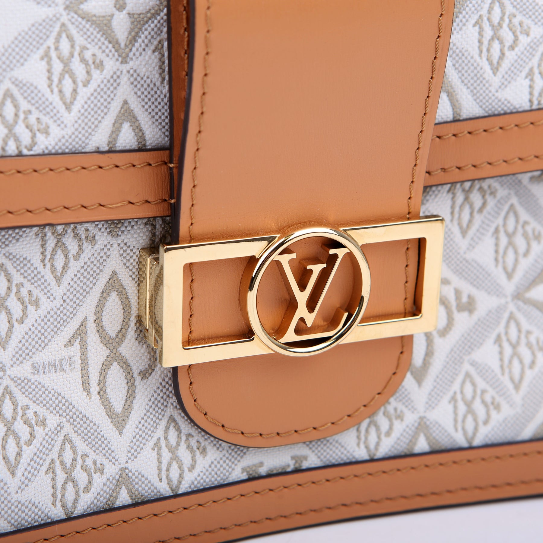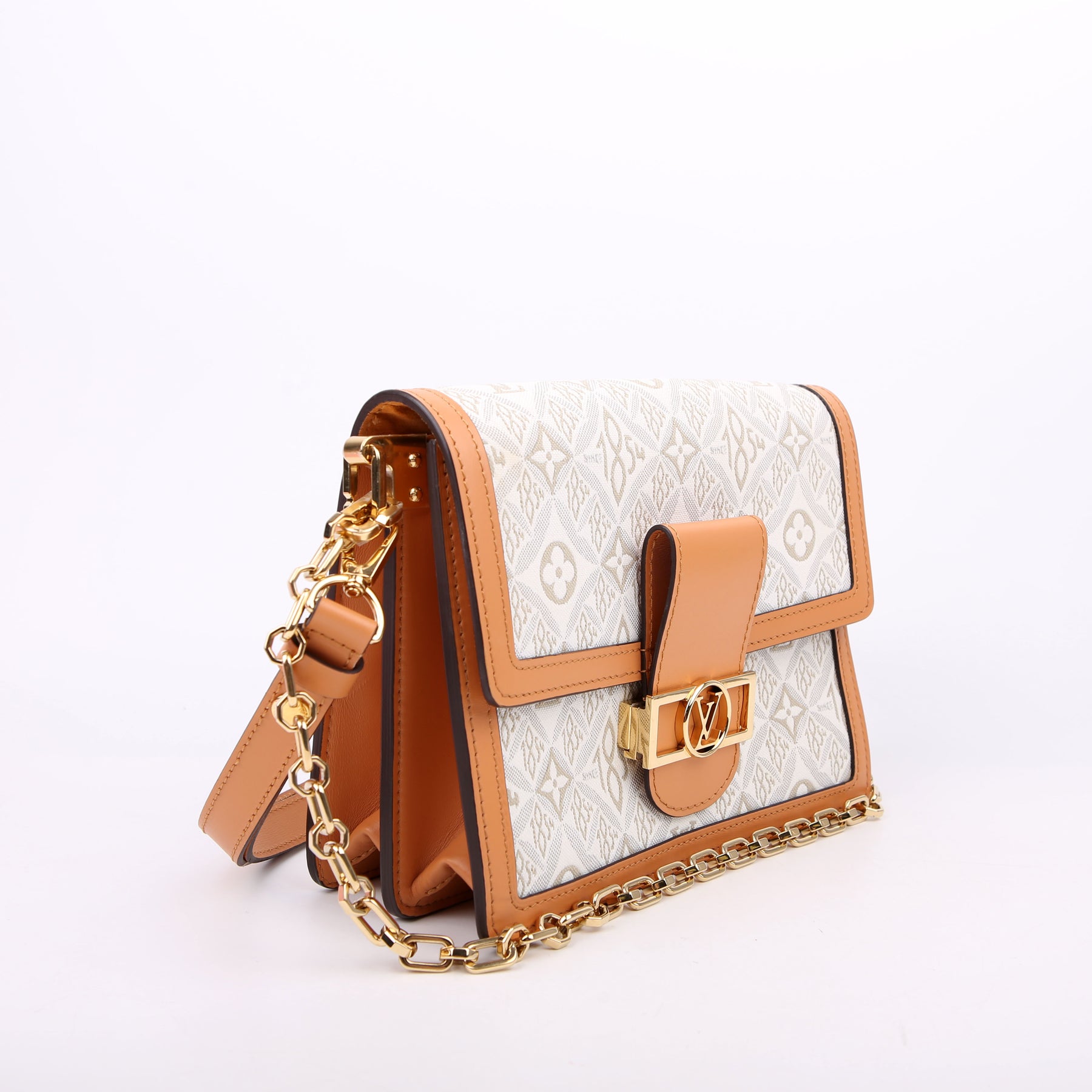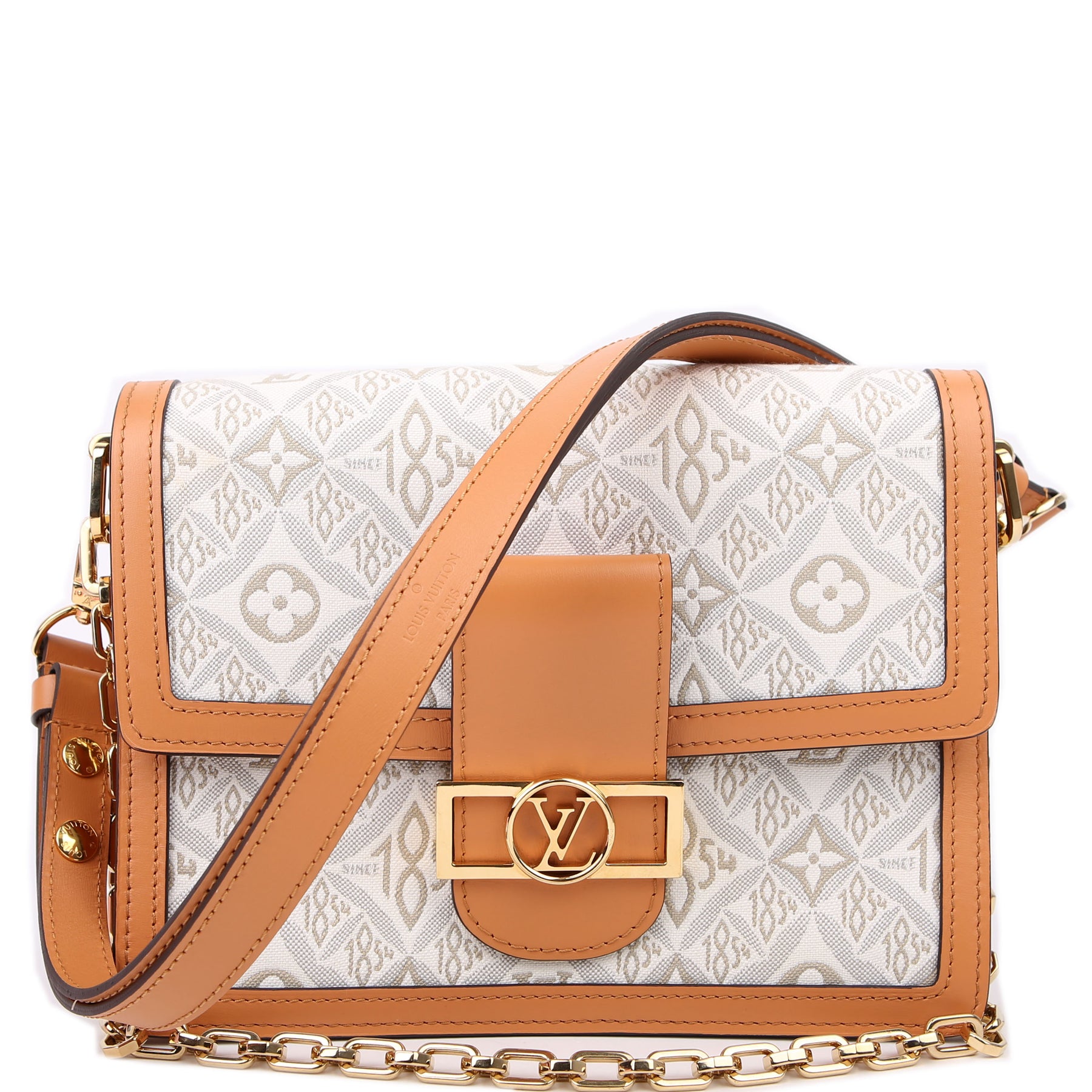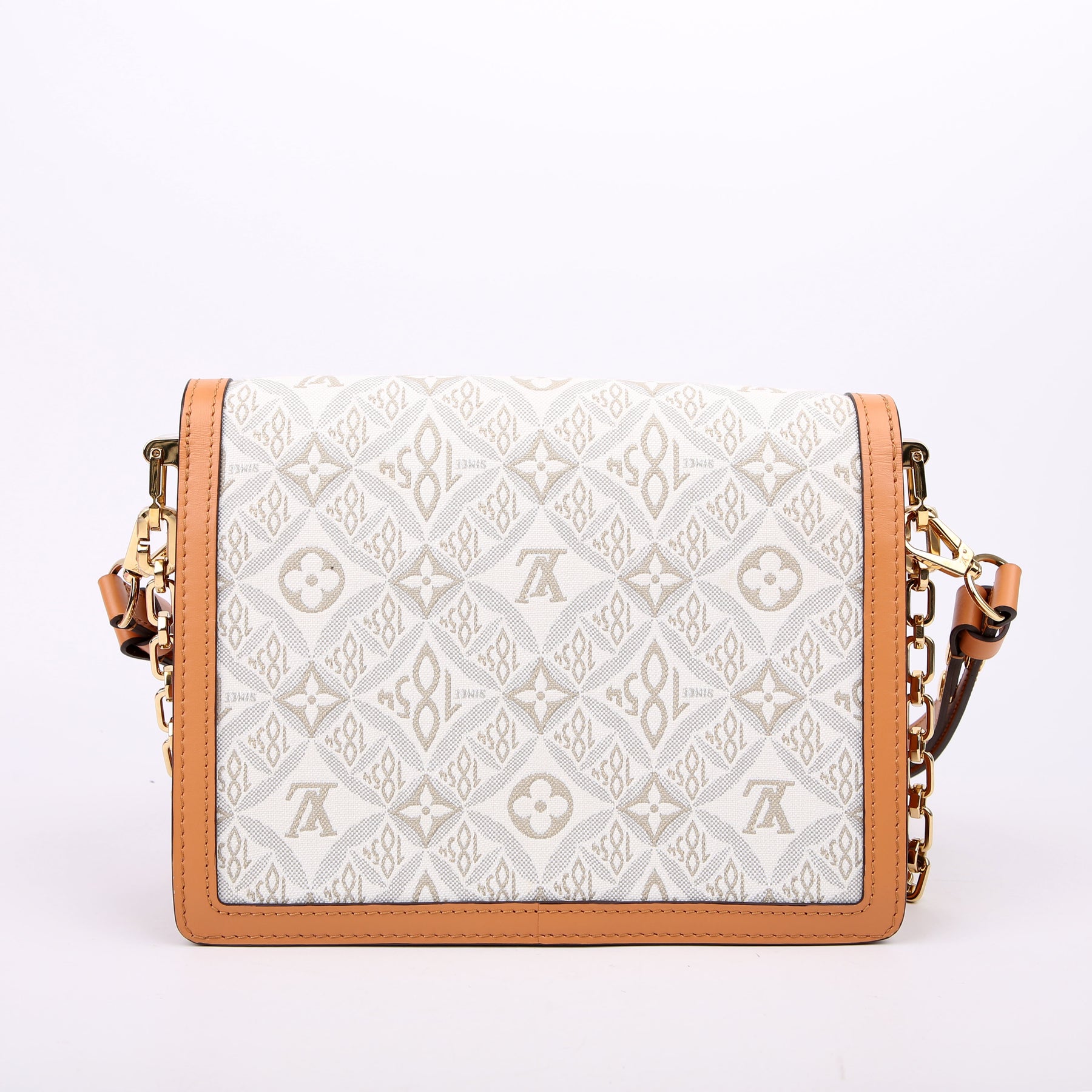 This pre-owned Louis Vuitton Dauphine MM is guaranteed 100% authentic. The exterior is in the Louis Vuitton Since 1854 Jacquard canvas.