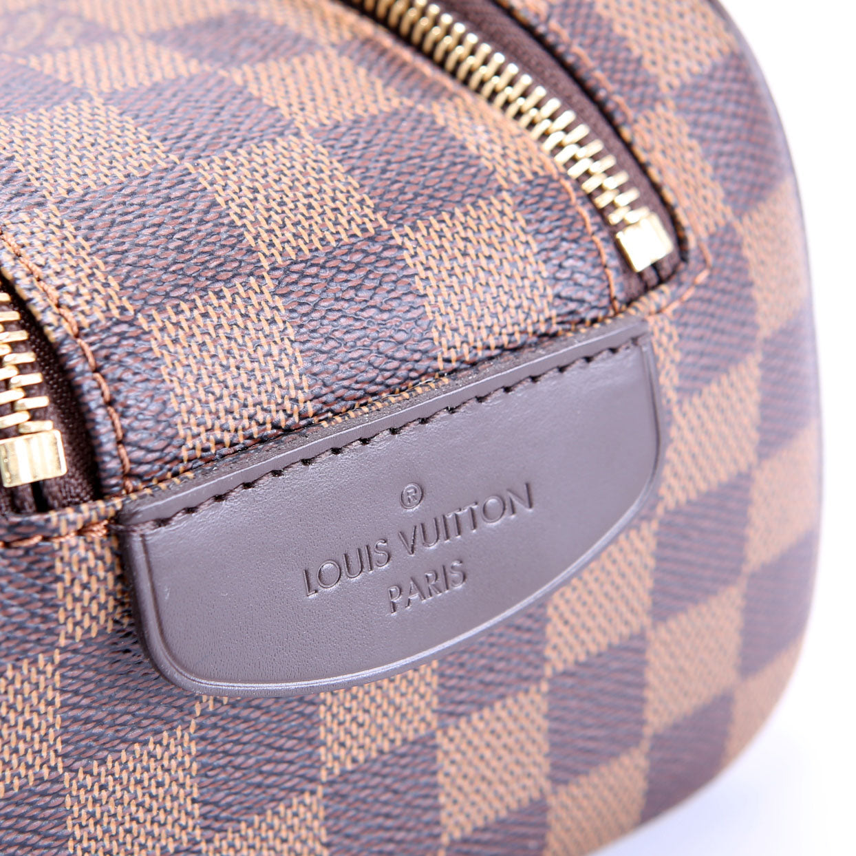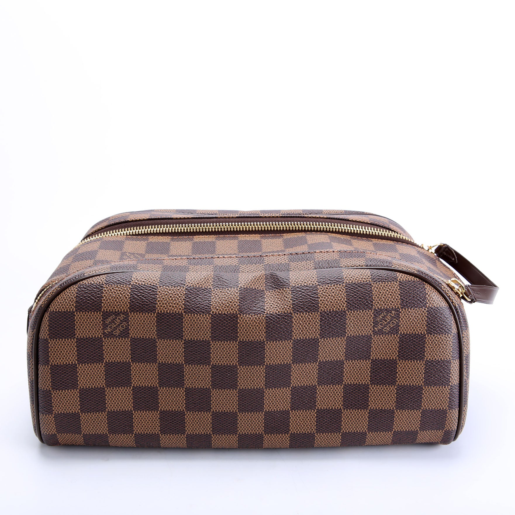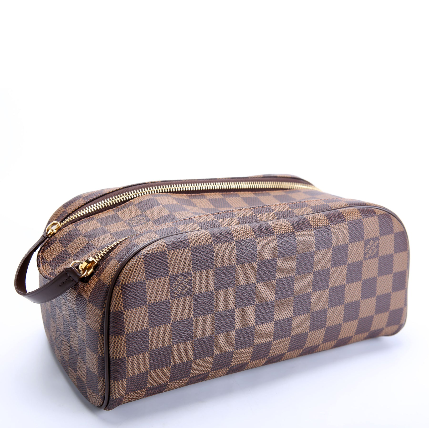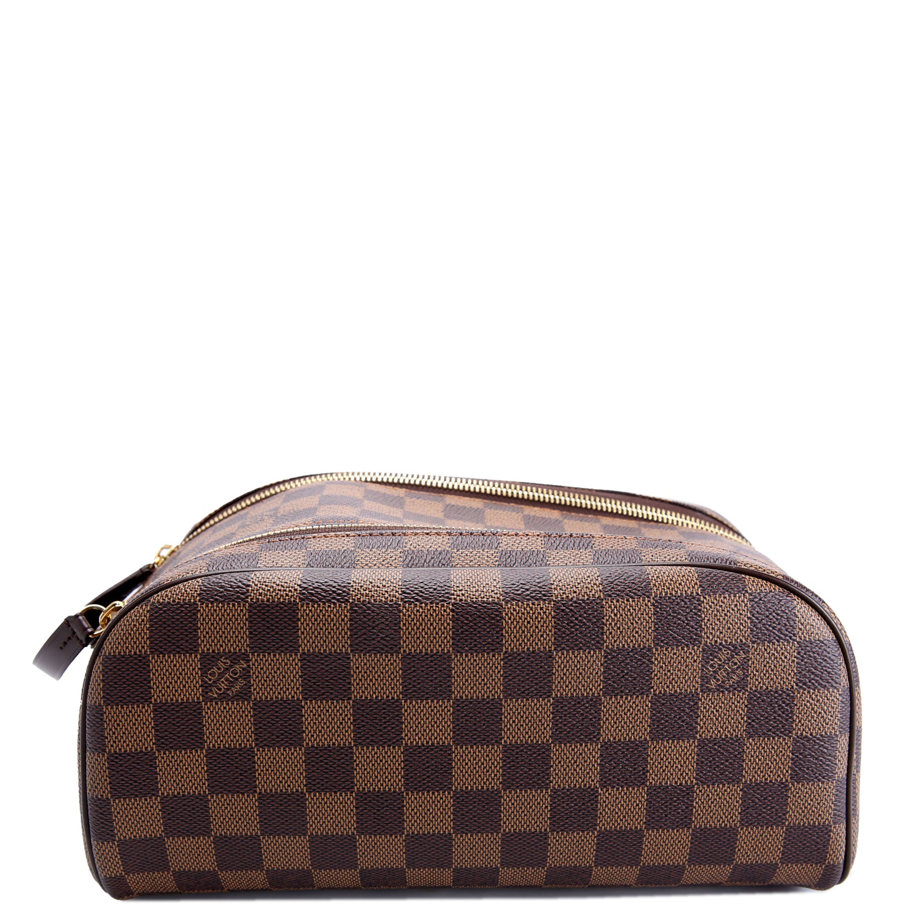 This pre-owned Louis Vuitton Dopp Kit Toilet Pouch is guaranteed 100% authentic. The exterior is in the classic Louis Vuitton Coated Canvas Damier Ebene