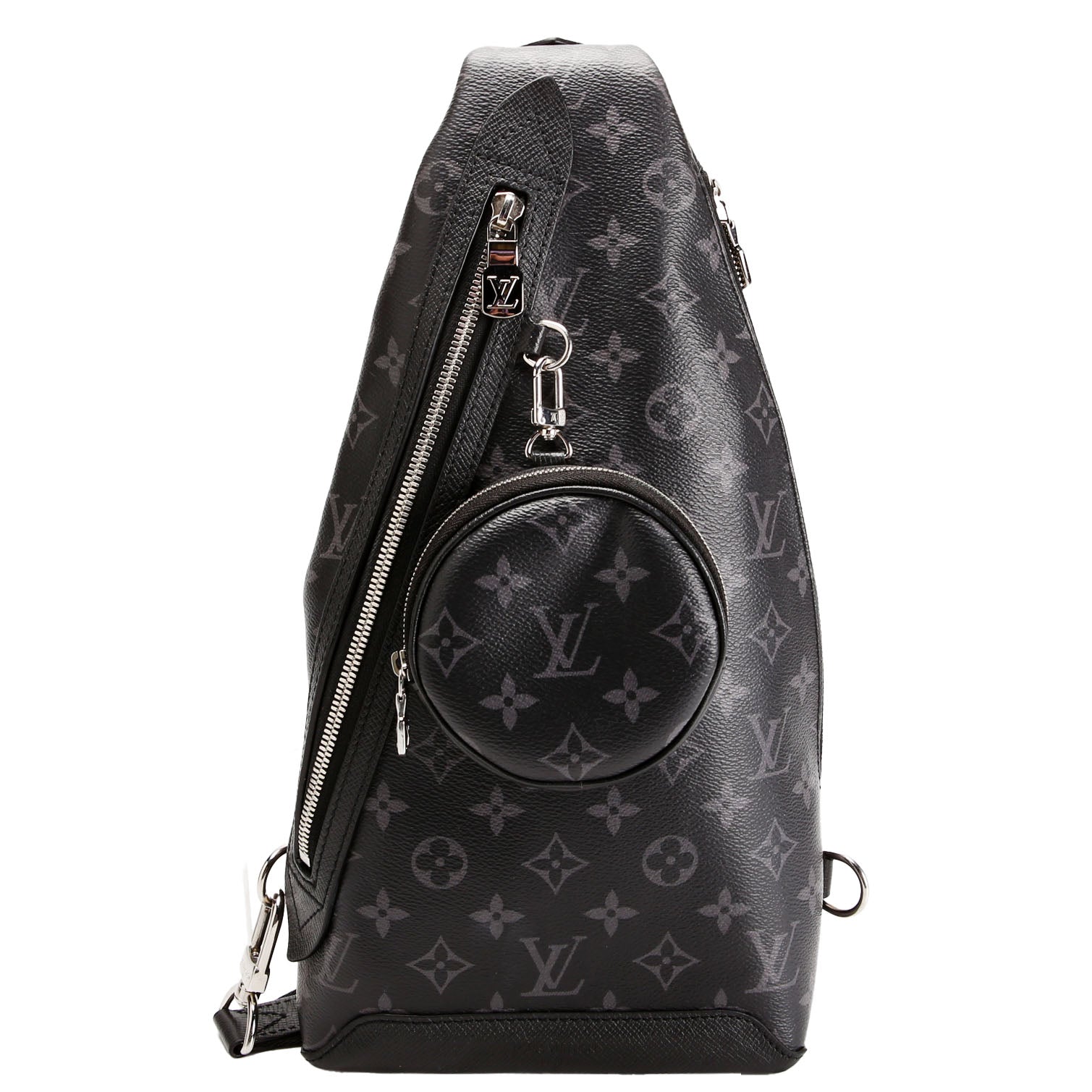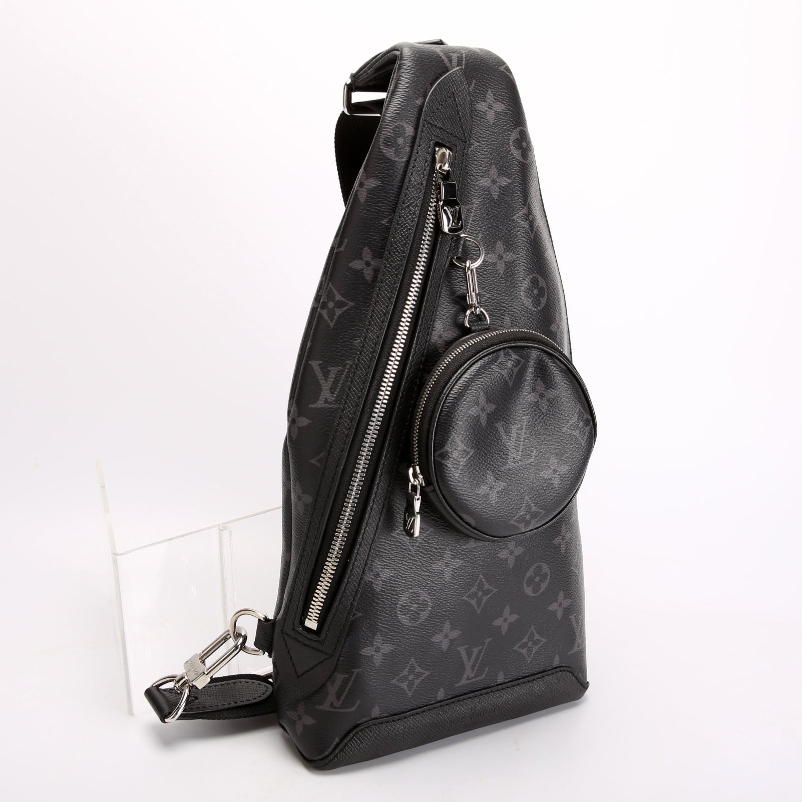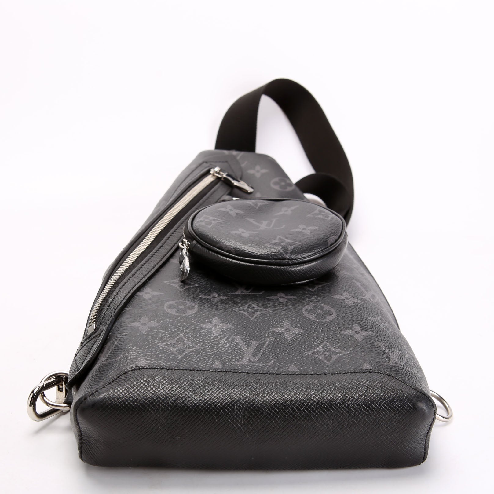 This pre-owned Louis Vuitton Duo Slingbag Monogram Eclipse is guaranteed 100% authentic. The exterior is in the classic Louis Vuitton Monogram coated canvas.